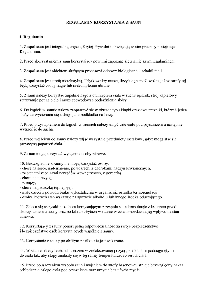 REGULAMIN KORZYSTANIA Z SAUN I. Regulamin 1. Zespół saun jest integralną częścią Krytej Pływalni i obwiązują w nim przepisy niniejszego Regulaminu. 2. Przed skorzystaniem z saun korzystający powinni zapoznać się z niniejszym regulaminem. 3. Zespół saun jest obiektem służącym procesowi odnowy biologicznej i rehabilitacji. 4. Zespół saun jest strefą nietekstylną. Użytkownicy muszą liczyć się z możliwością, iż ze strefy tej będą korzystać osoby nagie lub niekompletnie ubrane. 5. Z saun należy korzystać zupełnie nago z owinięciem ciała w suchy ręcznik, strój kąpielowy zatrzymuje pot na ciele i może spowodować podrażnienia skóry. 6. Do kąpieli w saunie należy zaopatrzyć się w obuwie typu klapki oraz dwa ręczniki, których jeden służy do wycierania się a drugi jako podkładka na ławę. 7. Przed przystąpieniem do kąpieli w saunach należy umyć całe ciało pod prysznicem a następnie wytrzeć je do sucha. 8. Przed wejściem do sauny należy zdjąć wszystkie przedmioty metalowe, gdyż mogą stać się przyczyną poparzeń ciała. 9. Z saun mogą korzystać wyłącznie osoby zdrowe. 10. Bezwzględnie z sauny nie mogą korzystać osoby: - chore na serce, nadciśnienie, po udarach, z chorobami naczyń krwionośnych, - ze stanami zapalnymi narządów wewnętrznych, z gorączką, - chore na tarczycę, - w ciąży, - chore na padaczkę (epilepsję), - małe dzieci z powodu braku wykształcenia w organizmie ośrodka termoregulacji, - osoby, których stan wskazuje na spożycie alkoholu lub innego środka odurzającego. 11. Zaleca się wszystkim osobom korzystającym z zespołu saun konsultacje z lekarzem przed skorzystaniem z sauny oraz po kilku pobytach w saunie w celu sprawdzenia jej wpływu na stan zdrowia. 12. Korzystający z sauny ponosi pełną odpowiedzialność za swoje bezpieczeństwo i bezpieczeństwo osób korzystających wspólnie z sauny. 13. Korzystanie z sauny po obfitym posiłku nie jest wskazane. 14. W saunie należy leżeć lub siedzieć w zrelaksowanej pozycji, z kolanami podciągniętymi do ciała tak, aby stopy znalazły się w tej samej temperaturze, co reszta ciała. 15. Przed opuszczeniem zespołu saun i wyjściem do strefy basenowej istnieje bezwzględny nakaz schłodzenia całego ciała pod prysznicem oraz umycia bez użycia mydła. 16. Po saunie należy wypocząć około 20 - 30 minut. Celowe jest picie wód mineralnych lub soków w umiarkowanych ilościach (około 0,5 – 1 l.). 17. Po pobycie w saunie kategorycznie nie zaleca się wysiłku fizycznego. 18. W razie złego samopoczucia w saunie należy bezzwłocznie opuścić kabinę lub nacisnąć przycisk alarmowy, dzięki któremu ratownicy udzielą pomocy. 19. Z sauny można korzystać tylko w towarzystwie innej osoby, co pozwoli na natychmiastową pomoc w wypadku złego samopoczucia. 20. Osoby niepełnoletnie mogą korzystać z sauny tylko i włącznie w towarzystwie dorosłego opiekuna. 21. Zabrania się regulacji urządzeń saun, w szczególności regulacji nagrzewania pieca. Ewentualne uwagi dotyczące pracy saun należy zgłaszać recepcji. 22. Ośrodek nie ponosi odpowiedzialności za wszelkie zdarzenia powstałe na skutek złamania zasad niniejszego Regulaminu. II. Instrukcja korzystania z sauny suchej Temperatura 40 – 110oC 1. Kąpiel w saunie polega na naprzemiennym przegrzewaniu i ochładzaniu całego ciała. 2. Można to robić w 2 lub 3 następujących po sobie cyklach. 3. W saunie przebywa się w pozycji leżącej lub siedzącej. 4. Jeden cykl trwa max. do 25 minut tzn. 8-12 min. pobyt w gorącym pomieszczeniu sauny, a następnie 8-12 min. ochładzanie ciała. 5. Ochładzanie organizmu pod prysznicem polega na polewaniu zimną wodą całego ciała od stóp w kierunku serca, a następnie ochładzaniu karku oraz głowy. 6. Po schłodzeniu ciała należy wytrzeć się do sucha i poleżeć kilka minut. 7. Pobyt w saunie kończy się chłodną kąpielą bez stosowania mydła. 8. W przypadku wystąpienia złego samopoczucia trzeba bezwzględnie przerwać zabieg. III. Instrukcja korzystania z łaźni parowej Temperatura 40 – 50oC 1. Kąpiel w łaźni polega na naprzemiennym przegrzewaniu i chładzaniu całego ciała. 2. W łaźni przebywa się w pozycji siedzącej. 3. Czas przebywania w łaźni zależy indywidualnie od samopoczucia oraz stażu korzystania z łaźni (sugerowany czas ok. 10-20 minut). 4. Ochładzanie organizmu pod prysznicem polega na polewaniu zimną wodą całego ciała od stóp w kierunku serca, a następnie ochładzaniu karku oraz głowy. 5. Cykl nagrzewania ciała i schładzania może być powtórzony 3 – krotnie. 6. Po schłodzeniu ciała należy wytrzeć się do sucha i poleżeć kilka minut. 7. Pobyt w łaźni kończy się chłodną kąpielą bez stosowania mydła. 8. W przypadku wystąpienia złego samopoczucia trzeba bezwzględnie przerwać zabieg. UWAGA: KORZYSTANIE Z SAUN NA WŁASNĄ ODPOWIEDZIALNOŚĆ DYREKTOR MOSiR Janusz Urbański