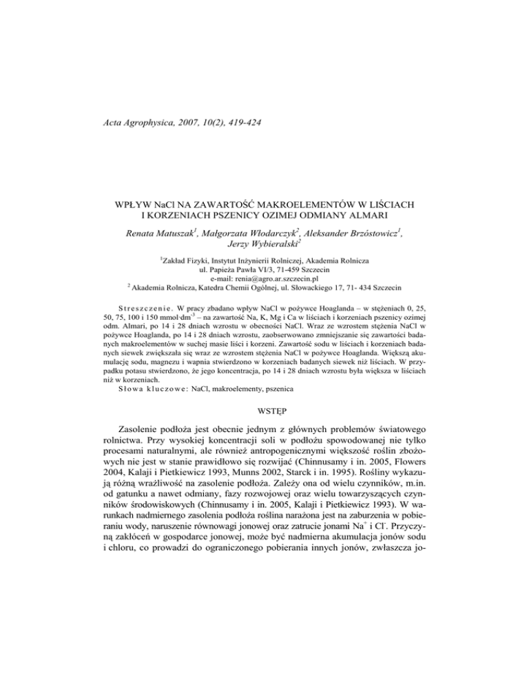 Acta Agrophysica, 2007, 10(2), 419-424 WPŁYW NaCl NA ZAWARTOŚĆ MAKROELEMENTÓW W LIŚCIACH I KORZENIACH PSZENICY OZIMEJ ODMIANY ALMARI Renata Matuszak1, Małgorzata Włodarczyk2, Aleksander Brzóstowicz1, Jerzy Wybieralski2 1 Zakład Fizyki, Instytut InŜynierii Rolniczej, Akademia Rolnicza ul. PapieŜa Pawła VI/3, 71-459 Szczecin e-mail: [email protected] 2 Akademia Rolnicza, Katedra Chemii Ogólnej, ul. Słowackiego 17, 71- 434 Szczecin S t r e s z c z e n i e . W pracy zbadano wpływ NaCl w poŜywce Hoaglanda – w stęŜeniach 0, 25, 50, 75, 100 i 150 mmol·dm-3 – na zawartość Na, K, Mg i Ca w liściach i korzeniach pszenicy ozimej odm. Almari, po 14 i 28 dniach wzrostu w obecności NaCl. Wraz ze wzrostem stęŜenia NaCl w poŜywce Hoaglanda, po 14 i 28 dniach wzrostu, zaobserwowano zmniejszanie się zawartości badanych makroelementów w suchej masie liści i korzeni. Zawartość sodu w liściach i korzeniach badanych siewek zwiększała się wraz ze wzrostem stęŜenia NaCl w poŜywce Hoaglanda. Większą akumulację sodu, magnezu i wapnia stwierdzono w korzeniach badanych siewek niŜ liściach. W przypadku potasu stwierdzono, Ŝe jego koncentracja, po 14 i 28 dniach wzrostu była większa w liściach niŜ w korzeniach. S ł o w a k l u c z o w e : NaCl, makroelementy, pszenica WSTĘP Zasolenie podłoŜa jest obecnie jednym z głównych problemów światowego rolnictwa. Przy wysokiej koncentracji soli w podłoŜu spowodowanej nie tylko procesami naturalnymi, ale równieŜ antropogenicznymi większość roślin zboŜowych nie jest w stanie prawidłowo się rozwijać (Chinnusamy i in. 2005, Flowers 2004, Kalaji i Pietkiewicz 1993, Munns 2002, Starck i in. 1995). Rośliny wykazują róŜną wraŜliwość na zasolenie podłoŜa. ZaleŜy ona od wielu czynników, m.in. od gatunku a nawet odmiany, fazy rozwojowej oraz wielu towarzyszących czynników środowiskowych (Chinnusamy i in. 2005, Kalaji i Pietkiewicz 1993). W warunkach nadmiernego zasolenia podłoŜa roślina naraŜona jest na zaburzenia w pobieraniu wody, naruszenie równowagi jonowej oraz zatrucie jonami Na+ i Cl-. Przyczyną zakłóceń w gospodarce jonowej, moŜe być nadmierna akumulacja jonów sodu i chloru, co prowadzi do ograniczonego pobierania innych jonów, zwłaszcza jo- 420 R. MATUSZAK i in. nów potasu oraz kationów dwuwartościowych, głównie wapnia (Kacperska 2002, Ramoliya i in. 2004, Starck i in. 1995). Wcześniejsze badania dotyczące wpływu NaCl na wzrost i mrozoodporność siewek pszenicy ozimej odm. Almari wykazały, Ŝe niewielkie stęŜenia NaCl stymulują jej wzrost. Ponadto uzyskane wartości parametrów luminescencyjnych wskazały, Ŝe transport elektronowy w fotosystemie II pod wpływem NaCl staje się mniej wraŜliwy na niską temperaturę. MoŜe to sugerować wzrost termostabilności błon tylakoidalnych pod wpływem NaCl (Matuszak i Brzóstowicz 2003). Ponadto rośliny pochodzące z zasolonego podłoŜa mają na ogół bardzo niski potencjał osmotyczny soku komórkowego zarówno na skutek akumulacji jonów jak i aktywnej osmoregulacji. Wzajemne stosunki ilościowe poszczególnych jonów w roztworze mają duŜe znaczenie dla ich pobierania. Wpływ ten nie dotyczy jedynie interakcji tylko pomiędzy jonami obdarzonymi tym samym ładunkiem, lecz równieŜ między jonami dodatnimi i ujemnymi. W związku z tym podjęto badania, których celem było określenie wpływu róŜnych stęŜeń NaCl w poŜywce Hoaglanda na zawartość makroelementów w liściach i korzeniach siewek pszenicy ozimej odm. Almari, po 14 i 28 dniach wzrostu. MATERIAŁ I METODY Badania prowadzono na siewkach pszenicy ozimej odm. Almari. Doświadczenie prowadzono w kulturach wodnych. Roztwory NaCl rozcieńczono w proporcji 1:1 z poŜywką Hoaglanda tak, aby końcowe stęŜenie soli wynosiło odpowiednio: 25, 50, 75, 100 i 150 mmol⋅dm-3. Obiekt kontrolny stanowił roztwór poŜywki Hoaglanda i wody destylowanej w stosunku 1:1. Ziarniaki pszenicy rozłoŜono w kiełkownikach „Szmala” (Kospin, Poddębice), następnie zalano roztworami NaCl. Tak przygotowany materiał umieszczano w minifitotronie, w kontrolowanych warunkach (temperatura 20ºC, oświetlenie 200 µmol fotonów·m-2⋅s-1 w zakresie PAR, fotoperiod 12h/12h dzień/noc). Od trzeciego dnia doświadczenia stopniowo obniŜano temperaturę do +10ºC w tempie 2ºC/dobę. W tych warunkach siewki pszenicy wyrastały przez 28 dni. Pomiar zawartości makroskładników wykonano w liściach i korzeniach siewek pszenicy Almari po 14 i 28 dniach wzrostu. Oznaczono zawartość wybranych pierwiastków mineralnych: Na, K, Mg i Ca, metodą absorpcyjnej spektrometrii atomowej (ASA), po wcześniejszym ich zmineralizowaniu w stęŜonym HNO3. Uzyskane rezultaty opracowano statystycznie przy pomocy programu Statistica, wersja 7.0. Na postawie 2-czynnikowej analizy wariancji (organ wegetatywny, stęŜenie NaCl) wyseparowano grupy jednorodne za pomocą testu Tukeya. WPŁYW NaCl NA ZAWARTOŚĆ MAKROELEMENTÓW W LIŚCIACH 421 WYNIKI I DYSKUSJA Przeprowadzone w niniejszej pracy badania dotyczące wpływu NaCl na zawartość w siewkach pszenicy badanych pierwiastków wskazują na występowanie róŜnic w ich akumulacji w tkankach liści oraz korzeni siewek rosnących na poŜywce o róŜnych stęŜeniach NaCl w porównaniu z roślinami kontrolnymi. Wzrastające stęŜenie soli w poŜywce spowodowało wielokrotny wzrost akumulacji sodu, w suchej masie liści i korzeni badanych roślin, po 14 i 28 dniach wzrostu (tab. 1 i 2). Siewki pszenicy rosnące w obecności NaCl charakteryzowały się statystycznie istotnie większą zawartością sodu w liściach i korzeniach niŜ rośliny kontrolne. W korzeniach siewek pszenicy rosnących na poŜywce o róŜnych stęŜeniach NaCl oraz roztworze kontrolnym stwierdzono istotnie większą zawartość sodu niŜ w liściach, tak po 14 jak i po 28 dniach wzrostu. Tolerancja soli u glikofitów jest związana ze zdolnością do ograniczonego pobierania ora