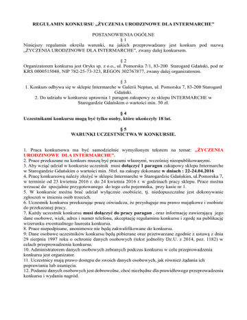 REGULAMIN KONKURSU „ŻYCZENIA URODZINOWE DLA INTERMARCHE” POSTANOWIENIA OGÓLNE §1 Niniejszy regulamin określa warunki, na jakich przeprowadzany jest konkurs pod nazwą „ŻYCZENIA URODZINOWE DLA INTERMARCHE”, zwany dalej konkursem. §2 Organizatorem konkursu jest Oryks sp. z o.o., ul. Pomorska 7/1, 83-200 Starogard Gdański, pod nr KRS 0000515048, NIP 782-25-73-323, REGON 302767877, zwany dalej organizatorem. §3 1. Konkurs odbywa się w sklepie Intermarche w Galerii Neptun, ul. Pomorska 7, 83-200 Starogard Gdański. 2. Do udziału w konkursie uprawnia 1 paragon zakupowy ze sklepu INTERMARCHE w Starogardzie Gdańskim o wartości min. 50 zł. §4 Uczestnikami konkursu mogą być tylko osoby, które ukończyły 18 lat. §5 WARUNKI UCZESTNICTWA W KONKURSIE. 1. Praca konkursowa ma być samodzielnie wymyślonym tekstem na temat: „ŻYCZENIA URODZINOWE DLA INTERMARCHE”. 2. Prace przekazane na konkurs muszą być pracami własnymi, wcześniej nieopublikowanymi. 3. Aby wziąć udział w konkursie uczestnik musi dołączyć 1 paragon zakupowy sklepu Intermarche w Starogardzie Gdańskim o wartości min. 50zł. na zakupy dokonane w dniach : 22-24.04.2016 4. Pracę konkursową należy złożyć w sklepie Intermarche w Starogardzie Gdańskim, ul.Pomorska 7, w terminie od 23 kwietnia 2016 r. do 24 kwietnia 2016 r. w godzinach pracy sklepu. Prace można wrzucać do specjalnie przygotowanego do tego celu pojemnika, przy kasie nr 1. 5. W konkursie można brać udział wyłącznie osobiście, tj. niedopuszczalne jest dokonywanie zgłoszeń w imieniu osób trzecich. 6. Uczestnik konkursu przekazując pracę oświadcza, że przysługuje mu prawo majątkowe i osobiste do przekazanej pracy. 7. Każdy uczestnik konkursu musi dołączyć do pracy paragon , oraz informację zawierającą jego dane osobowe, wiek, adres i numer telefonu, akceptację regulaminu konkursu i zgodę na publikację wizerunku ewentualnego laureata konkursu. 8. Prace niepodpisane, anonimowe nie będą zakwalifikowane do konkursu. 9. Dane osobowe uczestników konkursu będą pobierane oraz przetwarzane zgodnie z ustawą z dnia 29 sierpnia 1997 roku o ochronie danych osobowych (tekst jednolity Dz.U. z 2014, poz. 1182) w celach przeprowadzenia konkursu. 10. Administratorem danych osobowych zebranych podczas konkursu w celu przeprowadzenia konkursu jest organizator. 11. Uczestnicy mają prawo dostępu do swoich danych osobowych, jak również żądania ich poprawiania lub usunięcia. 12. Podanie danych osobowych jest dobrowolne, choć niezbędne dla prawidłowego przeprowadzenia konkursu i wydania nagród. § 6 WYNIKI KONKURSU 1. Jury powołane przez organizatora spośród przekazanych prac wyłoni 2 laureatów konkursu oraz 2 laureatów rezerwowych . 2. Kryteria oceny prac: zgodność z tematyką i oryginalność. 3. Decyzja jury co do wskazania laureatów konkursu oraz przyznania im nagród jest ostateczna. 4. Ogłoszenie wyników konkursu nastąpi podczas podsumowania konkursu w dniu 30 kwietnia 2016 r. o godz. 17.30 koło karuzeli przed sklepem INTERMARCHE w Galerii Neptun. 5. Jeśli laureat konkursu będzie nieobecny podczas podsumowania konkursu, nagroda przechodzi na laureata rezerwowego w kolejności nazwisk na liście laureatów rezerwowych. 6. Skład jury : Anna Najda, Monika Macugowska, Marek Izdebski §7 NAGRODY 1. W konkursie zostaną przyznane następujące nagrody: I miejsce: MULTI COOKER o wartości 265 zł, firmy „Kalorik” – urządzenie wielofunkcyjne – do gotowania, zapiekania, odgrzewania, gotowania na parze. II miejsce : ceramiczna Patelnia Elektryczna firmy „Clatronic” o wartości 99 zł, urządzenie do pieczenia, duszenia, rozmrażania. 3. Nagrody rzeczowe nie podlegają zamianie na inne nagrody rzeczowe, ani na ich równowartość pieniężną. 4. Nieodebranie nagród dnia 30 kwietnia 2016 roku podczas podsumowania konkursu o godz. 17.30 przed sklepem Intermarche w Galerii Neptun jest równoznaczne z utratą prawa do nagrody. 5. Nieodebrane nagrody pozostają do dyspozycji organizatora. §8 POSTANOWIENIA KOŃCOWE 1. Przekazując pracę na konkurs, uczestnik zgadza się na udostepnienie pracy na portalach społecznościowych, w mediach lokalnych oraz w materiałach promocyjnych organizatora konkursu i w samym sklepie INTERMARCHE w Starogardzie Gdańskim. 2. Biorąc udział w konkursie, uczestnik akceptuje powyższy regulamin. 3. Regulamin niniejszego konkursu będzie dostępny na stronie www.galeria-neptun.eu oraz w sklepie INTERMARCHE w Starogardzie Gdańskim ( kasa nr 1 )