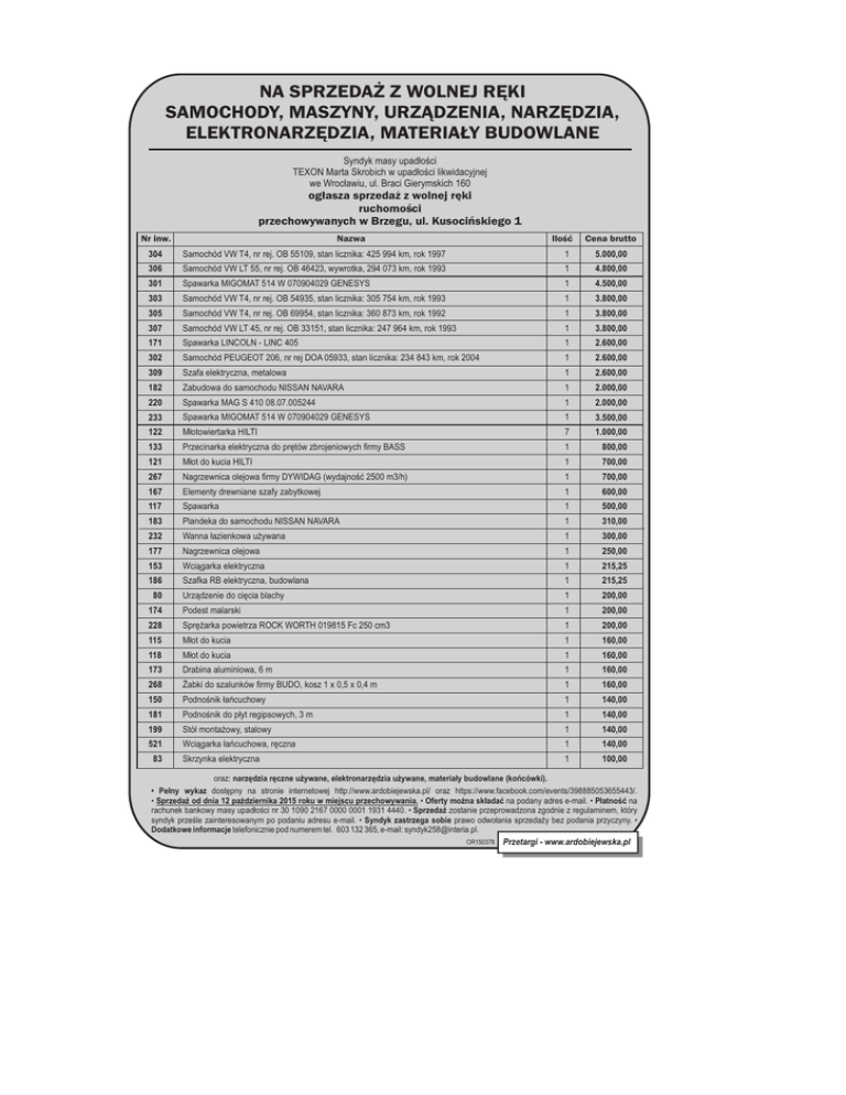 NA SPRZEDA¯ Z WOLNEJ RÊKI SAMOCHODY, MASZYNY, URZ¥DZENIA, NARZÊDZIA, ELEKTRONARZÊDZIA, MATERIA£Y BUDOWLANE Syndyk masy upad³oœci TEXON Marta Skrobich w upad³oœci likwidacyjnej we Wroc³awiu, ul. Braci Gierymskich 160 og³asza sprzeda¿ z wolnej rêki ruchomoœci przechowywanych w Brzegu, ul. Kusociñskiego 1 Nr inw. Nazwa Iloœæ Cena brutto 304 Samochód VW T4, nr rej. OB 55109, stan licznika: 425 994 km, rok 1997 1 5.000,00 306 Samochód VW LT 55, nr rej. OB 46423, wywrotka, 294 073 km, rok 1993 1 4.800,00 301 Spawarka MIGOMAT 514 W 070904029 GENESYS 1 4.500,00 303 Samochód VW T4, nr rej. OB 54935, stan licznika: 305 754 km, rok 1993 1 3.800,00 305 Samochód VW T4, nr rej. OB 69954, stan licznika: 360 873 km, rok 1992 1 3.800,00 307 Samochód VW LT 45, nr rej. OB 33151, stan licznika: 247 964 km, rok 1993 1 3.800,00 171 Spawarka LINCOLN - LINC 405 1 2.600,00 302 Samochód PEUGEOT 206, nr rej DOA 05933, stan licznika: 234 843 km, rok 2004 1 2.600,00 309 Szafa elektryczna, metalowa 1 2.600,00 182 Zabudowa do samochodu NISSAN NAVARA 1 2.000,00 220 Spawarka MAG S 410 08.07.005244 1 2.000,00 233 Spawarka MIGOMAT 514 W 070904029 GENESYS 1 3.500,00 122 M³otowiertarka HILTI 7 1.000,00 133 Przecinarka elektryczna do prêtów zbrojeniowych firmy BASS 1 800,00 121 M³ot do kucia HILTI 1 700,00 267 Nagrzewnica olejowa firmy DYWIDAG (wydajnoœæ 2500 m3/h) 1 700,00 167 Elementy drewniane szafy zabytkowej 1 600,00 117 Spawarka 1 500,00 183 Plandeka do samochodu NISSAN NAVARA 1 310,00 232 Wanna ³azienkowa u¿ywana 1 300,00 177 Nagrzewnica olejowa 1 250,00 153 Wci¹garka elektryczna 1 215,25 186 Szafka RB elektryczna, budowlana 1 215,25 Urz¹dzenie do ciêcia blachy 1 200,00 174 Podest malarski 1 200,00 228 Sprê¿arka powietrza ROCK WORTH 019815 Fc 250 cm3 1 200,00 115 M³ot do kucia 1 160,00 118 M³ot do kucia 1 160,00 173 Drabina aluminiowa, 6 m 1 160,00 268 ¯abki do szalunków firmy BUDO, kosz 1 x 0,5 x 0,4 m 1 160,00 150 Podnoœnik ³añcuchowy 1 140,00 181 Podnoœnik do p³yt regipsowych, 3 m 1 140,00 199 Stó³ monta¿owy, stalowy 1 140,00 521 Wci¹garka ³añcuchowa, rêczna 1 140,00 Skrzynka elektryczna 1 100,00 80 83 oraz: narzêdzia rêczne u¿ywane, elektronarzêdzia u¿ywane, materia³y budowlane (koñcówki). • Pe³ny wykaz dostêpny na stronie internetowej http://www.ardobiejewska.pl/ oraz https://www.facebook.com/events/398885053655443/. • Sprzeda¿ od dnia 12 paŸdziernika 2015 roku w miejscu przechowywania. • Oferty mo¿na sk³adaæ na podany adres e-mail. • P³atnoœæ na rachunek bankowy masy upad³oœci nr 30 1090 2167 0000 0001 1931 4440. • Sprzeda¿ zostanie przeprowadzona zgodnie z regulaminem, który syndyk przeœle zainteresowanym po podaniu adresu e-mail. • Syndyk zastrzega sobie prawo odwo³ania sprzeda¿y bez podania przyczyny. • Dodatkowe informacje telefonicznie pod numerem tel. 603 132 365, e-mail: [email protected]. OR150378 Przetargi - www.ardobiejewska.pl