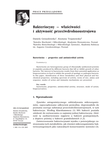 PRACE PRZEGL¥DOWE Bakteriocyny – w³aœciwoœci i aktywnoœæ przeciwdrobnoustrojowa Daniela Gwiazdowska1, Krystyna Trojanowska2 1Katedra Biochemii i Mikrobiologii, Akademia Ekonomiczna, Poznañ Biotechnologii i Mikrobiologii ¯ywnoœci, Akademia Rolnicza im. Augusta Cieszkowskiego, Poznañ 2Katedra Bacteriocins – properties and antimicrobial activity Summary Bacteriocins are heterogeneous group of ribosomally synthesized proteins or peptides produced by different bacteria that kill or inhibit growth of other bacteria. The interest in bacteriocins results from their potential application as biopreservatives in food to inhibit the growth of spoilage or pathogen bacteria. In this paper, identification of these metabolites and their physical and biochemical properties, including spectrum of activity, terms of size, amino acid sequence, modes of action and immunity mechanisms are presented. Key words: bacteriocins, properties, antimicrobial activity, structure, mode of action, biopreservatives. 1. Wprowadzenie Adres do korespondencji Daniela Gwiazdowska, Katedra Biochemii i Mikrobiologii, Akademia Ekonomiczna, al. Niepodleg³oœci 10, 60-967 Poznañ. 1 (68) 114–130 2005 Zjawisko antagonistycznego oddzia³ywania mikroorganizmów, zapocz¹tkowane odkryciem penicyliny, doprowadzi³o do poznania szeregu substancji przeciwdrobnoustrojowych, w tym bakteriocyn. Wed³ug Klaenhammera (1) 99% bakterii posiada zdolnoœæ do wytwarzania co najmniej jednej bakteriocyny. Zdolnoœæ tê zaobserwowano najpierw u bakterii gramujemnych, a dopiero póŸniej u bakterii gramdodatnich (1,2). Zainteresowanie bakteriocynami wynika z potencjalnego zastosowania tych metabolitów, jak równie¿ mikroorganizmów bakteriocynogennych jako naturalnych konserwantów ¿ywnoœci (3). Bakteriocyny – w³aœciwoœci i aktywnoœæ przeciwdrobnoustrojowa Na podstawie dokonanej izolacji bakteriocyn z ¿ywnoœci dowodzi siê, ¿e wraz z ró¿norodnymi produktami, cz³owiek spo¿ywa je nieœwiadomie od lat, a co za tym idzie, s¹ to bezpieczne, nietoksyczne zwi¹zki, równie efektywne jak substancje chemiczne (4). Bakteriocyny to bia³kowe metabolity wytwarzane przez bakterie gramdodatnie i gramujemne wykazuj¹ce dzia³anie przeciwdrobnoustrojowe. Pod wzglêdem funkcjonalnym nale¿¹ do grupy zwi¹zków antymikrobiologicznych, do których zaliczane s¹ tioniny, wytwarzane przez roœliny (5) oraz produkowane przez zwierzêta defensyny, magaininy i cekropiny (6). Zwi¹zki te wykazuj¹ liczne podobieñstwa strukturalne do bakteriocyn, takie jak: niska masa cz¹steczkowa, termostabilnoœæ i hydrofobowoœæ. Bakteriocyny stanowi¹ grupê zwi¹zków o zró¿nicowanych w³aœciwoœciach biochemicznych, masie cz¹steczkowej, mechanizmie dzia³ania, spektrum aktywnoœci oraz lokalizacji i sekwencji genu koduj¹cego aktywne bia³ko (7). Wed³ug definicji Tagga i in. (2) s¹ to substancje bakteriobójcze w stosunku do mikroorganizmów spokrewnionych z producentem okreœlonej bakteriocyny. Bli¿sza charakterystyka wielu bakteriocyn ujawni³a antybakteryjn¹ aktywnoœæ wobec mikroorganizmów nale¿¹cych do innych rodzajów ni¿ producent, w tym wobec organizmów patogennych jak Listeria monocytogenes, Staphylococcus aureus czy Clostridium spp. (8). W badaniach przeprowadzonych na poziomie molekularnym wykazano, ¿e bakteriocyny s¹ rybosomalnie syntetyzowanymi peptydami lub bia³kami (1), generalnie wydzielanymi na zewn¹trz komórki, chocia¿ czêœæ z nich mo¿e pozostaæ zwi¹zana z biomas¹ (7). Geny koduj¹ce zdolnoœæ do syntezy bakteriocyny zlokalizowane s¹ w DNA plazmidowym lub chromosomalnym (9). Mikroorganizmy wytwarzaj¹ce bakteriocyny wykazuj¹ jednoczeœnie na nie odpornoœæ. Wi¹¿e siê to z budow¹ wiêkszoœci operonów bakteriocyn, zawieraj¹cych geny koduj¹ce aktywne bia³ko, koduj¹ce odpornoœæ na nie, a tak¿e geny odpowiedzialne za transport bakteriocyny z komórki i niekiedy, geny koduj¹ce enzymy uczestnicz¹ce w potranslacyjnej modyfikacji bakteriocyn. Do najlepiej poznanych i najszerzej badanych bakteriocyn nale¿¹ bakteriocyny syntetyzowane przez bakterie fermentacji mlekowej. A¿ do odkrycia pierwszej bakteriocyny – nizyny, syntetyzowanej przez Lactococcus lactis, antybakteryjne w³aœciwoœci bakterii mlekowych przypisywano ich zdolnoœci do produkcji kwasów organicznych i nadtlenku wodoru (4). Rozwój badañ doprowadzi³ w ostatnich latach do poznania nowych bakteriocyn, wytwarzanych tak¿e przez inne rodzaje bakterii. Wiele prac dotyczy struktury cz¹steczki, sekwencji nukleotydowej genu oraz mechanizmu dzia³ania bakteriocyn. Uwa¿a siê, ¿e idealna substancja antymikrobiologiczna, potencjalny biokonserwant ¿ywnoœci, powinna charakteryzowaæ siê szerokim zakresem aktywnoœci, obejmuj¹cym mikroorganizmy patogenne, w³aœciwoœciami fizykochemicznymi warunkuj¹cymi odpornoœæ na wysokie temperatury i zmiany pH oraz nisk¹ mas¹ cz¹steczkow¹, u³atwiaj¹c¹ dyfuzjê w produktach pó³p³ynnych (7). BIOTECHNOLOGIA 1 (68) 114-130 2005 115 Daniela Gwiazdowska, Krystyna Trojanowska Celem opracowania jest charakterystyka bakteriocyn z uwzglêdnieniem w³aœciwoœci maj¹cych najistotniejsze znaczenie dla ich praktycznego zastosowania. 2. Klasyfikacja bakteriocyn Klasyfikacja bakteriocyn opiera siê na zró¿nicowaniu struktury chemicznej, masy cz¹steczkowej, wra¿liwoœci na dzia³anie enzymów, obecnoœci modyfikowanych aminokwasów oraz mechanizmie dzia³ania. 2.1. Bakteriocyny bakterii gramdodatnich W klasyfikacji bakteriocyn bakterii gramdodatnich (tab. 1), zaproponowanej przez Klaenhammera (1) uwzglêdnia siê cztery g³ówne klasy, w obrêbie których tworzone s¹ podklasy: Tabela 1 Klasyfikacja bakteriocyn bakterii gramdodatnich (7,8,11) Klasa bakteriocyn Bakteriocyna Producent 1 2 3 I – lantybiotyki nizyna A nizyna Z subtilina epidermina gallidermina mutacyna B-Ny266 II – bakteriocyny nielantybiotykowe II a – bakteriocyny pediocynopodobne pediocyna AcH leukocyna A-UAL 187 mese