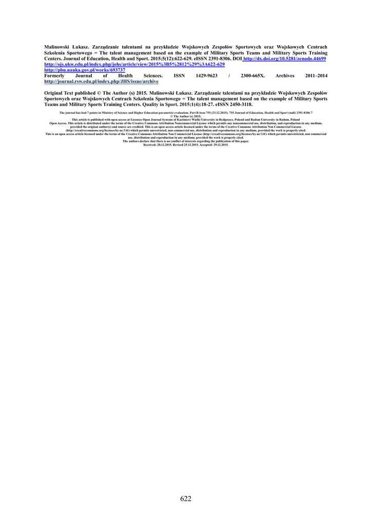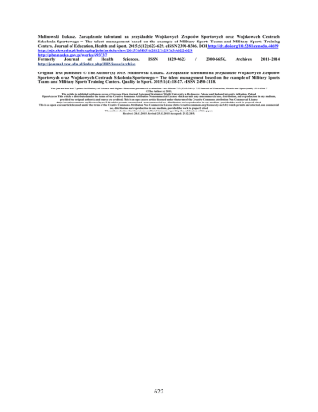 Malinowski Łukasz. Zarządzanie talentami na przykładzie Wojskowych Zespołów Sportowych oraz Wojskowych Centrach Szkolenia Sportowego = The talent management based on the example of Military Sports Teams and Military Sports Training Centers. Journal of Education, Health and Sport. 2015;5(12):622-629. eISSN 2391-8306. DOI http://dx.doi.org/10.5281/zenodo.44699 http://ojs.ukw.edu.pl/index.php/johs/article/view/2015%3B5%2812%29%3A622-629 http://pbn.nauka.gov.pl/works/693737 Formerly Journal of Health Sciences. ISSN 1429-9623 / 2300-665X. Archives 2011–2014 http://journal.rsw.edu.pl/index.php/JHS/issue/archive Original Text published © The Author (s) 2015. Malinowski Łukasz. Zarządzanie talentami na przykładzie Wojskowych Zespołów Sportowych oraz Wojskowych Centrach Szkolenia Sportowego = The talent management based on the example of Military Sports Teams and Military Sports Training Centers. Quality in Sport. 2015;1(4):18-27. eISSN 2450-3118. The journal has had 7 points in Ministry of Science and Higher Education parametric evaluation. Part B item 755 (23.12.2015). 755 Journal of Education, Health and Sport (null) 2391-8306 7 © The Author (s) 2015; This article is published with open access at Licensee Open Journal Systems of Kazimierz Wielki University in Bydgoszcz, Poland and Radom University in Radom, Poland Open Access. This article is distributed under the terms of the Creative Commons Attribution Noncommercial License which permits any noncommercial use, distribution, and reproduction in any medium, provided the original author(s) and source are credited. This is an open access article licensed under the terms of the Creative Commons Attribution Non Commercial License (http://creativecommons.org/licenses/by-nc/3.0/) which permits unrestricted, non commercial use, distribution and reproduction in any medium, provided the work is properly cited. This is an open access article licensed under the terms of the Creative Commons Attribution Non Commercial License (http://creativecommons.org/licenses/by-nc/3.0/) which permits unrestricted, non commercial use, distribution and reproduction in any medium, provided the work is properly cited. The authors declare that there is no conflict of interests regarding the publication of this paper. Received: 20.12.2015. Revised 25.12.2015. Accepted: 29.12.2015. 622 Łukasz Malinowski Akademia Wychowania Fizycznego i Sportu w Gdańsku Zarządzanie talentami na przykładzie Wojskowych Zespołów Sportowych oraz Wojskowych Centrach Szkolenia Sportowego The talent management based on the example of Military Sports Teams and Military Sports Training Centers Streszczenie Artykuł dotyczy problematyki pozyskiwania talentów dla Wojskowych Centrów Szkolenia Sportowego wraz z opisaniem wsparcia finansowego udzielanego przez Ministerstwo Sportu i Turystyki i ich działania oraz funkcjonowania w Polsce Wojskowych Zespołów Sportowych i ich osiągnięć. Słowa kluczowe: wojsko, sport, szkolenie, talent Abstract The article concerns the problems of sourcing talent for Military Sports Training Centers, describes the financial support provided by the Ministry of Sport and Tourism. It also describes the operation and achievements of Polish Military Sports Teams. Key words: army, military, sport, training, talent Wstęp W 2001 roku rozpoczął się proces zmian organizacyjnych w systemie funkcjonowania sportu wojskowego. W ramach kolejnych decyzji Ministra Obrony Narodowej określono funkcjonowanie Zespołów i Grup Sportowych Rodzajów Sił Zbrojnych mających na celu zachowanie niezbędnego potencjału sportowego Wojska Polskiego i realizację zadań w zakresie przygotowania do udziału we współzawodnictwie organizowanym pomiędzy armiami zrzeszonymi w Międzynarodowej Radzie Sportu Wojskowego. Metody i przedmiot badań W niniejszej pracy, za pomocą analizy dostępnych źródeł literaturowych i internetowych, wskazano główne zadania wojskowych grup sportowych oraz Wojskowych Centrów Szkolenia Sportowego, cel programu i sposób finansowania przez Ministra Sportu i Turystki oraz wyniki współzawodnictwa młodzieżowego dla wybranych wojskowych klubów sportowych. W wyniku analiz, głównie programów finansujących i decyzji MON, autor stwierdza, że szczególny nacisk położono na pozyskiwanie wybitnych zawodników w dyscyplinach sportowych przydatnych dla wojska, w czym głównie pomóc mają dofinansowania oraz odpowiednia baza szkoleniowa. W ramach niniejszego artykułu przyjmuje się, że talent to szczególne, naturalne zdolności, które pozwalają wykonywać niektóre czynności powyżej poziomu przeciętnego, umiejętne wykorzystywanie zdobytej wiedzy w praktyce, oraz wyróżniająca się wyższym niż przeciętny potencjałem do dalszego rozwoju. Sport jest wieloelementowym systemem, którego sprawność jako całości zależy od jakości części składowych oraz ich współdziałania. Jeśli w szkoleniu, które stanowi jeden z najważniejszych elementów systemu sportu, pracują trenerzy o odpowiednich kompetencjach (wiedza, umiejętności, ambicja), mający do swej dyspozycji odpowiednie warunki (infrastruktura w szerokim sensie tego słowa), ale zabraknie utalentowanych zawodników – efekty mogą być niezadawalające. W szerszej skali (np. w kraju) optymalna sytuacja występuje wtedy, gdy do systemu szkolenia trafiają jednostki prawdziwie utalentowane, jak najwcześniej i w jak największych ilościach, a ich szkoleniem zajmują się wysokiej klasy fachowcy. Brak odpowiedniej selekcji kandydatów do sportu wyczynowego czy błędy popełnione w jej trakcie powodują wymierne straty m.in. finansowe i czasowe, dlatego też identyfikacja i selekcja talentów do sportu wyczynowego jest tak ważnym elementem systemu szkolenia (Talent Sportowy 2008). 623 Talent sportowy nie sprowadza się do jakiejś jednej, wyjątkowo ważnej i silnie zaakcentowanej w naturze cechy, ale zależy od zespołu cech uwarunkowanych genetycznie i czynnikó