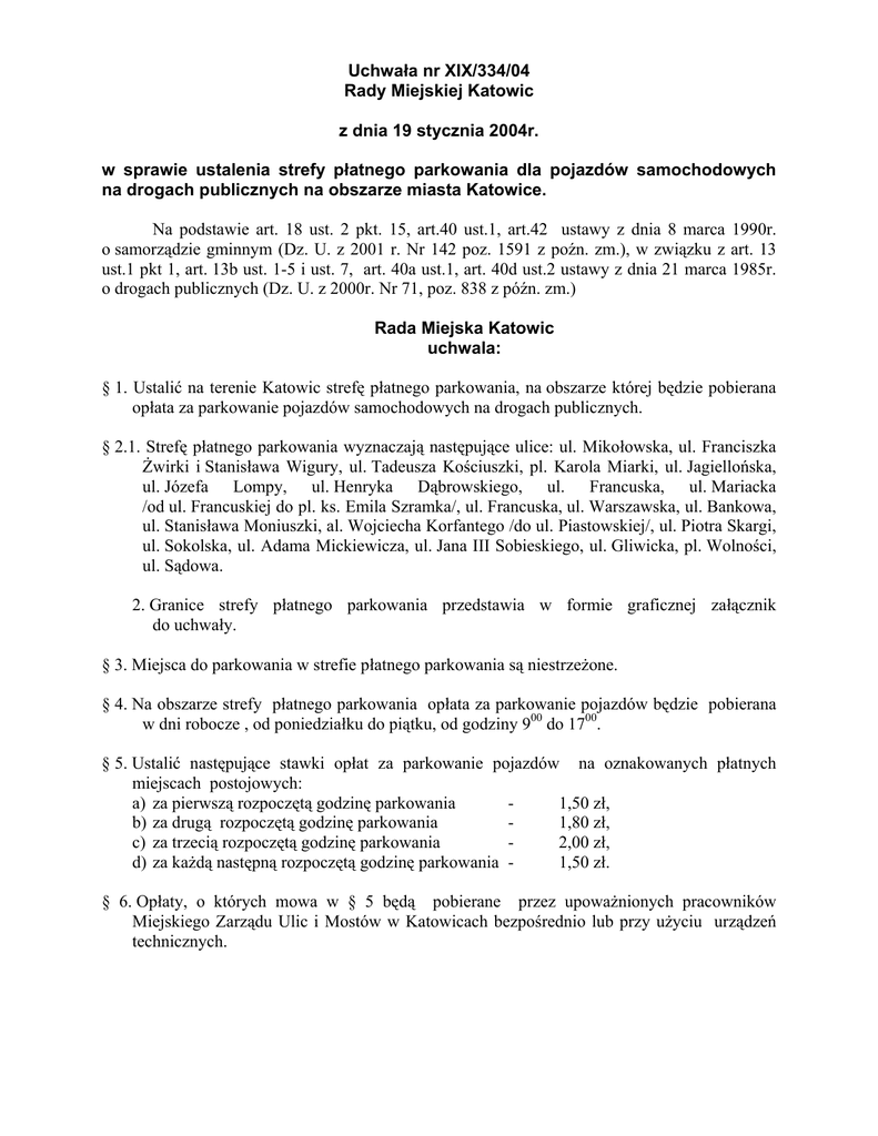 Uchwała nr XIX/334/04 Rady Miejskiej Katowic z dnia 19 stycznia 2004r. w sprawie ustalenia strefy płatnego parkowania dla pojazdów samochodowych na drogach publicznych na obszarze miasta Katowice. Na podstawie art. 18 ust. 2 pkt. 15, art.40 ust.1, art.42 ustawy z dnia 8 marca 1990r. o samorządzie gminnym (Dz. U. z 2001 r. Nr 142 poz. 1591 z poźn. zm.), w związku z art. 13 ust.1 pkt 1, art. 13b ust. 1-5 i ust. 7, art. 40a ust.1, art. 40d ust.2 ustawy z dnia 21 marca 1985r. o drogach publicznych (Dz. U. z 2000r. Nr 71, poz. 838 z późn. zm.) Rada Miejska Katowic uchwala: § 1. Ustalić na terenie Katowic strefę płatnego parkowania, na obszarze której będzie pobierana opłata za parkowanie pojazdów samochodowych na drogach publicznych. § 2.1. Strefę płatnego parkowania wyznaczają następujące ulice: ul. Mikołowska, ul. Franciszka Żwirki i Stanisława Wigury, ul. Tadeusza Kościuszki, pl. Karola Miarki, ul. Jagiellońska, ul. Józefa Lompy, ul. Henryka Dąbrowskiego, ul. Francuska, ul. Mariacka /od ul. Francuskiej do pl. ks. Emila Szramka/, ul. Francuska, ul. Warszawska, ul. Bankowa, ul. Stanisława Moniuszki, al. Wojciecha Korfantego /do ul. Piastowskiej/, ul. Piotra Skargi, ul. Sokolska, ul. Adama Mickiewicza, ul. Jana III Sobieskiego, ul. Gliwicka, pl. Wolności, ul. Sądowa. 2. Granice strefy płatnego parkowania przedstawia w formie graficznej załącznik do uchwały. § 3. Miejsca do parkowania w strefie płatnego parkowania są niestrzeżone. § 4. Na obszarze strefy płatnego parkowania opłata za parkowanie pojazdów będzie pobierana w dni robocze , od poniedziałku do piątku, od godziny 900 do 1700. § 5. Ustalić następujące stawki opłat za parkowanie pojazdów na oznakowanych płatnych miejscach postojowych: a) za pierwszą rozpoczętą godzinę parkowania 1,50 zł, b) za drugą rozpoczętą godzinę parkowania 1,80 zł, c) za trzecią rozpoczętą godzinę parkowania 2,00 zł, d) za każdą następną rozpoczętą godzinę parkowania 1,50 zł. § 6. Opłaty, o których mowa w § 5 będą pobierane przez upoważnionych pracowników Miejskiego Zarządu Ulic i Mostów w Katowicach bezpośrednio lub przy użyciu urządzeń technicznych. - 2 § 7. Opłata abonamentowa miesięczna za parkowanie na zastrzeżonym stanowisku postojowym (kopercie) w strefie płatnego parkowania wynosi 275,00 zł. § 8. Ustalić zerową stawkę opłat za korzystanie z wyznaczonych miejsc przeznaczonych dla pojazdów samochodowych uprawnionych osób niepełnosprawnych. § 9. Wprowadzić następujące opłaty abonamentowe: 1) w formie „karty mieszkańca” dla mieszkańców, 2) w formie „karty parkingowej” dla przedsiębiorców, § 10. „Karta mieszkańca”przysługuje właścicielom samochodów, którzy zamieszkują w strefie płatnego parkowania, dla każdego mieszkańca na jeden pojazd samochodowy i uprawnia do korzystania z oznaczonych miejsc postojowych. § 11. Wprowadzić następujące stawki opłat za korzystanie z „karty mieszkańca”: a) za jeden miesiąc 30,00 zł, b) za jeden kwartał 70,00 zł . § 12.1. „Karta parkingowa” dla przedsiębiorców przysługuje podmiotom, które prowadzą działalność gospodarczą w strefie płatnego parkowania, na jeden pojazd samochodowy i uprawnia do korzystania z oznaczonych miejsc postojowych. 2. Opłata miesięczna za korzystanie z „karty parkingowej” dla przedsiębiorców wynosi 180,00 zł. § 13. Za nieuiszczenie opłaty, o której mowa w § 5 lub za każdorazowe parkowanie bez ważnego abonamentu, pobierana będzie przez Miejski Zarząd Ulic i Mostów w Katowicach opłata dodatkowa w wysokości 50,00 zł. § 14. Miejski Zarząd Ulic i Mostów w Katowicach; 1) pobiera opłaty za parkowanie pojazdów samochodowych w strefie płatnego parkowania i opłatę dodatkową, 2) sprawuje kontrolę uiszczania opłat przez kierowców za parkowanie pojazdów samochodowych w strefie płatnego parkowania, 3) prowadzi egzekucję nieuiszczonych opłat . § 15. Opłaty stanowią przychody środka specjalnego przy Miejskim Zarządzie Ulic i Mostów w Katowicach. § 16. Wykonanie uchwały powierzyć Prezydentowi Miasta Katowice. § 17. Uchwała wchodzi w życie po upływie 14 dni od dnia jej ogłoszenia w Dzienniku Urzędowym Województwa Śląskiego. Przewodniczący Rady Miejskiej Katowic Jerzy Forajter