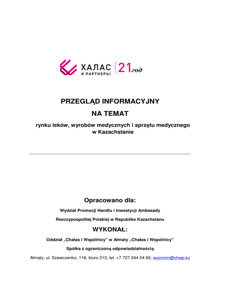 PRZEGLĄD INFORMACYJNY NA TEMAT rynku leków, wyrobów medycznych i sprzętu medycznego w Kazachstanie __________________________________________________________________ Opracowano dla: Wydział Promocji Handlu i Inwestycji Ambasady Rzeczypospolitej Polskiej w Republike Kazachstanu WYKONAŁ: Oddział „Chałas i Wspólnicy” w Ałmaty „Chałas i Wspólnicy” Spółka z ograniczoną odpowiedzialnością Ałmaty, ul. Szewczenko, 118, biuro 213, tel. +7 727 244 04 60, [email protected] SPIS TREŚCI: 1. INFORMACJA OGÓLNA ............................................................................................... 3 1.1 O autorach ........................................................................................................................................ 3 1.2 Wykorzystane źródła ...................................................................................................................... 3 1.3 Informacje źródłowe i postawione pytania................................................................................... 5 2. WSTĘP .............................................................................................................................. 5 3. REGULACJA PRAWNA RYNKU LEKÓW, WYROBÓW MEDYCZNYCH I SPRZĘTU MEDYCZNEGO ............................................................................................ 6 3.1 Export............................................................................................................................................... 16 3.2 Import ............................................................................................................................................... 17 3.3 Certyfikacja dobrowolna i obowiązkowa. . .............................................................................. 20 4. INFORMACJA ANALITYCZNA O BRANŻY W LATACH 2014-2015 Z UWZGLĘDNIENIEM DOSTĘPNYCH DANYCH Z ROKU 2016 ............................ 21 5. DYNAMIKA EKSPORTU I IMPORTU......................................................................... 30 5.1 Struktura geograficzna ................................................................................................................. 35 5.2 Wiodący importerzy ...................................................................................................................... 41 5.3 Wiodący eksporterzy .................................................................................................................... 41 6. STRUKTURA RYNKU WEWNĘTRZNEGO............................................................... 42 6.1 Rynek detaliczny ........................................................................................................................... 42 6.2 Rynek Hurtowy .............................................................................................................................. 43 6.3 Wiodący gracze ............................................................................................................................. 43 6.4 Kanały dystrybucji ......................................................................................................................... 44 2 1. INFORMACJA OGÓLNA 1.1 O autorach Niniejszy Przegląd został przygotowany przez Oddział „Chałas i Wspólnicy” w Ałmaty „Chałas i Wspólnicy” Spółki z ograniczoną odpowiedzialnością (dalej - konsultant), zgodnie z załącznikiem №1 do umowy №04/2016 z dnia sierpnia 18 2016 zawartą z Wydziałem Promocji Handlu i Inwestycji Ambasady Rzeczypospolitej Polskiej w Republice Kazachstanu (zwane dalej - Zadanie robocze). W przygotowaniu niniejszego Przeglądu udział wzięli następujący specjaliści Konsultanta: - Alexandr Voronin, prawnik. - Vladislav Dubrovin, prawnik. Osób trzecich nie będących pracownikami Konsultanta nie angażowano. Wszystkie pytania, mogace powstać w wyniku rozpatrzenia przedstawionego niżej materiału, mogą Państwo kierować do Alexandra Voronina (tel. +7 727 244 04 60; е-mail: [email protected]) 1.2 Wykorzystane źródła W celu przygotowania nieniejszego Przeglądu Konsultant wykorzystał następujące akty prawne i inne źródła: 1) Kodeks Republiki Kazachstanu z dnia 18 września 2009r № 193-IV «O zdrowiu publicznym i systemie opieki zdrowotnej"(; 2) Kodeks Republiki Kazachstanu z dnia10 grudnia 2008r «O podatkach i innych płatnościach do budżetu»; 3) Kodeks Cywilny Republiki Kazachstanu z dnia 01 lipca 1999 (Część szczególna); 4) Kodeks Przedsiębiorczy Republiki Kazachstanu z dnia 29 października 2015 r.; 5) Kodeks Karny Republiki Kazachstanu z dnia 3 lica 2014 r.; 6) Kodeks Administracyjny Republiki Kazachstanu z dnia 5 lipca 2014 r; 7) Kodeks Republiki Kazachstanu z dnia 30 czerwca 2010 r «Kodeks Celny» 8) Ustawa Republiki Kazachstanu z dnia 19 grudnia 2003 года № 508-II «O reklamie»; 9) Ustawa Republiki Kazachstanu z dnia 16 maja 2014 r. «O zezwoleniach i zawiadomieniach»; 10) Rozporządzenie Rządu Republiki Kazachstanu z dnia 30 października 2009 r № 1729; 11) Rozporządzenie Rządu Republiki Kazachstanu z dnia 7 listopada 2009 r № 1781; 12) Rozporządzenie Rządu Republiki Kazachstanu z dnia 21.01.2011 № 24; 13) Rozporządzenie Rządu Republiki Kazachstanu z dnia 20.04. 2005г. N 367; 14) Rozporządzenie inistra zdrowia i rozwoju społecznego Republiki Kazachstanu z dnia 27 lutego 2015 r № 105; 3 15) Rozporządzenie inistra zdrowia Republiki Kazachstanu z dnia 19 listopada 2009 r № 736; 16) Rozporządzenie inistra zdrowia Republiki Kazachstanu z dnia 18 listopada 2009 года № 735; 17) Rozporządzenie inistra zdrowia Republiki Kazachstanu z dnia 17 sierpnia 2015 r № 668; 18) Rozporządzenie inistra zdrowia i rozwoju społecznego Republiki Kazachstanu z dnia 14 września 2015 r № 713; 19) Rozporządzenie inistra zdrowia i rozwoju społecznego Republiki Kazachstanu z dnia 27 lutego 2015 r № 105; 20) Rozporządzenie inistra zdrowia i rozwoju społecznego Re