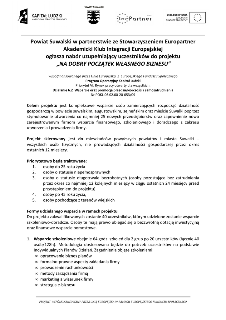 POWIAT SUWALSKI Powiat Suwalski w partnerstwie ze Stowarzyszeniem Europartner Akademicki Klub Integracji Europejskiej ogłasza nabór uzupełniający uczestników do projektu „NA DOBRY POCZĄTEK WŁASNEGO BIZNESU” współfinansowanego przez Unię Europejską z Europejskiego Funduszu Społecznego Program Operacyjny Kapitał Ludzki Priorytet VI. Rynek pracy otwarty dla wszystkich. Działanie 6.2 Wsparcie oraz promocja przedsiębiorczości i samozatrudnienia Nr POKL.06.02.00-20-053/09 Celem projektu jest kompleksowe wsparcie osób zamierzających rozpocząć działalność gospodarczą w powiecie suwalskim, augustowskim, sejneńskim oraz mieście Suwałki poprzez stymulowanie utworzenia co najmniej 25 nowych przedsiębiorstw oraz zapewnienie nowo zarejestrowanym firmom wsparcia finansowego, szkoleniowego i doradczego z zakresu utworzenia i prowadzenia firmy. Projekt skierowany jest do mieszkańców powyższych powiatów i miasta Suwałki – wszystkich osób fizycznych, nie prowadzących działalności gospodarczej przez okres ostatnich 12 miesięcy. Priorytetowo będą traktowane: 1. osoby do 25 roku życia 2. osoby o statusie niepełnosprawnych 3. osoby o statusie długotrwale bezrobotnych (osoby pozostające bez zatrudnienia przez okres co najmniej 12 kolejnych miesięcy w ciągu ostatnich 24 miesięcy przed przystąpieniem do projektu) 4. osoby po 45 roku życia, 5. osoby pochodzące z terenów wiejskich Formy udzielanego wsparcia w ramach projektu Do projektu zakwalifikowanych zostanie 40 uczestników, którym udzielone zostanie wsparcie szkoleniowo-doradcze. Osoby te mają prawo ubiegać się o bezzwrotną dotację inwestycyjną oraz finansowe wsparcie pomostowe. 1. Wsparcie szkoleniowe obejmie 64 godz. szkoleń dla 2 grup po 20 uczestników (łącznie 40 osób/128h). Metodologia dostosowana będzie do potrzeb uczestników na podstawie Indywidualnych Planów Działań. Zagadnienia objęte szkoleniami: • opracowanie biznes planów • formalno-prawne aspekty zakładania firmy • prowadzenie rachunkowości • metody zarządzania firmą • marketing a wizerunek firmy • strategia e-biznesu PROJEKT WSPÓŁFINANSOWANY PRZEZ UNIĘ EUROPEJSKĄ W RAMACH EUROPEJSKIEGO FUNDUSZU SPOŁECZNEGO POWIAT SUWALSKI • źródła finansowania działalności gospodarczej, w tym fundusze UE • inne (kształtowane na etapie tworzenia grupy szkoleniowej) 2. Doradztwo I etap – Doradztwo podstawowe (1 blok) – pomoc doradcy indywidualnego 40 uczestnikom w przygotowaniu wniosków o udzielenie dofinansowania wraz z biznes planem. Każdy uczestnik otrzyma 3 h doradztwa. Łącznie zostanie udzielonych 120 h doradztwa przed założeniem firmy. II etap – Doradztwo specjalistyczne – pomoc doradców min. 25 uczestnikom, którzy otrzymali wparcie finansowe (tematy: finansowanie działalności gospodarcza, prawo pracy, księgowanie i rozliczenia, strategia marketingowa - konsultacje tematyczne, indywidualna pomoc ad hoc w ramach 3 bloków). Każdy Beneficjent pomocy otrzyma 3 h doradztwa specjalistycznego. Łącznie zostanie udzielonych 75 h doradztwo po założeniu firmy. 3. Na podstawie oceny przygotowanych przez 40 uczestników biznes planów Komisja wyłoni minimum 25 uczestników projektu, którzy otrzymają wsparcie inwestycyjne do wysokości maksymalnie 25000 zł oraz pomostowe do wysokości 1200 zł miesięcznie przez okres 6 miesięcy z możliwością jego przedłużenia 10 uczestnikom, których firmy nie będą generowały planowanych przychodów na kolejne 6 miesięcy. Formularz Rekrutacyjny wraz z załącznikami należy złożyć w zamkniętej kopercie z dopiskiem „Rekrutacja uczestników projektu pn. Na dobry początek własnego biznesu, Działanie 6.2 PO KL” osobiście lub za pośrednictwem poczty lub kuriera w okresie od 25.01.2010 r. do 08.02.2010 r. od poniedziałku do piątku w godz. 7.30-15.30 na adres: Starostwo Powiatowe w Suwałkach ul. Świerkowa 60 16-400 Suwałki (BIURO OBSŁUGI KLIENTA pok. 20) „Rekrutacja uczestników projektu pn. Na dobry początek własnego biznesu, Działanie 6.2 PO KL” W przypadku składania dokumentów rekrutacyjnych za pośrednictwem poczty lub kuriera decyduje data i godzina wpływu przesyłki do adresata, tj. 08.02.2010 r. godzina 15.30. W przypadku wystąpienia niejasności w składanych dokumentach rekrutacyjnych proszę o skorzystanie z konsultacji w Biurze Projektu „Na dobry początek własnego biznesu” w Starostwie Powiatowym w Suwałkach, przy ul. Świerkowej 60, pok. 12, tel. 087 565 92 44, e-mail: [email protected] Dokumentacja rekrutacyjna oraz szczegółowe informacje dostępne są: na stronie internetowej Powiatu www.powiat.suwalski.pl oraz projektu www.przedsiebiorczasuwalszczyzna.pl jak również w Biurze Projektu. STAROSTA /-/ Szczepan Ołdakowski PROJEKT WSPÓŁFINANSOWANY PRZEZ UNIĘ EUROPEJSKĄ W RAMACH EUROPEJSKIEGO FUNDUSZU SPOŁECZNEGO