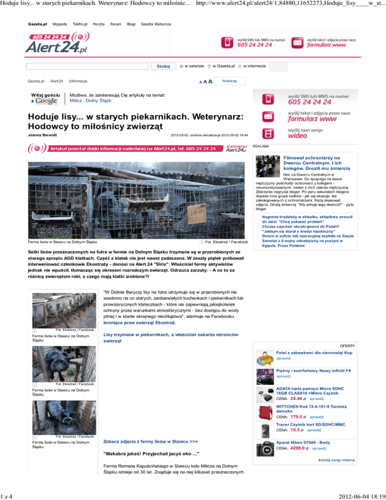 Hoduje lisy... w starych piekarnikach. Weterynarz: Hodowcy to miłośnic... http://www.alert24.pl/alert24/1,84880,11652273,Hoduje_lisy____w_st... 1z4 Gazeta.pl Wyjazdy Tokfm.pl Poczta Forum Blogi Gazeta Wyborcza Szukaj Gazeta.pl Alert24 Witaj gościu z w serwisie Informacje A w Gazeta.pl AA w internecie Podziel się Możliwe, że zainteresują Cię artykuły na temat: Milicz Dolny Śląsk Hoduje lisy... w starych piekarnikach. Weterynarz: Hodowcy to miłośnicy zwierząt Joanna Berendt 2012-05-02, ostatnia aktualizacja 2012-05-02 16:44 REKLAMA Filmował ochroniarzy na Dworcu Centralnym. I ich kolegów. Grozili mu śmiercią Noc na Dworcu Centralnym w Warszawie. Do śpiącego na ławce mężczyzny podchodzi ochroniarz z kolegami nieumundurowanymi. Jeden z nich uderza mężczyznę. Zdarzenie nagrywa bloger. Po paru sekundach blogera dopada inna grupa osiłków - jak się okazuje, też zakolegowanych z ochroniarzami. Każą skasować zdjęcia. Grożą śmiercią. "Kto pilnuje tego dworca?" - pyta bloger Ferma lisów w Stawcu na Dolnym Śląsku Fot. Ekostraż / Facebook Nagrania kradzieży w sklepiku, sklepikarz wrzucił do sieci: "Chcę pokazać problem" Chcesz zaprosić obcokrajowca do Polski? "Jakbym się starał o kredyt hipoteczny" Dziura w suficie sali operacyjnej szpitala na Zaspie Samolot z II wojny odnaleziony na pustyni w Egipcie. Przez Polaków Setki lisów przeznaczonych na futra w fermie na Dolnym Śląsku trzymane są w przerobionych ze starego sprzętu AGD klatkach. Część z klatek nie jest nawet zadaszona. W zeszły piątek próbowali interweniować członkowie Ekostraży - donosi na Alert 24 "Strix". Właściciel fermy aktywistów jednak nie wpuścił, tłumacząc się okresem rozrodczym zwierząt. Odrzuca zarzuty: - A co to za różnicę zwierzętom robi, z czego mają klatki zrobione?! "W Dolinie Baryczy lisy na futra utrzymuje się w przerobionych nie wiadomo na co starych, zardzewiałych kuchenkach i piekarnikach lub prowizorycznych klateczkach - które nie zapewniają jakiejkolwiek ochrony przez warunkami atmosferycznymi - bez dostępu do wody pitnej i w stanie skrajnego niechlujstwa", alarmuje na Facebooku broniąca praw zwierząt Ekostraż. Fot. Ekostraż / Facebook Ferma lisów w Stawcu na Dolnym Śląsku Lisy trzymane w piekarnikach, a właściciel oskarża obrońców zwierząt OFERTY Fotel z zabawkami dla niemowląt Kup sprawdź Piękny i komfortowy Nowy Infiniti FX sprawdź Fot. Ekostraż / Facebook ADATA karta pamięci Micro SDHC 16GB CLASS10 +Mikro Czytnik Ferma lisów w Stawcu na Dolnym Śląsku CENA: 24.44 zł sprawdź WITTCHEN Kod 72-4-151-9 Torebka damska CENA: 179.0 zł sprawdź Tracer Czytnik kart SD/SDHC/MMC CENA: 10.5 zł sprawdź Fot. Ekostraż / Facebook Ferma lisów w Stawcu na Dolnym Śląsku Zobacz zdjęcia z fermy lisów w Stawcu >>> Aparat Nikon D7000 - Body CENA: 4299.0 zł sprawdź "Makabra jakaś! Przyjechali jacyś eko ..." +dodaj swoją reklamę Ferma Romana Kapuścińskiego w Stawcu koło Milicza na Dolnym Śląsku istnieje od 30 lat. Znajduje się na niej kilkaset przeznaczonych 2012-06-04 18:19 Hoduje lisy... w starych piekarnikach. Weterynarz: Hodowcy to miłośnic... http://www.alert24.pl/alert24/1,84880,11652273,Hoduje_lisy____w_st... 2z4 na futra lisów. W ostatni piątek u bram fermy zjawili się członkowie Ekostraży z policją. Ktoś doniósł im, że zwierzęta przetrzymywane są w złych warunkach - poinformował Alert24 czytelnik "Strix". Fot. Ekostraż / Facebook Ferma lisów w Stawcu na Dolnym Śląsku Właściciel nie pozwolił jednak na przeprowadzenie kontroli, tłumacząc, że trwa obecnie okres rozrodczy i lisów nie można niepokoić. Nie pomogła obecność policji, a na inspekcję nie zgodziła się również zastępczyni powiatowego lekarza weterynarii Natalia Misiek. Jako powód odmowy ona także wymieniła okres ochronny. więcej zdjęć ZOBACZ TAKŻE Łódzkie: Wandale zniszczyli pomnik Jana Pawła II [ZDJĘCIA] Dziesięć psów odebranych właścicielowi. Chodziły po własnych odchodach - To makabra jakaś! Przyjechali jacyś "eko" i zaczęli burzę, że się znęcam nad zwierzętami - oburza się Roman Kapuściński. - Chcieli wejść, jak teraz mi się samice kocą. Nie pozwoliłem, ale wchodzili i tak, pod płotem - dodaje. "Będzie pozew o znęcanie się nad zwierzętami..." Olga Smaga z Ekostraży zaprzecza, by działacze w jakimkolwiek momencie wkroczyli na teren fermy. - Staliśmy po drugiej stronie płotu i stamtąd robiliśmy zdjęcia - mówi. Przyznaje jednak, że osoba, która doniosła im o sprawie, istotnie mogła wchodzić na teren hodowli - wskazują na to zdjęcia, które przysłała stowarzyszeniu obrońców praw zwierząt. Na fotografiach widać z kolei, że spora część klatek zrobiona jest ze starego sprzętu AGD, nie jest zadaszona, a warunki panujące w hodowli są kiepskie. Ekostraż pisze, że zdjęcia pokazują "nagie fakty". Nie mamy wątpliwości, że na fermie panują nieodpowiednie warunki i dochodzi tam do znęcania się nad zwierzętami. Inspekcja Weterynaryjna również nie dopełniła swoich obowiązków w zakresie nadzoru nad ochroną zwierząt. Zbieramy właśnie materiał dowodowy, by po długim weekendzie złożyć zawiadomienie o podejrzeniu popełnienia przestępstwa - oświadcza Dawid Karaś z Ekostraży. - Zrobili zdjęcia akurat w tych miejscach, w których był bałagan i leżały jakieś klatki... - tłumaczy się właściciel. A to, że część tych klatek zrobiona jest z kuchenek albo piekarników? - Nie wszystkie są takie, ale co to przeszkadza, z czego są zrobione? Jaką to robi lisom różnicę? - pyta. Zaś na zarzut, że wiele klatek jest niezadaszonych, odpowiada: - Jak coś się tam robi, to trzeba przenosić przecież, podnosić dachy... Jest remont, wymieniam też klatki, ale w pięć minut się tego nie da zrobić. Klatka z piekarnika? Weterynarz: "Czemu nie?" Co ciekawe, ani powiatowy lekarz weterynarii, ani policja - jak utrzymują - nigdy wcześnie