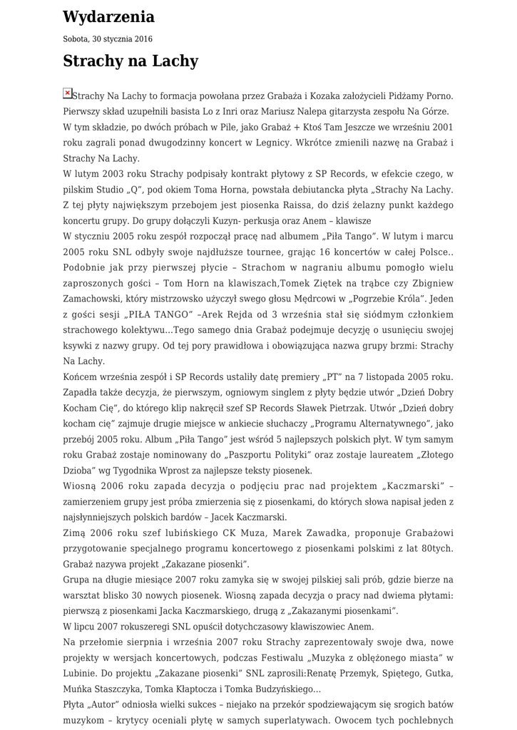 Wydarzenia Sobota, 30 stycznia 2016 Strachy na Lachy Strachy Na Lachy to formacja powołana przez Grabaża i Kozaka założycieli Pidżamy Porno. Pierwszy skład uzupełnili basista Lo z Inri oraz Mariusz Nalepa gitarzysta zespołu Na Górze. W tym składzie, po dwóch próbach w Pile, jako Grabaż + Ktoś Tam Jeszcze we wrześniu 2001 roku zagrali ponad dwugodzinny koncert w Legnicy. Wkrótce zmienili nazwę na Grabaż i Strachy Na Lachy. W lutym 2003 roku Strachy podpisały kontrakt płytowy z SP Records, w efekcie czego, w pilskim Studio „Q”, pod okiem Toma Horna, powstała debiutancka płyta „Strachy Na Lachy. Z tej płyty największym przebojem jest piosenka Raissa, do dziś żelazny punkt każdego koncertu grupy. Do grupy dołączyli Kuzyn- perkusja oraz Anem – klawisze W styczniu 2005 roku zespół rozpoczął pracę nad albumem „Piła Tango”. W lutym i marcu 2005 roku SNL odbyły swoje najdłuższe tournee, grając 16 koncertów w całej Polsce.. Podobnie jak przy pierwszej płycie – Strachom w nagraniu albumu pomogło wielu zaproszonych gości – Tom Horn na klawiszach,Tomek Ziętek na trąbce czy Zbigniew Zamachowski, który mistrzowsko użyczył swego głosu Mędrcowi w „Pogrzebie Króla”. Jeden z gości sesji „PIŁA TANGO” –Arek Rejda od 3 września stał się siódmym członkiem strachowego kolektywu…Tego samego dnia Grabaż podejmuje decyzję o usunięciu swojej ksywki z nazwy grupy. Od tej pory prawidłowa i obowiązująca nazwa grupy brzmi: Strachy Na Lachy. Końcem września zespół i SP Records ustaliły datę premiery „PT” na 7 listopada 2005 roku. Zapadła także decyzja, że pierwszym, ogniowym singlem z płyty będzie utwór „Dzień Dobry Kocham Cię”, do którego klip nakręcił szef SP Records Sławek Pietrzak. Utwór „Dzień dobry kocham cię” zajmuje drugie miejsce w ankiecie słuchaczy „Programu Alternatywnego”, jako przebój 2005 roku. Album „Piła Tango” jest wśród 5 najlepszych polskich płyt. W tym samym roku Grabaż zostaje nominowany do „Paszportu Polityki” oraz zostaje laureatem „Złotego Dzioba” wg Tygodnika Wprost za najlepsze teksty piosenek. Wiosną 2006 roku zapada decyzja o podjęciu prac nad projektem „Kaczmarski” – zamierzeniem grupy jest próba zmierzenia się z piosenkami, do których słowa napisał jeden z najsłynniejszych polskich bardów – Jacek Kaczmarski. Zimą 2006 roku szef lubińskiego CK Muza, Marek Zawadka, proponuje Grabażowi przygotowanie specjalnego programu koncertowego z piosenkami polskimi z lat 80tych. Grabaż nazywa projekt „Zakazane piosenki”. Grupa na długie miesiące 2007 roku zamyka się w swojej pilskiej sali prób, gdzie bierze na warsztat blisko 30 nowych piosenek. Wiosną zapada decyzja o pracy nad dwiema płytami: pierwszą z piosenkami Jacka Kaczmarskiego, drugą z „Zakazanymi piosenkami”. W lipcu 2007 rokuszeregi SNL opuścił dotychczasowy klawiszowiec Anem. Na przełomie sierpnia i września 2007 roku Strachy zaprezentowały swoje dwa, nowe projekty w wersjach koncertowych, podczas Festiwalu „Muzyka z oblężonego miasta” w Lubinie. Do projektu „Zakazane piosenki” SNL zaprosili:Renatę Przemyk, Spiętego, Gutka, Muńka Staszczyka, Tomka Kłaptocza i Tomka Budzyńskiego… Płyta „Autor” odniosła wielki sukces – niejako na przekór spodziewającym się srogich batów muzykom – krytycy oceniali płytę w samych superlatywach. Owocem tych pochlebnych recenzji był Paszport Polityki dla Grabaża w styczniu 2008 roku. Od kwietnia 2008 roku grupa tradycyjnie zaszyła się w zaciszach żeleźnickiego Studia Q by dokończyć w wersji płytowej projekt „Zakazane piosenki” Z programem Zakazane piosenki Strachy wystąpiły na Festiwalach w Węgorzewie i Jarocinie. Pierwszym singlem wykrojonym z albumu została piosenka „Po prostu pastelowe” – Malarzy i Żołnierzy, do której Pitold i Radek Wysocki zrealizowali teledysk w całości z klocków Lego. Clip był nominowany do nagrody w kategorii najlepszy klip animowany na Yach Film Festiwal. W listopadzie 2008 roku Grabaż, po blisko trzyletniej przerwie w tworzeniu własnych utworów napisał 11 nowych piosenek. Zajęło mu to całe dwa tygodnie… Jeden z utworów „doDekafonia” dał tytuł całej płycie. 1 czerwca 2009 roku grupa w żeleźnickim Studio Q rozpoczęła nagrywanie swojego piątego albumu. Prace nad płytą przeciągnęły się do początku 2010 roku, co jest bezdyskusyjnym rekordem świata w kategorii „Jak szybko Strachy na Lachy nagrywają płytę”. Wśród zaproszonych gości pojawiła się Natalia Fiedorczuk, śpiewając w duecie z Grabażem „Dziewczynę o chłopięcych sutkach”. Pierwszym singlem z „Dodekafonii” jest utwór „Żyję w kraju”, do którego klip nakręcili GuzikOwcy, czyli stała teledyskowa ekipa SnL. Utwór na singla został wybrany trochę na przekór ogólnie przyjętym zasadom… Z uwagi na morze wulgaryzmów, które pojawiają się w tej piosence byliśmy przekonani, że robimy singla tylko do internetu, więc tym większe było nasze zdziwenie, że utwór ochoczo podchwyciły stacje radiowe czyniąc go jednym z singli roku. Eska Rock umieściła go na drugim miejscu wśród rockowych hitów 2009 roku, w Liście Przebojów Programu Trzeciego utwór został numerem 1. Jesienią 2010 roku radiowa Trójka uhonorowała zespół prestiżową nagrodąMateusza za album Dodekafonia. W tym samym dniu w Studiu im Agnieszki Osieckiej zespół otrzymał za ten album platynową płytę. W 2011 roku grupa występuje na Festiwalach: Rock in Arena, Odjazdy, Jarocin Festival. Jesienią SP Records wydaje „DEKADĘ” – jubileuszowe i składankowe wydawnictwo podsumowujące 10 lat istnienia kapeli. Nowa piosenka w tym zestawie, „Awangarda, jazz i podziemie” jest pierwszym sygnałem nowej płyty, którą zespół planuje wydać w 2013 roku. Końcem 2011 roku, w Łodzi, Strachy nagrywają swoje pierwsze DVD, którego premiera odb