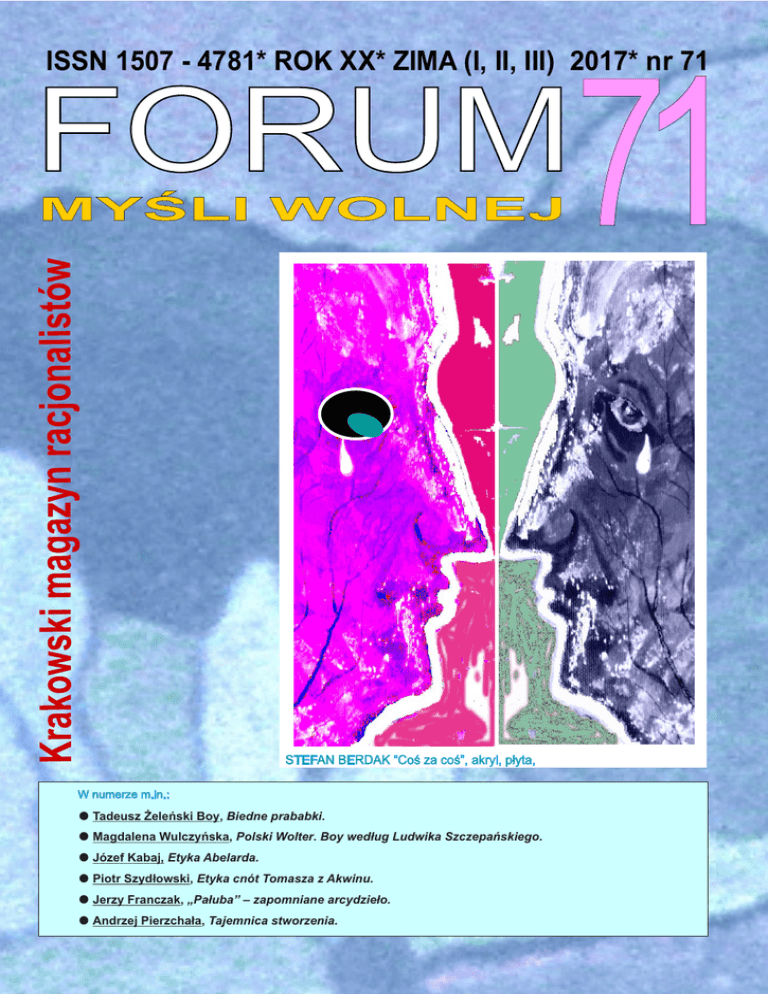 71 ISSN 1507 - 4781* ROK XX* ZIMA (I, II, III) 2017* nr 71 STEFAN BERDAK “Coś za coś”, akryl, płyta, W numerze m.in.: Tadeusz Żeleński Boy, Biedne prababki. Magdalena Wulczyńska, Polski Wolter. Boy według Ludwika Szczepańskiego. Józef Kabaj, Etyka Abelarda. Piotr Szydłowski, Etyka cnót Tomasza z Akwinu. Jerzy Franczak, „Pałuba” – zapomniane arcydzieło. Andrzej Pierzchała, Tajemnica stworzenia. SPIS TREŚCI: 1 SŁOWO OD REDAKTORA RADA PROGRAMOWA: 5 JózefKabaj,Etyka Abelarda. doc. dr Andrzej Kurz –przewodniczący, prof.drhab.CzesławBanach –wiceprzewodniczący, dr Józef Kabaj –wiceprzewodniczący, mgr Jan Nowak –wiceprzewodniczący, mgrStanisławFranczak – sekretarz. 10 PiotrSzydłowski,Etyka cnót Tomasza z Akwinu. Członkowie: StanisławFranczak TEMATY SPRZED LAT 2 TadeuszŻeleńskiBoy,Biedne prababki. Wybór i wprowadzenie Piotra Augustynka. CYKL: ETYKA DLA MŁODZIEŻY PUBLICYSTYKA 20 Magdalena Wulczyńska, Polski Wolter. Boy według Ludwika Szczepańskiego. 31 AndrzejPierzchała,Tajemnica stworzenia. 37 JanSocha,Sprzątanie umysłu. MYŚLĄC BELFREM 41 PiotrAugustynek,Fabryka śrubek. RECENZJE 43 IgnacyS.Fiut,Zwroty artystyczne i biografie poetów. prof.drhab.AdamChmielewski, prof.drhab.IgnacyS.Fiut, prof.drhab.MarianGrzybowski, prof.drhab.JerzyKochan, prof.drhab.JerzyKolarzowski, drhab.ZbigniewKrawczyk, prof.drhab.JózefLipiec, mgrMieczysławNoworyta, prof.drhab.JerzyOchman, prof.drhab.JanSzmyd, prof.drhab.PiotrSzydłowski, prof.drhab.JanWoleński, prof.drhab.KrzysztofWoźniakowski. 49 JerzyFranczak,„Pałuba” – zapomniane arcydzieło. ADRES REDAKCJI: 52 Maciej Naglicki, Od animalistycznego pojmowania świata po jego filozoficzny ogląd. 30-703Kraków,ul.Dekerta2A/5 tel.12423-50-16;501456547 e-mail: [email protected] sekretarzredakcji:tel.501286053 53 MaciejNaglicki,Kobiety – praw i prawd burzycielki. KRONIKA 54 Sukcesy października 56’(JanNowak). 55 Spotkanie w Kuźnicy–notkazprelekcji“PolskiWolter”(red.). 56 DorocznasesjanaukowawKuźnicy(sprawozdaniered.). 58 Z PRASY – oprac. M. Jakubiec. 59 Z PORTALI INTERNETOWYCH –oprac.J.KabajiS.Franczak. Z WITRYNY KSIĘGARSKIEJ 64 OJ.M.Roślickim–oprac.S.Franczak. 64 LISTY DO REDAKCJI –JózefM.Roślicki. Wydawca: Rada Wojewódzka TowarzystwaKulturyŚwieckiej, 30-703Kraków,ul.Dekerta2A/5 www.forummysliwolnej.pl DomFundacyjnyim.LidiiiLeona Świeżawskich Skład, łamanie i druk: AgencjaReklamowaNovum, 31-158Kraków,ul.Krowoderska66/8 tel.:126333553 www.novum.krakow.pl ISSN 1507-4781, Index 325813 Redaktor naczelny: StanisławFranczak. Zespół redakcyjny:IgnacyS.Fiut,AntoniPietryka(zastępcyred.nacz.),PiotrAugustynek(sekretarz),Sławomir Brodziński,MieczysławJakubiec,MaciejNaglicki,ArturKozioł(red.techniczny). Fotoreporter:AntoniPietryka. Opracowanie graficzne:StefanBerdak,RomanLasa. Redakcjazastrzegasobieprawodoskracaniatekstówizmianytytułów.Nieodsyłamymateriałówniezamówionych. Artykułynaukowesąrecenzowaneprzezsamodzielnychpracownikównauki. SŁOWO OD REDAKTORA SŁOWO OD REDAKTORA M iniony rok 75 zapisał się 75 śmierci rocznicy śmierci naszego patrona Tadeusza lat mija w obchodami br. od tragicznej naszego patrona Tadeusza Żeleńskiego Boya – racjonalisty Żeleńskiego. Boya, i przedstawiciela współczesnego oświecenia, wybitnego publicysty, Najbardziej żywe i jakże obecne wepolskiej współczesnym życiu społecznym okazały który przysporzył równocześnie kulturze tłumaczenia arcydzieł literatury franBibliotekę Boya. Był także i działaczem społecznym, się idee cuskiej, zawartetworząc w takich oto jego dziełach jakkrytykiem „Piekło teatralnym kobiet”, czy w „Naszych okupantwórcąjeinstytucji Mleka” propagatorem świadomego macierzyństwa, bojownitach”. Podjęły polskie „Kropli kobiety, które izbudziły się oburzone polityką PiS, propagującego kiemi ograniczenie o prawa kobiet zwalczającym obłudęoraz i fałsz,swobód ciemnotę i klerykalizm, głupotę i fanaantyaborcję praw społecznych prawno-obywatelskich. Obtyzm. Jakże świeże i i żywym aktualne są jego myślifałsz, zawarte w Dziewicach konsystorskich, Piekle nażyły w swym aktywnym proteście obłudę i próby kościelno-politycznej kobiet,rodziny, czy też ograniczenia Naszych okupantach. Wciąż jego dzieła nie są już tylko historią kontroli życia wolności sumienia poprzez narzucenie ustawliteratury, obywanieżądają możnazwykłego odłożyć ich na półkę, są nadal współczesnym narzędziem walki o te telskich, wciąż a także prawa do decydowania o swym macierzyństwie. same cele co przed kilkudziesięcioma laty. Boy i dziś mobilizuje nas do upominania się Szły pod czarnymi parasolkami z hasłami Boya, które nagle ożyły i stały się niezwyo zwykłą prawdę, wolność sumienia i wyznania, świeckość życia społecznego, oddzielenie kle naturalne, żądając nie przywilejów dla siebie, ale podstawowych praw cywilizacyjspraw Kościoła od polityki Państwa, i najzwyczajniej o głos rozsądku. Stąd w każdym nych i pełnego upodmiotowienia. Obok KOD-u to druga siła opozycyjna, która sprzecinumerze przypominamy fragmenty jego celnych felietonów i publicystyki społecznej, wia się polityce partii rządzącej i Kościołowi. jego trafne myśli i spostrzeżenia. Wystarczy sięgnąć do nich i... wyciągnąć wnioski. Wiadomość telegraficzna: oto Senat uchwalił, że NATO rok 2017 będzie Rokiem Dwa wielkie wydarzenia przysłoniły inne, szczyt w Warszawie, któregoTadeusza przesłaKościuszki, nie jasne, chce Bolesława Leśmiana jakonie Patrona Roku, co jestprezydenta sukcesem nie ale byłoza ażnic nadto mimo to niektórzy politycy słyszeli nawoływań PiS-u. Obamy o przestrzeganie Konstytucji. Drugim ważnym wydarzeniem były Światowe Dni W polityce międzynarodowej okazały się wybory prezydenckie w USA, Młodzieży, z których młodzinajważniejsze wywieźli na pewno najważniejsze – związki przyjaźni, które zakończone nieoczeki