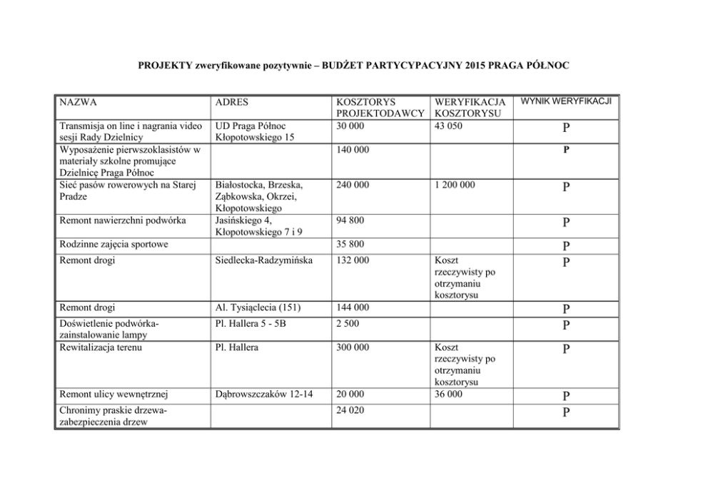 PROJEKTY zweryfikowane pozytywnie – BUDŻET PARTYCYPACYJNY 2015 PRAGA PÓŁNOC NAZWA ADRES Transmisja on line i nagrania video sesji Rady Dzielnicy Wyposażenie pierwszoklasistów w materiały szkolne promujące Dzielnicę Praga Północ Sieć pasów rowerowych na Starej Pradze UD Praga Północ Kłopotowskiego 15 Remont nawierzchni podwórka KOSZTORYS WERYFIKACJA PROJEKTODAWCY KOSZTORYSU 30 000 43 050 140 000 Białostocka, Brzeska, Ząbkowska, Okrzei, Kłopotowskiego Jasińskiego 4, Kłopotowskiego 7 i 9 Rodzinne zajęcia sportowe 240 000 P P 1 200 000 P 94 800 P 35 800 P P Remont drogi Siedlecka-Radzymińska 132 000 Remont drogi Al. Tysiąclecia (151) 144 000 Doświetlenie podwórkazainstalowanie lampy Rewitalizacja terenu Pl. Hallera 5 - 5B 2 500 Pl. Hallera 300 000 Remont ulicy wewnętrznej Dąbrowszczaków 12-14 20 000 Chronimy praskie drzewazabezpieczenia drzew WYNIK WERYFIKACJI 24 020 Koszt rzeczywisty po otrzymaniu kosztorysu P P Koszt rzeczywisty po otrzymaniu kosztorysu 36 000 P P P Zmiana stałej organizacji ruchu – instalacja sygnalizacji świetlnej Radzymińska/Grodzieńska Remont chodnika Namysłowska (1) 15 000 Ustawienie ławek Szanajcy 20 000 System audio i video dla praskiego ZOO Hotspot na Pradze Ratuszowa 1/3 22 000 30 000 1 500 000 180 000 Piknik rodzinny Park Praski 100 000 130 000 700 000 400 000 220 000 750 000 Bezpłatna sieć WI-FI Poprawa spójności sieci tras rowerowych na Nowej Pradze i Pelcowiźnie 200 000 Plac zabaw Jagiellońska, Targowa, 11 Listopada, Cyryla i Metodego, Konopacka, Skoczylasa, Namysłowska, rondo Starzyńskiego, Gersona, Witkiewicz, Szernera Szanajcy 16 i 16a – Dąbrowszczaków 14 Pl. Hallera Zadaszenie wejścia do przychodni Dąbrowszczaków 5A 80 000 Montaż platformy podnoszącej Dąbrowszczaków 2 40 000 Utworzenie międzypokoleniowego „Klubu Praskiego” Rewitalizacja przejścia bramowego Pl. Hallera 9 200 000 Pl. Hallera 5 30 000 Rewitalizacja przejść bramowych Skoczylasa 10/12 22 000 Zakup komputerów dla Domu Kultury DK Praga Dąbrowszczaków 2 60 000 Rewitalizacja terenu 1 000 000 140 000 P P P P P P P P 400 000 P 120 000 P P P P 45 000 P P P Praski Rozwój Czytelnictwanowości czytelnicze dla praskich bibliotek Budowa skateparku 264 000 Targowa/ 11 Listopada 1 201 218 Al. Solidarności 176 235 390 000 Remont odpływu wody w ulicy Gimnazjum Nr 31 Sierakowskiego 9 Jagiellońska 66a - 64 Darmowe WI-FI Szmulowizna 100 000 Ekologiczna Biblioteka Plenerowa Park Praski 4600 Klubokawiarnia dla Pragi II Budowa placów treningowych Pl. Hallera i okolice Łomżyńska, Siedlecka; Radzymińska; Skwer płk Żurowskiego Ratuszowa 1/3 29 400 90 000 Rewitalizacja wybiegu dla niedźwiedzi Zagrajmy w tenisa na Pradze Dofinansowanie do biletów do ZOO Instalacja latarni Stworzenie Centrum Aktywizacji Społeczno – Kulturalnej „Kawęczyńska” Społeczeństwo obywatelskieprogram edukacyjny dla praskich szkół Budowa chodnika Remont i zagospodarowanie podwórka Edukacyjna ścieżka na placu zabaw Kawęczyńska, Otwocka, Siedlecka Kawęczyńska 16 Szkoły podstawowe, gimnazja, ponadpodstawowe Radzymińska na odc. Otwocka- Naczelnikowska Stalowa 18 Jagiellońska 28 P 1 197 500 P P 490 000 P 350 000 P P P 150 000 41 000 P P 67 500 P 160 000 P 139 646 P 408 000 P 160 000 P 44 146 P 23 600 P Muzyka, ruch i przestrzeń dla dzieci Jagiellońska 28 30 000 Rewitalizacja zieleni Łochowska 44 2 000 Zorganizowanie Centrum doradztwa zawodowego Miejska plaża „Rusałka” Otwocka 3 163 520 Wyb.Helskie - okolice ul. Ratuszowej 133 700 „Chodź na Pragie” – cykl gier miejskich na rzecz pogłębiania wiedzy historycznej, integracji i budowania tożsamości lokalnej Rewitalizacja podwórza Modernizacja boiska ogólnodostępnego Ptasi zakątek Dzielnicowy Informator Senioralny (gazeta) Rewitalizacja skweru Praga Północ – moje miejsce na świecie (zajęcia plastyczne dla najmłodszych) Stworzenie skweru Stworzenie kółka ornitologicznego Budkowanie nad Wisłą – rozwieszenie budek lęgowych Remont ulicy „Niewidomi są wśód nas” – stworzenie tyflografiki w UD Praga Północ 14 000 P P P 75 200 P 38 200 P Skoczylasa 9 377 500 Zespół Szkół nr 45 i DOSiR Praga-Północ, ul Jagiellońska 7 Stalowa/Czynszowa 300 000 P P 65 268 105 000 150 000 P P Otwocka 1 71 150 Dom kultury 28 230 P P Ząbkowska/Brzeska DK „Praga” Dąbrowszczaków 2 Plaża nad Wisłą 49 000 21 700 P P 19 940 P Grajewska 167 824 Kłopotowskiego 15 74 450 P P 85 000 Domki dla skrzydlatych pasiastych przyjaciół (budki dla owadów) Budowa skateparku Starzyńskiego i inne, wg załącznika Siedlecka/Wołomińska/Fol warczna ul. Szanajcy 12 3 360 P 202 000 P 437 855, 40 P ul. Ząbkowska 1 000 000 obszar działania Zakładu Gospodarowania Nieruchomościami ul. Strzelecka/Stalowa 80 000 P P Dobry start dla maluszków organizacja zajęć ogólnorozwojowych dla dzieci w wieku 2-4 lat w Ogródku Jordanowskim Budowa placu zabaw filii szk. podst. 258 Rewitalizacja terenów zielonych ul. Namysłowska 21 82 480 P P ul. Namysłowska 1 120 000 P ul. Szanajcy 16 3 000 Pomalowanie ogrodzenia trawników Renowacja terenu wokół budynku ul. Szanajcy 16 3 000 P P ul. Szanajcy 11 37 542 Bezpieczny plac zabaw dla dzieci z Przedszkola 164 Remont nawierzchni ulicy Przeprowadzenie audytu w ZGN Praga-Północ Psi park-wybieg dla psów Skatepark przy "Orliku" Praga ul Targowa 86 Północ Uruchomienie klubu tatów na Pradze-Północ (wsparcie dla ojców) Park dla psów ul. Stalowa/Czynszowa/ Konopacka/11 Listopada Wielofunkcyjny plac sportu, ruchu i ul. Inżynierska 5 zabaw 65 000 1 119 300 1 197 500 P P 60 000 P 39 600 P 233 391 P Etap finalny rewitalizacji osiedla Praga I Poprawa estetyki i czystości na osiedlu Śliwice, montaż koszy na śmieci "Świetna Światłość - Praga-Północ" porady dla mieszkańców w zakresie oszczędzania energii ul. Jagiellońska / Kameralna ul. Jagiellońska/ Witkiewicza/ Gersona 55 500 P 4 200 P 27 000 29 500 P