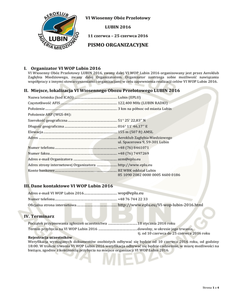 VI Wiosenny Obóz Przelotowy LUBIN 2016 11 czerwca – 25 czerwca 2016 PISMO ORGANIZACYJNE I. Organizator VI WOP Lubin 2016 VI Wiosenny Obóz Przelotowy LUBIN 2016, zwany dalej VI WOP Lubin 2016 organizowany jest przez Aeroklub Zagłębia Miedziowego, zwany dalej Organizatorem. Organizator zastrzega sobie możliwość nawiązania współpracy z innymi stowarzyszeniami i organizacjami w celu zapewnienia realizacji celów VI WOP Lubin 2016. II. Miejsce, lokalizacja VI Wiosennego Obozu Przelotowego LUBIN 2016 Nazwa lotniska (kod ICAO) ..................................................... Lubin (EPLU) Częstotliwość AFIS ...................................................................... 122,400 MHz (LUBIN RADIO) Położenie ......................................................................................... 3 km na północ od miasta Lubin Położenie ARP (WGS-84): Szerokość geograficzna ............................................................. 51 25’ 22,83’’ N Długość geograficzna ................................................................. 016 11’ 46,17’’ E Elewacja ........................................................................................... 155 m (507 ft) AMSL Adres ................................................................................................. Aeroklub Zagłębia Miedziowego ul. Spacerowa 9, 59-301 Lubin Numer telefonu ............................................................................. +48 (76) 8461071 Numer faksu ................................................................................... +48 (76) 7497269 Adres e-mail Organizatora ...................................................... [email protected] Adres strony internetowej Organizatora ......................... http://www.eplu.eu Konto bankowe ............................................................................. BZ WBK oddział Lubin 85 1090 2082 0000 0005 4600 0186 III. Dane kontaktowe VI WOP Lubin 2016 Adres e-mail VI WOP Lubin 2016 ......................................... [email protected] Numer telefonu ............................................................................. +48 76 744 22 33 Oficjalna strona internetowa .................................................. http://www.eplu.eu/VI-wop-lubin-2016.html IV. Terminarz Początek przyjmowania zgłoszeń uczestnictwa .................................... 18 stycznia 2016 roku Termin przybycia na VI WOP Lubin 2016 ................................................ dowolny, w okresie jego trwania, tj. od 10 czerwca do 25 czerwca 2016 roku Rejestracja uczestników Weryfikacja wymaganych dokumentów osobistych odbywać się będzie od 10 czerwca 2016 roku, od godziny 18:00. W trakcie trwania VI WOP Lubin 2016 weryfikacja odbywać się będzie codziennie, w miarę możliwości na bieżąco, zgodnie z kolejnością przybycia na miejsce organizacji VI WOP Lubin 2016. Strona 1 z 4 c.d. Pismo organizacyjne | VI Wiosenny Obóz Przelotowy LUBIN 2016 Weryfikacja techniczna sprzętu Piloci przybyli z własnym sprzętem obowiązani są posiadać ważną polisę OC i NW. Piloci podpisują oświadczenie o przygotowaniu szybowca do lotów i posiadaniu kompletu wymaganych prawem i przepisami dokumentów. Za prawdziwość danych i sprawność sprzętu odpowiedzialny jest pilot. Inauguracja VI WOP Lubin 2016.................................................................... 11 czerwca 2016 roku (sobota), godz. 8:00 Oficjalne zakończenie VI WOP Lubin 2016 .............................................. 25 czerwca 2016 (sobota), godz. 19:00 V. Kierownictwo VI WOP Lubin 2016 Kierownictwo VI WOP Lubin 2016 wyznaczone jest przez Organizatora w następującym składzie funkcyjnym: 1. Józef Herczyński, Dyrektor Obozu (Szef Wyszkolenia i Dyrektor AZM) 2. Krzysztof Herczyński, Kierownik Sportowy 3. Dariusz Deptuła, Kierownik Techniczny 4. Andrzej Onitsch, Kierownik Organizacyjny 5. Liderzy eskadr (liderzy tras – instruktorzy i doświadczeni piloci szybowcowi) VI. Cele VI WOP Lubin 2016 1. 2. 3. 4. 5. VII. Doskonalenie umiejętności przelotowych. Zdobycie warunków do licencji i odznak. Podniesienie kwalifikacji pilotów. Trening. Ustanawianie rekordów szybowcowych. Dostępny sprzęt Organizator udostępni uczestnikom w miarę możliwości szybowce jedno i dwumiejscowe. Szybowce dwumiejscowe dostępne będą z instruktorem dla pilotów bez doświadczenia przelotowego. Z uwagi na ograniczenia sprzętowe Organizator zachęca do przybycia z własnym (lub klubowym) szybowcem. VIII. Minimalne wymagania dla uczestników VI WOP Lubin 2016 1. Ważna licencja pilota szybowcowego, orzeczenie lotniczo-lekarskie z ważnością co najmniej do dnia 26 czerwca 2016 roku oraz książka pilota szybowcowego z ważnym wpisem KWT i KTP. 2. Uprawnienie do startów holowanych za samolotem. 3. Uprawnienie do wykonywania lotów na typie szybowca, na którym pilot wykonywać będzie loty. 4. Wypełniony i podpisany formularz rejestracyjny - deklaracja uczestnictwa stanowiący załącznik do niniejszego Pisma Organizacyjnego. 5. Udział uczniów – pilotów w VI WOP Lubin 2016 możliwy jest warunkowo, tj. pod nadzorem własnego instruktora i na własnym sprzęcie. Organizator nie zapewnia kadry instruktorskiej dla uczniów – pilotów. 6. Piloci przybyli z własnymi szybowcami obowiązani są posiadać komplet dokumentów szybowca oraz stosowne, wymagane prawem ubezpieczenia. Dodatkowo zalecane są: 1. Aktualna mapa lotnicza Polski w skali 1:500 000. 2. Dla osób, które chciałyby wykonać przeloty warunkowe posiadanie rejestratora GNSS zatwierdzonego przez IGC. Dla pozostałych – dowolny odbiornik GPS umożliwiający rejestrację przelotów. IX. Warunki uczestnictwa 1. Wypełnienie elektronicznego formularza zgłoszenia uczestnictwa dostępnego na stronie Organizatora pod adresem: http://www.eplu.eu/zgloszenie-uczestnicwa-vi-wop.php 2. Dostarczenie wypełnionej i podpisanej deklaracji uczestnictwa do Biura Kierownictw
