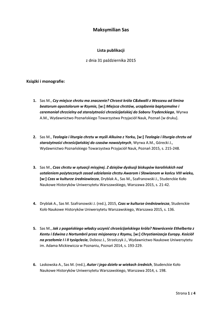 Maksymilian Sas Lista publikacji z dnia 31 października 2015 Książki i monografie: 1. Sas M., Czy miejsce chrztu ma znaczenie? Chrzest króla C&dwalli z Wessexu ad limina beatorum apostolorum w Rzymie, [w:] Miejsca chrztów, urządzenia baptyzmalne i ceremoniał chrzcielny od starożytności chrześcijańskiej do Soboru Trydenckiego, Wyrwa A.M., Wydawnictwo Poznańskiego Towarzystwa Przyjaciół Nauk, Poznań [w druku]. 2. Sas M., Teologia i liturgia chrztu w myśli Alkuina z Yorku, [w:] Teologia i liturgia chrztu od starożytności chrześcijańskiej do czasów nowożytnych, Wyrwa A.M., Górecki J., Wydawnictwo Poznańskiego Towarzystwa Przyjaciół Nauk, Poznań 2015, s. 215-248. 3. Sas M., Czas chrztu w sytuacji misyjnej. Z dziejów dyskusji biskupów karolińskich nad ustaleniem pożytecznych zasad udzielania chrztu Awarom i Słowianom w końcu VIII wieku, [w:] Czas w kulturze średniowiecza, Dryblak A., Sas M., Szafranowski J., Studenckie Koło Naukowe Historyków Uniwersytetu Warszawskiego, Warszawa 2015, s. 21-42. 4. Dryblak A., Sas M. Szafranowski J. (red.), 2015, Czas w kulturze średniowiecza, Studenckie Koło Naukowe Historyków Uniwersytetu Warszawskiego, Warszawa 2015, s. 136. 5. Sas M., Jak z pogańskiego władcy uczynić chrześcijańskiego króla? Nawrócenie Ethelberta z Kentu i Edwina z Nortumbrii przez misjonarzy z Rzymu, [w:] Chrystianizacja Europy. Kościół na przełomie I i II tysiąclecia, Dobosz J., Strzelczyk J., Wydawnictwo Naukowe Uniwersytetu im. Adama Mickiewicza w Poznaniu, Poznań 2014, s. 193-229. 6. Laskowska A., Sas M. (red.), Autor i jego dzieło w wiekach średnich, Studenckie Koło Naukowe Historyków Uniwersytetu Warszawskiego, Warszawa 2014, s. 198. Strona 1 z 4 7. Sas M., Autor listu o odbiorcy. Misjonarz działający wśród pogan w świetle korespondencji Alkuina z Yorku z Arnonem z Salzburga, [w:] Autor i jego dzieło w wiekach średnich, Laskowska A., Sas M., Studenckie Koło Naukowe Historyków Uniwersytetu Warszawskiego, Warszawa 2014, s. 17-38. 8. Dryblak Ł., Laskowska A., Sas M. i in. (red.), Od Unii Lubelskiej do Unii Europejskiej. Rzeczpospolita między Wschodem a Zachodem, Studenckie Koło Naukowe Historyków Uniwersytetu Warszawskiego, Warszawa 2014, s. 98. 9. Kruszyńska A., Sas M. i in. (red.), Wojna jako zjawisko polityczne, społeczne i kulturowe. Materiały studencko-doktoranckiej konferencji naukowej, Studenckie Koło Naukowe Historyków Uniwersytetu Warszawskiego, Warszawa 2013, s. 82. 10. Kruszyńska A., Pazik P., Sas M. i in. (red.), Jednostka wobec wspólnoty. X Interdyscyplinarna Sesja Humanistyczna. Materiały pokonferencyjne, Studenckie Koło Naukowe Historyków Uniwersytetu Warszawskiego, Warszawa 2013, s. 104. 11. Jurek L., Figurski P., Oczkowski W., Sas M. (red.), Ja - My - Oni. Tożsamości ludzi średniowiecza, Studenckie Koło Naukowe Historyków Uniwersytetu Warszawskiego, Warszawa 2012, s. 190. 12. Jurek L., Oczkowski W., Sas M. (oprac.), H. Keller, Tożsamości i indywidualność w czasach kryzysów pełnego średniowiecza (XI-XII w.), tłum. P. Figurski, [w:] Ja - My - Oni. Tożsamości ludzi średniowiecza, Jurek L., Figurski P., Oczkowski W., Sas M., Studenckie Koło Naukowe Historyków Uniwersytetu Warszawskiego, Warszawa 2012, s. 9-22. 13. Sas M., Augustyn z Canterbury nawracający Anglosasów - przyczynek do tożsamości średniowiecznego misjonarza, [w:] Ja - My - Oni. Tożsamości ludzi średniowiecza, Jurek L., Figurski P., Oczkowski W., Sas M., Studenckie Koło Naukowe Historyków Uniwersytetu Warszawskiego, Warszawa 2012, s. 31-44. 14. Figurski P., Sas M. (red.), „Granice" i „pogranicza" w badaniach historycznych i antropologicznych. Materiały z III Międzynarodowej Sesji Humanistycznej, Warszawa 27¬29 maja 2011 r., Studenckie Koło Naukowe Historyków Uniwersytetu Warszawskiego, Warszawa 2012, s. 144. Strona 2 z 4 15. Kordel J., Sas M. (red.), Człowiek wobec śmierci na przestrzeni dziejów. Materiały z VII Ogólnopolskiej Sesji Interdyscyplinarnej z cyklu Historia - różne perspektywy, Studenckie Koło Naukowe Historyków Uniwersytetu Warszawskiego, Warszawa 2011, s. 172. 16. Figurski P., Jurek L., Sas M. i in. (red.), Ideologia i rytuały władzy w średniowieczu, Studenckie Koło Naukowe Historyków Uniwersytetu Warszawskiego, Warszawa 2011, s. 143. 17. Sas M. (wraz z zespołem, tłum. i oprac.), Narratio itineris navalis ad Terram Sanctam, [w:] Ideologia i rytuały władzy w średniowieczu, Figurski P., Jurek L., Sas M. i in., Studenckie Koło Naukowe Historyków Uniwersytetu Warszawskiego, Warszawa 2011, s. 109-130. 18. Sas M. (wraz z zespołem, tłum. i oprac.), 2011, Epistola de morte Friderici imperatoris, [w:] Ideologia i rytuały władzy w średniowieczu, Figurski P., Jurek L., Sas M. i in., Studenckie Koło Naukowe Historyków Uniwersytetu Warszawskiego, Warszawa 2011, s. 130-139. 19. Pranke P., Zglińska A., Sas M. i in. (red.), Pamiętać czy zapomnieć... Miejsca pamięci we współczesnym dyskursie naukowym. II Międzynarodowa Sesja Humanistyczna, Kraków 24¬26 czerwca 2010 r., In Tempore & Teka Historyka, Kraków - Toruń - Warszawa 2011, s. 184. 20. Sas M., Człowiek i sacrum - analiza kochawińskich zapisek o cudach, [w:] Unia lubelska i co dalej? Materiały z II Ogólnopolskiej Studenckiej Konferencji Naukowej Historyków Nowożytników, Kraków, 16-18 XI 2009 r. (Nowożytnicze Zeszyty Historyczne, 2), Maciuk M., Witecki S., Koło Naukowe Historyków Studentów Uniwersytetu Jagiellońskiego, Kraków 2010, s. 165-180. 21. Gackowski T., Pranke P., Świątek A., Sas M. i in. (red.), „Swój" i „obcy". Materiały z I Międzynarodowej Sesji Humanistycznej, Toruń 17-19 V 2009, In Tempore & Teka Historyka, Warszawa 2010, s. 274. 22. Sas M., Brunon z Kwerfurtu - średniowieczny misjonarz w kręgu wielkiej polityki, [w:] Vade Nobiscum. Materiały Studenckiego Koła Naukowego Historyków Uniwersytetu Łódzkiego, Vol. III, Historia Dyplomacji, Brzozowska Z., Studenckie Koło
