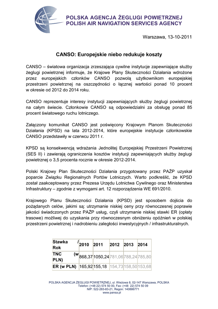 POLSKA AGENCJA śEGLUGI POWIETRZNEJ POLISH AIR NAVIGATION SERVICES AGENCY Warszawa, 13-10-2011 CANSO: Europejskie niebo redukuje koszty CANSO – światowa organizacja zrzeszająca cywilne instytucje zapewniające słuŜby Ŝeglugi powietrznej informuje, Ŝe Krajowe Plany Skuteczności Działania wdroŜone przez europejskich członków CANSO pozwolą uŜytkownikom europejskiej przestrzeni powietrznej na oszczędności o łącznej wartości ponad 10 procent w okresie od 2012 do 2014 roku. CANSO reprezentuje interesy instytucji zapewniających słuŜby Ŝeglugi powietrznej na całym świecie. Członkowie CANSO są odpowiedzialni za obsługę ponad 85 procent światowego ruchu lotniczego. Załączony komunikat CANSO jest poświęcony Krajowym Planom Skuteczności Działania (KPSD) na lata 2012-2014, które europejskie instytucje członkowskie CANSO przedstawiły w czerwcu 2011 r. KPSD są konsekwencją wdraŜania Jednolitej Europejskiej Przestrzeni Powietrznej (SES II) i zawierają ograniczenia kosztów instytucji zapewniających słuŜby Ŝeglugi powietrznej o 3,5 procenta rocznie w okresie 2012-2014. Polski Krajowy Plan Skuteczności Działania przygotowany przez PAśP uzyskał poparcie Związku Regionalnych Portów Lotniczych. Warto podkreślić, Ŝe KPSD został zaakceptowany przez Prezesa Urzędu Lotnictwa Cywilnego oraz Ministerstwa Infrastruktury – zgodnie z wymogami art. 12 rozporządzenia WE 691/2010. Krajowego Planu Skuteczności Działania (KPSD) jest sposobem dojścia do poŜądanych celów, jakimi są: utrzymanie niskiej ceny przy równoczesnej poprawie jakości świadczonych przez PAśP usług, czyli utrzymanie niskiej stawki ER (opłaty trasowe) moŜliwej do uzyskania przy równoczesnym obniŜeniu opóźnień w polskiej przestrzeni powietrznej i nadrobieniu zaległości inwestycyjnych / infrastrukturalnych. Stawka Rok TNC PLN) / (w 2010 2011 2012 2013 2014 868,37 1050,24 781,06 788,24 785,80 ER (w PLN) 165,92 155,18 154,73 158,50 153,68 POLSKA AGENCJA śEGLUGI POWIETRZNEJ, ul. WieŜowa 8, 02-147 Warszawa, POLSKA Telefon: (+48 22) 574 50 00, Fax: (+48 22) 574 50 09 NIP: 522-283-83-21, Regon: 140886771 www.pansa.pl Ponadto, uwzględniając zmiany w polskiej przestrzeni powietrznej, specyfikę ruchu lotniczego w polskich TMA (Rejon Kontrolowany Lotniska) i APP (słuŜba kontroli zbliŜania) oraz zasady alokowania kosztów do obszaru TNC (opłaty terminalowe) i ER (opłaty trasowe), zaproponowana została nowa alokacja kosztów PAśP, co pozwoliło znacznie obniŜyć stawki opłaty za nawigację terminalową (TNC) do poziomu ok. 780 zł w latach 2012-2014.