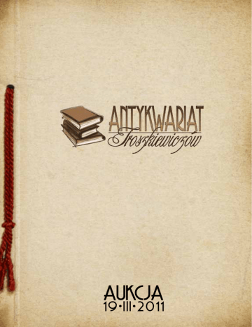 Aukcja 1 9 • I I I • 2 0 11 Regulamin aukcji Zaprasza P.T. Państwa na Aukcję antykwaryczną: „WIOSNA 2011” Odbędzie się ona 19.III.2011 r. w Klubie Księgarza Rynek Starego Miasta 22/24 w Warszawie. Rozpoczęcie aukcji o godz. 10.30 Obiekty do wglądu w dniu aukcji od godz. 8.00. Kontakt telefoniczny w dniu aukcji: 635 25 97 - Klub Księgarza lub telefon komórkowy: 602 786 333 e-mail: [email protected] www.books-troszkiewicz.com.pl ANTYKWARIAT TROSZKIEWICZÓW ul.Wspólna 51, 00-684 Warszawa tel.: (22) 626-89-09 fax: 625 72 22 tel. kom.: 602 786 333 BANK PEKAO SA 76 1240 6218 1111 0000 4619 3764 1. Ceny podane w katalogu są cenami wywołania. 2. W zamówieniach pocztowych prosimy podać: • numer pozycji, • nazwisko autora, • pierwsze słowo tytułu, • największą oferowaną cenę (limit). Wysokość limitów oraz nazwiska osób i nazwy instytucji biorących udział w licytacji drogą korespondencyjną są informacjami poufnymi. W imieniu tych osób i instytucji licytację przeprowadzą pracownicy Antykwariatu. 3. Zakupione pozycje wysyłamy pocztą za pobraniem pocztowym. Dla instytucji płatność drogą przelewu na nasze konto. 4. Prosimy o przestrzeganie 7-dniowego terminu płatności od daty otrzymania rachunku za zakupione pozycje. Po tym terminie naliczane będą ustawowe odsetki. 5. Biblioteka Narodowa i Biblioteka Jagiellońska mają prawo pierwokupu po cenach wylicytowanych. 6. Instytucje płatnicy VAT proszone są o podanie na zamówieniach NIP oraz dopisku upoważniającego Antykwariat do wysyłki zakupionych książek pocztą i wystawienia faktur bez podpisu odbiorcy. 7. Do ceny wylicytowanej antykwariat dolicza 7% opłaty organizacyjnej (w tym VAT). 8. Prowadzący aukcję może wycofać pozycję przed rozpoczęciem licytacji bez podania przyczyny 9. Organizatorzy zastrzegają sobie prawo wykluczenia z aukcji osób, które nie wywiązuja się z przyjętych zobowiązań. 10. Antykwariat nie ponosi odpowiedzialności za ukryte wady fizyczne i prawne licytowanych pozycji. 11. Na sali aukcyjnej sprzedaż osobom prywatnym realizujemy tylko za gotówkę ZAMÓWIENIA POCZTOWE (formularz znajduje się na końcu tej części katalogu) oraz inną korespondencję prosimy kierować na adres: Antykwariat Troszkiewiczów ul. Wspólna 51 00-684 WARSZAWA z dopiskiem: AUKCJA 894 Locker „Karten auf Karten” 872 Moraczewski „Warszawa” 600 Arystofanes „Gromiwoja” 667 Sołtan „Warszawa w autolitografiach” 650 Grottger „Padoł Płaczu” 749 Niemcewicz „Śpiewy Historyczne” 623 Mickiewicz „Dziady” 725 Karpiński „Krótki rys ustroju dawnej Polski i…” 2 tomy 596 Woskresenskaja Bukwar 1952 518 Kalendarz Ziem Wschodnich 1936 764 Rogalski „Dzieje Jana III Sobieskiego” 726 Kautsky „Zasady Socyalizmu” 714 Fahl „Skorowidz Dziennika Praw” 2 tomy 861 Gomulicki „Warschau” 860 Goeritz „ Buergerbuch Der Stadt Danzig” 683 Wyspiański „Dzieła Malarskie” 738 Łoziński „Prawem i Lewem” 499 Kalendarz polski y ruski 1763 656 Matejko „Kazanie Skargi” 556 Czyżowski „Mały Ziuk” 637 Staff „Łabędź i Lira” 804 Iwanowski „Serce Gramofonu” 571 Szelburg-Ostrowska „U leśnego dziadka” 570 Szelburg-Ostrowska „Najmilsi” 590 Marton Jamboree-Souvenir 842 Machczyński „O wyżłach i ich układaniu” 533 Horoszkiewicz „Wspomnienie roku 1830/31” 771 Skarżyński „Na RWD5 przez Atlantyk” 497 Compendiöeses Gelehrten „Lexicon” 1715 707 Czar „Dzieje Kobiety” 858 Ehrenkreutz „Z dziejów organizacji miejskiej starej Warszawy” 883 Smoleński „Jan Dekert” 742 Miełgunowa S.P., Sidorow N.P. „Masonstwo w jewo….” 502 Le Museum de Florence 1741 513 Gazeta Warszawska-Rozmaitości 1834 713 Encyklopedia Ilustrowana 1909 805 Kodeks Baltazara Behema 1913 784 Askenazy „Książe Józef Poniatowski” 555 Czarska „Siostra Marta” 632 Różewicz „Uśmiechy” 546 Augustynowicz „Skrzydlate Przyjaciółki” Kraków 1947 561 Kutz „W podziemiach Warszawy” 583 Gordon Benett 1936 701 Burdecki „Opanowanie Materii” 580 CORPORATIO RESPUBLICA 697 Bełza „Z epoki Mickiewicza” 810 „Pamiętniki Generała Prądzyńskiego” 835 Kartonik myśliwski Lublin 1927 827 Kartonik myśliwski Dawidgródek 832 Kartonik myśliwski Cieszyn Pruchna Hażlach 836 Kartonik myśliwski Olszanka 1926 831 Kartonik myśliwski Rzekietka-Spała 1932 843 Kartonik myśliwski Polowanie w Jabłonnie 1935 spis treści 1. STARODRUKI I CYMELIA . ..................................................................................... 496 – 510 2. CZASOPISMA I KALENDARZE............................................................................... 511 – 529 3. DRUKI EMIGRACYJNE – POLONICA..................................................................... 530 – 545 4. LITERATURA DZIECIĘCA I MŁODZIEŻOWA XIX I XX WIECZNA................... 546 – 577 5. VARIA........................................................................................................................... 578 – 598 6. POEZJA I DRAMAT XIX I XX WIEKU..................................................................... 599 – 644 7. SZTUKA – GRAFIKA................................................................................................. 645 – 684 8. DRUKI ZWARTE XIX I XX W. ................................................................................. 685 – 801 9. DRUKI BIBLIOFILSKIE – OPRAWY........................................................................ 802 – 816 10. KATALOGI-REGULAMINY-INSTRUKCJE........................................................... 817 – 824 11. ŁOWIECTWO-PSZCZELARSTWO-GOSPODARSTWO....................................... 825 – 849 12. REGIONALIA............................................................................................................ 850 – 892 13. Inne..........................................................................................................................