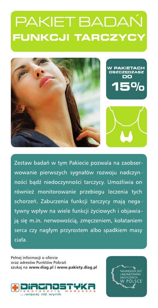 PAKIET BADAŃ FUNKCJI TARCZYCY OBEJMUJE: TSH – hormon tyreotropowy; podstawowe badanie w ocenie funkcjonowania tarczycy; nieprawidłowy, wysoki poziom hormonu może sugerować niedoczynność tarczycy, a nieprawidłowo niski – jej nadczynność. FT4 – tzw. wolna tyroksyna; badanie poziomu tego hormonu jest istotnym elementem oceny zaburzeń funkcjonowania tarczycy; w rozpoznawaniu chorób tarczycy istotna jest relacja pomiędzy wynikami badań FT4 i TSH. anty-TPO – najczęściej występujące autoprzeciwciała w chorobach tarczycy o podłożu autoimmunologicznym jak choroba Hashimoto i choroba Gravesa-Basedowa. Mogą występować zanim pojawią się zaburzenia hormonalne lub po ich wystąpieniu. U kobiet ciężarnych badanie zalecane w celu oceny ryzyka poporodowego zapalenia tarczycy. www.diag.pl - t h - Wskaznia do wykonania badań z Pakietu tarczycowego: Porównanie najczęstszych objawów niedoczynności i nadczynności tarczycy. Niedoczynność tarczycy to niedobór krążących we krwi hormonów tarczycy i obecność patologicznych skutków niedoboru tych hormonów. Nadczynność tarczycy to nadmiar krążących we krwi hormonów tarczycy i obecność patologicznych skutków nadmiaru tych hormonów. Najczęstsze objawy to: Najczęstsze objawy to: zmęczenie, ciągła potrzeba snu zaburzenia snu zwiększona wrażliwość uczucie gorąca, na zimno zwiększona potliwość suche i łamliwe włosy; wypadanie włosów, łuszczące i rozdwajające się paznokcie; wypadanie włosów; sucha, zimna skóra łamliwe paznokcie zaburzenia miesiączkowania: zaburzenia miesiączkowania: przedłużone rzadko występujące menstruacje i obfite menstruacje bądź ich brak niewytłumaczalny przyrost niewytłumaczalna utrata masy ciała masy ciała depresja nerwowość, stany lękowe nadaktywność kłopoty z koncentracją (szczególnie widoczna u dzieci) obniżone ciśnienie krwi, „słabe” tętno kołatanie serca opuchlizna w przedniej części szyi obrzmiała twarz i worki pod oczami wytrzeszcz oczu lub kłopoty ze wzrokiem uczucie kłucia w palcach i dłoniach