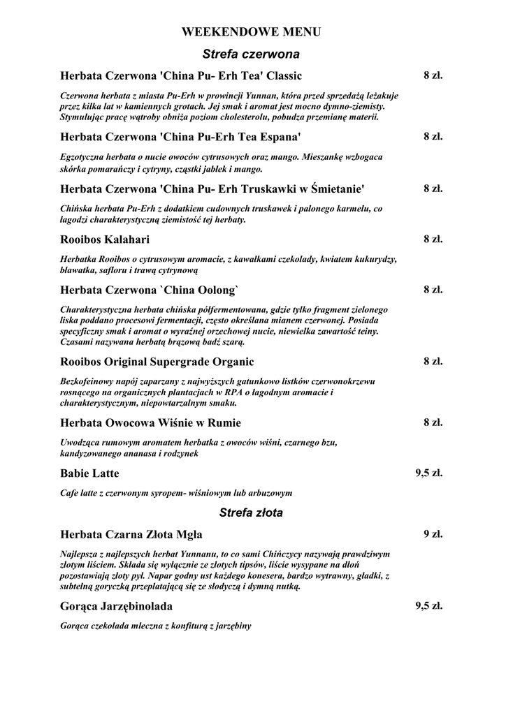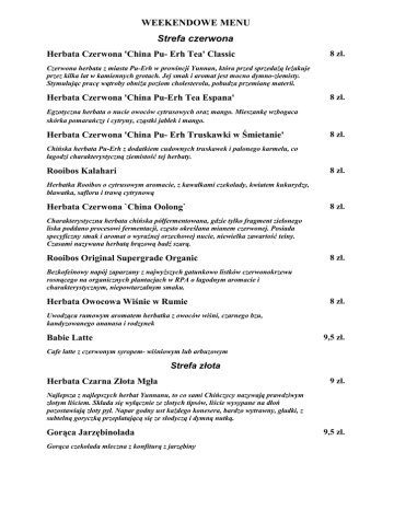 WEEKENDOWE MENU Strefa czerwona Herbata Czerwona 'China Pu- Erh Tea' Classic 8 zł. Czerwona herbata z miasta Pu-Erh w prowincji Yunnan, która przed sprzedaŜą leŜakuje przez kilka lat w kamiennych grotach. Jej smak i aromat jest mocno dymno-ziemisty. Stymulując pracę wątroby obniŜa poziom cholesterolu, pobudza przemianę materii. Herbata Czerwona 'China Pu-Erh Tea Espana' 8 zł. Egzotyczna herbata o nucie owoców cytrusowych oraz mango. Mieszankę wzbogaca skórka pomarańczy i cytryny, cząstki jabłek i mango. Herbata Czerwona 'China Pu- Erh Truskawki w Śmietanie' 8 zł. Chińska herbata Pu-Erh z dodatkiem cudownych truskawek i palonego karmelu, co łagodzi charakterystyczną ziemistość tej herbaty. 8 zł. Rooibos Kalahari Herbatka Rooibos o cytrusowym aromacie, z kawałkami czekolady, kwiatem kukurydzy, bławatka, safloru i trawą cytrynową Herbata Czerwona `China Oolong` 8 zł. Charakterystyczna herbata chińska półfermentowana, gdzie tylko fragment zielonego liska poddano procesowi fermentacji, często określana mianem czerwonej. Posiada specyficzny smak i aromat o wyraźnej orzechowej nucie, niewielka zawartość teiny. Czasami nazywana herbatą brązową badź szarą. Rooibos Original Supergrade Organic 8 zł. Bezkofeinowy napój zaparzany z najwyŜszych gatunkowo listków czerwonokrzewu rosnącego na organicznych plantacjach w RPA o łagodnym aromacie i charakterystycznym, niepowtarzalnym smaku. Herbata Owocowa Wiśnie w Rumie 8 zł. Uwodząca rumowym aromatem herbatka z owoców wiśni, czarnego bzu, kandyzowanego ananasa i rodzynek 9,5 zł. Babie Latte Cafe latte z czerwonym syropem- wiśniowym lub arbuzowym Strefa złota Herbata Czarna Złota Mgła 9 zł. Najlepsza z najlepszych herbat Yunnanu, to co sami Chińczycy nazywają prawdziwym złotym liściem. Składa się wyłącznie ze złotych tipsów, liście wysypane na dłoń pozostawiają złoty pył. Napar godny ust kaŜdego konesera, bardzo wytrawny, gładki, z subtelną goryczką przeplatającą się ze słodyczą i dymną nutką. Gorąca Jarzębinolada Gorąca czekolada mleczna z konfiturą z jarzębiny 9,5 zł. Jabłka, orzechy i inne jesienne dobrodziejstwa Nocciolino 8 zł. Kawa cappucino z dodatkiem aromatycznego syropu z orzechów laskowych Czarna Wiewióra 9 zł. 3 kulki lodów (orzech, bakalie, czekolada) przybrane bita śmietaną, smakowitymi orzechami i polewą czekoladową Szarlotka na Gorąco 9 zł. Porcja domowej szarlotki na ciepło z kulką lodów waniliowych i bitą śmietaną Sernik z Jabłkiem 7 zł. Kremowy sernik z musem jabłkowym Jabłka na Okrągło 2 zł. Okrągłe ciasteczko owsiane z suszonym jabłkiem Yerba Mate Union Manzana 9 zł. Łagodna mate z cząstkami suszonego zielonego jabłka Sok Tłoczony Jabłkowy 5 zł. Zdrowy i pyszny sok tłoczony z najlepszych jabłek Mocha Orzeszkowa 9,5 zł. Mocno czekoladowa kawa orzechowa – jesienne szaleństwo smaku Jesienne Śniadanie Śniadanie jakiego nie powstydziłaby się najlepsza wiewiórcza rodzina – kanapki z kasztanowym kremem, z Nutellą, z dŜemem jarzębinowym ... 13 zł.