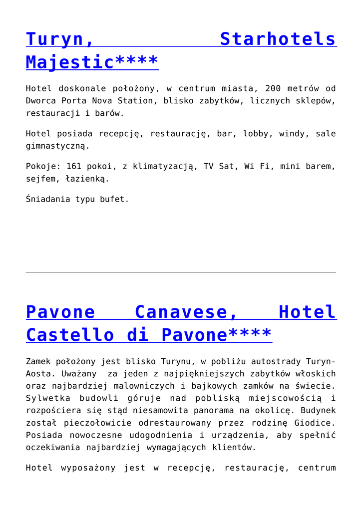 Turyn, Majestic**** Starhotels Hotel doskonale położony, w centrum miasta, 200 metrów od Dworca Porta Nova Station, blisko zabytków, licznych sklepów, restauracji i barów. Hotel posiada recepcję, restaurację, bar, lobby, windy, sale gimnastyczną. Pokoje: 161 pokoi, z klimatyzacją, TV Sat, Wi Fi, mini barem, sejfem, łazienką. Śniadania typu bufet. Pavone Canavese, Hotel Castello di Pavone**** Zamek położony jest blisko Turynu, w pobliżu autostrady TurynAosta. Uważany za jeden z najpiękniejszych zabytków włoskich oraz najbardziej malowniczych i bajkowych zamków na świecie. Sylwetka budowli góruje nad pobliską miejscowością i rozpościera się stąd niesamowita panorama na okolicę. Budynek został pieczołowicie odrestaurowany przez rodzinę Giodice. Posiada nowoczesne udogodnienia i urządzenia, aby spełnić oczekiwania najbardziej wymagających klientów. Hotel wyposażony jest w recepcję, restaurację, centrum biznesowe, punkt internetowy, park z roślinami tropikalnymi, parking. Pokoje: 27 stylowych pokoi, podzielone na różnego rodzaje apartamenty oraz pokoje typu standard. Wszystkie z zachowaniem stylowych elementów, komfortowe, z mini barem, Tv Sat, Wi Fi, klimatyzacją i łazienką, suszarką do włosów. Hotel Castello di Pavone**** Osoba w pokoju 2 osobowym 308 Osoba w pokoju 1 osobowym 433 Cena w PLN obejmuje: nocleg w pokoju, śniadanie Cena nie obejmuje: taksy klimatyczne płatnej na miejscu. Pollenzo – Bra, Hotel Albergo dell’Agenzia**** Hotel położony w pobliżu miasta Alba, pomiędzy dwoma pięknymi, sławnymi z produkcji win regionami Langhe i Roero. Okolica to malownicze wzgórza, porośnięte winnicami z krętymi drogami, które zapewniają zapierającą dech w piersiach scenerię. Budynek hotelu to odrestaurowana, piękna neogotycka wiejska posiadłość króla Carlo Alberto Sabaudii. Obok hotelu mieści się Uniwersytet Gastronomiczny i Muzeum Wina. Hotel dołączył do ruchu Slow Food i jest szczególnie polecany dla osób, które poszukują miejsca gdzie można połączyć przyjemny wypoczynek z dobrą kuchnią, w uroczym miejscu. Hotel posiada, recepcję, restaurację, bar, strefę fitness (basen, jaccuzi, saunę, łaźnię, małą salę gimnastyczną), salę konferencyjną, 2 hektarowy park, parking. W okolicy hotelu jest kilka 18 dołkowych pól golfowych. Pokoje: 44 pokoi, 3 apartamenty posiadają terakotowe podłogi, drewniane sufity, wszystkie urządzone prosto i gustownie. Każdy pokój wyposażony jest w Tv, internet, sejf, minibar, telefon, łazienkę z przeszkloną wanną, suszarkę do włosów. Śniadania: przygotowywane zgodnie z ideą Slow Food składają się z produktów naturalnych: ser, szynka, salami, jogurt, świeże mleko i soki owocowe, domowe ciasta i rogaliki. Hotel Albergo dell’Agenzia Pokój 2 osobowy Pokój 2 osobowy typu Superior Pokój 1 osobowy 18/01-30/04 01/08-06/09 01/05-31/07 07/09-28/11 29/11-20/12 633 752 799 849 910 968 497 598 638 Cena w PLN obejmuje: opłatę za pokój, za dobę, śniadanie, korzystanie z jacuzzi, łaźni tureckiej, sauny, sali fitness, basenu zewnętrznego, garaż. Cena nie obejmie: taksy klimatycznej, korzystania z mini baru i Wi Fi. Muzeum Wina – Banca del Vino, znajduje się w zabytkowych piwnicach Agenzia di Pollenzo, i jest to centrum przechowywania i udoskonalenia najlepszych włoskich win. Na powierzchni ponad dwóch tysięcy metrów stworzono również muzeum, w którym można poznać dziedzictwo enologicznych, włoskich rejonów winnych i skosztować win z najbardziej prestiżowych winnic. Uniwersytet Gastronomiczny – University of Gastronomic Sciences, został założony w 2004 roku przez międzynarodową organizację non profit „Slow Food”, we współpracy z włoskimi regionami Piemont i Emilii Romania. Jego głównym celem było utworzenie międzynarodowego centrum badań i edukacji dla osób pracujących nad odnowieniem metod uprawy, ochrony biologicznej i budowaniu relacji między gastronomią organiczną i nauką. Rezultatem działalności jest nowa specjalizacja zawodowa „The gastronome” – Smakosz; specjalista w produkcji, dystrybucji, promocji i komunikacji wysokiej, jakości żywności. Dla turystów organizowane są lekcje gotowania – orientacyjny koszt ok 110 Euro/os. Pollenzo – Bra, Hotel Albergo Corte Albertina*** Hotel położony w miejscowości Pollenzo, pomiędzy miejscowościami Alba i Bra, które są wpisane na listę światowego dziedzictwa UNESCO. Okolica to kraina znanych, wyśmienitych win i wyrafinowanej kuchni. Kameralny hotel został usytuowany w zabytkowym dworze, tuż obok Hotelu Albergo dell’Agenzia, Uniwersytetu Gastronomicznego i Muzeum Wina. Hotel posiada, recepcję, restaurację, bar, sale konferencyjne (obok w hotelu Albergo dell’Agenzia). W okolicy hotelu jest kilka 18 dołkowych pól golfowych. Pokoje: 25 pokoi, wyposażonych w zabytkowe meble, wszystkie z Tv, Wi Fi, telefonem, mini barem, sejfem. Śniadania: przygotowane zgodnie z ideą Slow Food, składają się z produktów naturalnych: ser, szynka, salami, jogurt, świeże mleko, świeże soki owocowe, domowe ciasta i rogaliki. Hotel Albergo Corte Albertina*** Pokój 2 osobowy Pokój 2 osobowy typu Deluxe Pokój 1 osobowy 18/01-30/04 01/08-06/09 01/05-31/07 07/09-28/11 29/11-20/12 404 479 556 481 528 607 303 404 482 Cena w PLN obejmuje: opłatę za pokój, za dobę, śniadanie, parking. Cena nie obejmie: taksy klimatycznej, korzystania z mini baru i Wi Fi. Muzeum Wina – Banca del Vino, znajduje się w zabytkowych piwnicach Agenzia di Pollenzo, i jest to centrum przechowywania i udoskonalenia najlepszych włoskich win. Na powierzchni ponad dwóch tysięcy metrów stworzono również muzeum, w którym można poznać dziedzictwo enologicznych, włoskich rejonów winnych i skosztować win z najbardziej prestiżowych winnic. Uniwersytet Gastronomiczny – University of Gastronomic Sciences, został założony w 2004 roku przez międzynarodową organizację no