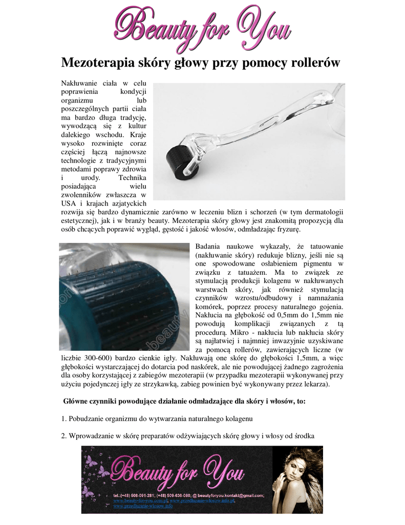 Mezoterapia skóry głowy przy pomocy rollerów Nakłuwanie ciała w celu poprawienia kondycji organizmu lub poszczególnych partii ciała ma bardzo długa tradycję, wywodzącą się z kultur dalekiego wschodu. Kraje wysoko rozwinięte coraz częściej łączą najnowsze technologie z tradycyjnymi metodami poprawy zdrowia i urody. Technika posiadająca wielu zwolenników zwłaszcza w USA i krajach azjatyckich rozwija się bardzo dynamicznie zarówno w leczeniu blizn i schorzeń (w tym dermatologii estetycznej), jak i w branży beauty. Mezoterapia skóry głowy jest znakomitą propozycją dla osób chcących poprawić wygląd, gęstość i jakość włosów, odmładzając fryzurę. Badania naukowe wykazały, że tatuowanie (nakłuwanie skóry) redukuje blizny, jeśli nie są one spowodowane osłabieniem pigmentu w związku z tatuażem. Ma to związek ze stymulacją produkcji kolagenu w nakłuwanych warstwach skóry, jak również stymulacją czynników wzrostu/odbudowy i namnażania komórek, poprzez procesy naturalnego gojenia. Nakłucia na głębokość od 0,5mm do 1,5mm nie powodują komplikacji związanych z tą procedurą. Mikro - nakłucia lub nakłucia skóry są najłatwiej i najmniej inwazyjnie uzyskiwane za pomocą rollerów, zawierających liczne (w liczbie 300-600) bardzo cienkie igły. Nakłuwają one skórę do głębokości 1,5mm, a więc głębokości wystarczającej do dotarcia pod naskórek, ale nie powodującej żadnego zagrożenia dla osoby korzystającej z zabiegów mezoterapii (w przypadku mezoterapii wykonywanej przy użyciu pojedynczej igły ze strzykawką, zabieg powinien być wykonywany przez lekarza). Główne czynniki powodujące działanie odmładzające dla skóry i włosów, to: 1. Pobudzanie organizmu do wytwarzania naturalnego kolagenu 2. Wprowadzanie w skórę preparatów odżywiających skórę głowy i włosy od środka ZALETY stosowania mezoterapii skóry głowy i włosów: • • • • • • • • • • • • Osiąganie szybkich rezultatów bez konieczności poddawania się kosztownym zabiegom chirurgicznym Szybkie efekty terapii Nieinwazyjność techniki Działanie na skórę i włosy "od środka" bez konieczności zażywania doustnie środków farmakologicznych Minimalne ryzyko zabiegu, zwłaszcza w porównaniu do zabiegów chirurgicznych, bądź silnie inwazyjnych Stosunkowo niski koszt terapii Zabiegi przeznaczone dla wszystkich osób, niezależnie od rodzaju problemu ze skórą, czy włosami Zabiegi dla wszystkich obszarów skóry (twarz, skóra głowy, ciało) - dobiera się odpowiednie preparaty do poszczególnych partii Brak wrażliwości na słońce po zabiegu Brak stałego uszkodzenia skóry Krótki czas powrotu do zdrowia / krótki czas rekonwalescencji Terapia kumulująca kolagen (naukowo udowodnione) Zapraszamy na konsultację odnośnie stosowania zabiegów mezoterapii skóry głowy i włosów przy pomocy rollerów, a także do zakupu profesjonalnych produktów w naszym sklepie. Zespół Beauty-for-You