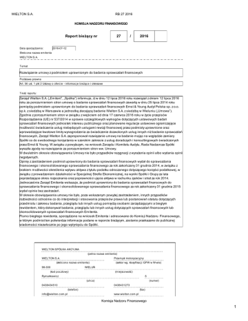 WIELTON S.A. RB 27 2016 KOMISJA NADZORU FINANSOWEGO Raport bieżący nr 27 / 2016 2016-07-12 Data sporządzenia: Skróc ona nazwa emitenta WIELTON S.A. Temat Rozwiązanie umowy z podmiotem uprawnionym do badania sprawozdań finansowych Podstawa prawna Art. 56 ust. 1 pkt 2 Ustawy o oferc ie - informac je bieżąc e i okresowe Treść raportu: Zarząd Wielton S.A. („Emitent”, „Spółka”) informuje, iż w dniu 12 lipca 2016 roku rozwiązał z dniem 12 lipca 2016 roku za porozumieniem stron umowę o badanie sprawozdań finansowych zawartą w dniu 25 lipca 2014 roku pomiędzy podmiotem uprawnionym do badania sprawozdań finansowych Ernst & Young Audyt Polska sp. z o.o. sp.k. z siedzibą w Warszawie a jednostką zlecającą badanie Wielton S.A. z siedzibą w Wieluniu („Umowa”). Zgodnie z porozumieniem stron w związku z wejściem od dnia 17 czerwca 2016 roku w życie przepisów Rozporządzenia (UE) nr 537/2014 w sprawie szczegółowych wymogów dotyczących ustawowych badań sprawozdań finansowych jednostek interesu publicznego oraz planowane regulacje ustawowe ograniczające możliwość świadczenia usług niebędących usługami rewizji finansowej przez podmioty uprawnione oraz wprowadzające kwotowe limity wynagrodzenia za świadczenie dozwolonych usług innych niż badanie sprawozdań finansowych, Zarząd Wielton S.A. zaproponował rozwiązanie umowy na badanie mając na względzie zamiary Spółki co do swobodnego korzystania w szerokim zakresie z usług doradczych i konsultingowych świadczonych przez Ernst & Young. W związku z powyższym, na wniosek Zarządu i Komitetu Audytu, Rada Nadzorcza Spółki wyraziła zgodę na rozwiązanie za porozumieniem stron ww. Umowy. W dwuletnim okresie obowiązywania Umowy nie było przypadków rezygnacji z wyrażenia opinii albo wydania opinii negatywnych. Opinię z zastrzeżeniem podmiot uprawniony do badania sprawozdań finansowych wydał do sprawozdania finansowego i skonsolidowanego sprawozdania finansowego za rok zakończony 31 grudnia 2014, w związku z brakiem możliwości określenia wpływu aktywa z tytułu podatku odroczonego dotyczącego korzyści podatkowej, w związku z prowadzeniem działalności w Specjalnej Strefie Ekonomicznej, na wyniki Spółki i Grupy za lata poprzedzające okres rozpoznania oraz poprawności ujęcia aktywa w rachunku zysków i strat za rok 2014. Jednocześnie Zarząd Emitenta wskazuje, że podmiot uprawniony do badania sprawozdań finansowych do sprawozdania finansowego i skonsolidowanego sprawozdania finansowego za rok zakończony 31 grudnia 2015 wydał opinie bez zastrzeżeń. W okresie obowiązywania umowy nie było, poza wskazanym powyżej zastrzeżeniem, innych przypadków rozbieżności odnośnie co do interpretacji i stosowania przepisów prawa lub postanowień statutu dotyczących przedmiotu i zakresu badania, przeglądu lub innych usług pomiędzy osobami zarządzającymi a biegłym rewidentem, który dokonywał badania, przeglądu lub innych usług dotyczących sprawozdań finansowych lub skonsolidowanych sprawozdań finansowych Emitenta. Pismo biegłego rewidenta, sporządzone na wniosek Emitenta i adresowane do Komisji Nadzoru Finansowego, w którym podmiot ten potwierdza informacje podane w raporcie bieżącym, zostanie przekazane do publicznej wiadomości niezwłocznie po jego wpłynięciu do Spółki. WIELTON SPÓŁKA AKCYJNA (pełna nazwa emitenta) WIELTON S.A. Przemysł motoryzacyjny (skróc ona nazwa emitenta) 98-300 (sektor wg. klasyfikac ji GPW w W-wie) WIELUŃ (kod poc ztowy) (miejscowość) Rymarkiewic z 6 (ulica) 0438434510 (numer) 0438431273 (telefon) [email protected] om.pl (fax) www.wielton.c om.pl Komisja Nadzoru Finansowego 1 WIELTON S.A. RB 27 2016 (e-mail) (www) 899-24-62-770 932842826 (NIP) (REGON) PODPISY OSÓB REPREZENTUJĄCYCH SPÓŁKĘ Data Imię i Nazwisko Stanowisko/Funkc ja Podpis 2016-07-12 Tomasz Śniatała Wic eprezes Zarządu Tomasz Śniatała 2016-07-12 Włodzimierz Masłowski Wic eprezes Zarządu Włodzimierz Masłowski Komisja Nadzoru Finansowego 2