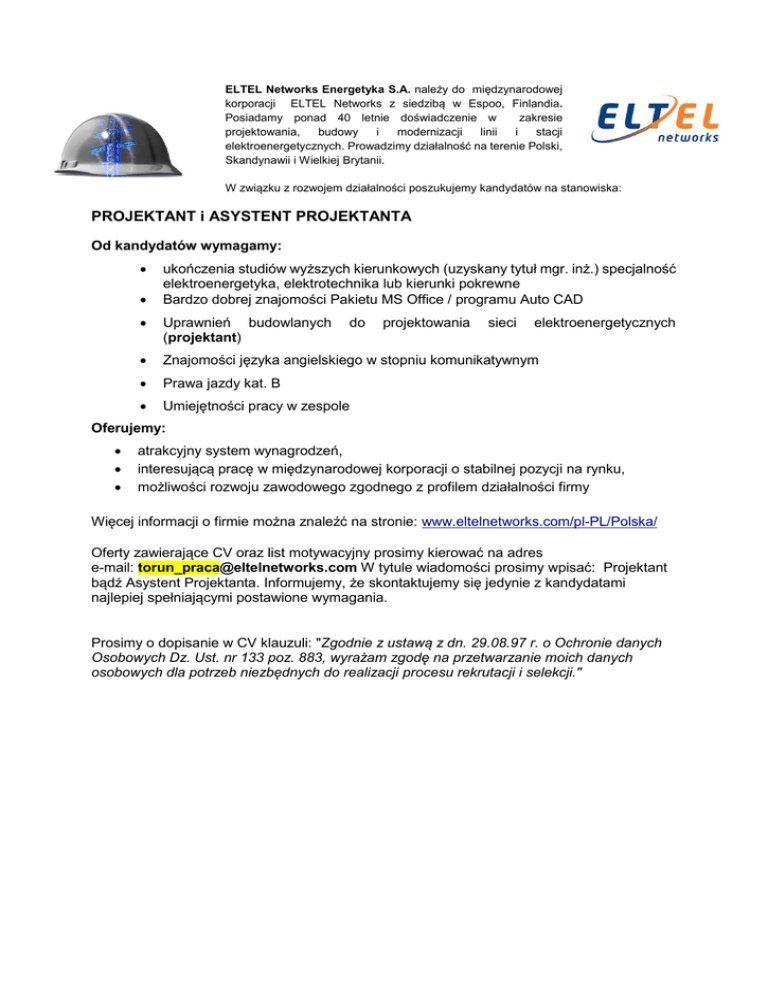 ELTEL Networks Energetyka S.A. należy do międzynarodowej korporacji ELTEL Networks z siedzibą w Espoo, Finlandia. Posiadamy ponad 40 letnie doświadczenie w zakresie projektowania, budowy i modernizacji linii i stacji elektroenergetycznych. Prowadzimy działalność na terenie Polski, Skandynawii i Wielkiej Brytanii. W związku z rozwojem działalności poszukujemy kandydatów na stanowiska: PROJEKTANT i ASYSTENT PROJEKTANTA Od kandydatów wymagamy: ukończenia studiów wyższych kierunkowych (uzyskany tytuł mgr. inż.) specjalność elektroenergetyka, elektrotechnika lub kierunki pokrewne Bardzo dobrej znajomości Pakietu MS Office / programu Auto CAD Uprawnień budowlanych (projektant) Znajomości języka angielskiego w stopniu komunikatywnym Prawa jazdy kat. B Umiejętności pracy w zespole do projektowania sieci elektroenergetycznych Oferujemy: atrakcyjny system wynagrodzeń, interesującą pracę w międzynarodowej korporacji o stabilnej pozycji na rynku, możliwości rozwoju zawodowego zgodnego z profilem działalności firmy Więcej informacji o firmie można znaleźć na stronie: www.eltelnetworks.com/pl-PL/Polska/ Oferty zawierające CV oraz list motywacyjny prosimy kierować na adres e-mail: [email protected] W tytule wiadomości prosimy wpisać: Projektant bądź Asystent Projektanta. Informujemy, że skontaktujemy się jedynie z kandydatami najlepiej spełniającymi postawione wymagania. Prosimy o dopisanie w CV klauzuli: "Zgodnie z ustawą z dn. 29.08.97 r. o Ochronie danych Osobowych Dz. Ust. nr 133 poz. 883, wyrażam zgodę na przetwarzanie moich danych osobowych dla potrzeb niezbędnych do realizacji procesu rekrutacji i selekcji."