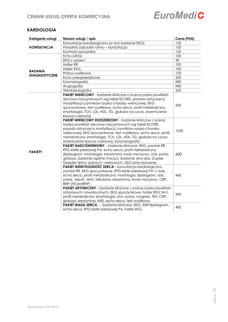 CENNIK USŁUG OFERTA KOMERCYJNA KARDIOLOGIA Kategoria usługi KONSULTACJA BADANIA DIAGNOSTYCZNE Cena (PLN) 120 120 120 100 30 100 100 120 200 980 980 520 350 1230 600 460 590 400 strona 12 PAKIETY Nazwa usługi / opis Konsultacja kardiologiczna (w tym badanie EKG) Poradnia zaburzeń rytmu – konsultacja Kontrola rozrusznika Echo (UKG) EKG z opisem Holter RR Holter EKG Próba wysiłkowa Echo przezprzełykowe Koronarografia Angiografia Wentrykulografia PAKIET WIEŃCOWY - badanie kliniczne z oceną ryzyka powikłań sercowo-naczyniowych wg tabel SCORE, porada dotycząca modyfikacji czynników ryzyka choroby wieńcowej, EKG spoczynkowe, test wysiłkowy, echo serca, profil metaboliczny (morfologia, TCh, LDL, HDL, TG, glukoza na czczo, ewentualnie krzywa cukrowa) PAKIET WIEŃCOWY ROZSZERZONY - badanie kliniczne z oceną ryzyka powikłań sercowo-naczyniowych wg tabel SCORE, porada dotycząca modyfikacji czynników ryzyka choroby wieńcowej, EKG spoczynkowe, test wysiłkowy, echo serca, profil metaboliczny (morfologia, TCh, LDL, HDL, TG, glukoza na czczo, ewentualnie krzywa cukrowa), koronarografia PAKIET NADCIŚNIENIOWY - badanie kliniczne, EKG, pomiar RR , RTG klatki piersiowej PA, echo serca, profil metaboliczny (lipidogram, morfologia, kreatynina, kwas moczowy, sód, potas, glukoza, badanie ogólne moczu), badanie dna oka, Duplex Doppler tętnic szyjnych i nerkowych, USG jamy brzusznej. PAKIET NIEWYDOLNOŚĆ SERCA - konsultacja kardiologiczna, pomiar RR, EKG spoczynkowe, RTG klatki piersiowej PA i L-bok, echo serca, profil metaboliczny: morfologia, lipidogram, sód, potas, AspAT, AlAT, bilirubina, kreatynina, kwas moczowy, CRP, BNP (NT-proBNP) PAKIET ARYTMICZNY - badanie kliniczne z oceną ryzyka powikłań zatorowych i krwotocznych, EKG spoczynkowe, holter EKG 24 h, profil metaboliczny (morfologia, sód, potas, magnez, TSH, CRP, glukoza, kreatynina, INR), echo serca, test wysiłkowy PAKIET WADA SERCA - badanie kliniczne, EKG, INR+lipidogram, echo serca, RTG klatki piersiowej PA, holter EKG aktualizacja 03.09.2014 r. CENNIK USŁUG OFERTA KOMERCYJNA Kategoria usługi OPERACJE Nazwa usługi / opis Angioplastyka wieńcowa z implantacją stentów typu BMS: I naczynia II naczyń III naczyń Koszt 1 stentu wieńcowego typu BMS Angioplastyka wieńcowa z implantacją jednego stentu typu DES*: *za każdy następny stent typu DES Angioplastyka wieńcowa z implantacją jednego stentu typu BVS*: (stent rozpuszczalny) *za każdy następny stent typu BVS Angioplastyka obwodowa: I naczynia II naczyń III naczyń Koszt 1 stentu obwodowego Neuroprotekcja Aterektomia tętnic obwodowych Rozrusznik serca: Wszczepienie rozrusznika jednojamowgo Wszczepienie rozrusznika dwujamowego Wymiana rozrusznika jednojamowgo Wymiana rozrusznika dwujamowego Wszczepienie rozrusznika resynchronizującego Wymiana rozrusznika resynchronizującego Wymiana elektrody rozrusznika serca Usunięcie układu stymulującego z powodu infekcji/nadmiaru elektrod Czasowa stymulacja endokawitarna serca trwająca powyżej jednej doby (poza ostrym zespołem wieńcowym) Defibrylatory serca: Wszczepienie kardiowertera-defibrylatora jednojamowego Wszczepienie kardiowertera-defibrylatora dwujamowego Wymiana kardiowertera-defibrylatora jednojamowego Wymiana kardiowertera-defibrylatora dwujamowego Wszczepienie kardiowertera-defibrylatora dwukomorowego Wymiana kardiowertera-defibrylatora dwukomorowego CRT-D: Wszczepienie CRT-D Wymiana CRT-D Ablacje: Ablacja zaburzeń rytmu z wykorzystaniem systemu elektroanatomicznego Ablacja zaburzeń rytmu bez wykorzystania systemu elektroanatomicznego Krioablacja AF Cena (PLN) 6000 7890 8980 1200 9000 4000 11000 4000 4980 6980 8980 3500 5980 14980 6980 8980 5980 7980 17890 16890 4980 4450 2450 36000 38000 35000 36500 43500 42500 56500 54500 18900 15900 17000 KARDIOCHIRURGIA Nazwa usługi / opis Kwalifikacja do zabiegów kardiochirurgicznych Cena (PLN) 130 strona 13 Kategoria usługi KONSULTACJA aktualizacja 03.09.2014 r.