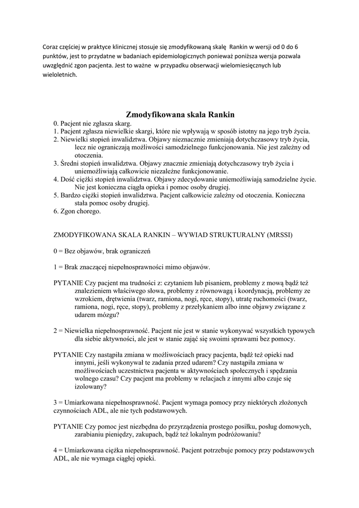Coraz częściej w praktyce klinicznej stosuje się zmodyfikowaną skalę Rankin w wersji od 0 do 6 punktów, jest to przydatne w badaniach epidemiologicznych ponieważ poniższa wersja pozwala uwzględnić zgon pacjenta. Jest to ważne w przypadku obserwacji wielomiesięcznych lub wieloletnich. Zmodyfikowana skala Rankin 0. Pacjent nie zgłasza skarg. 1. Pacjent zgłasza niewielkie skargi, które nie wpływają w sposób istotny na jego tryb życia. 2. Niewielki stopień inwalidztwa. Objawy nieznacznie zmieniają dotychczasowy tryb życia, lecz nie ograniczają możliwości samodzielnego funkcjonowania. Nie jest zależny od otoczenia. 3. Średni stopień inwalidztwa. Objawy znacznie zmieniają dotychczasowy tryb życia i uniemożliwiają całkowicie niezależne funkcjonowanie. 4. Dość ciężki stopień inwalidztwa. Objawy zdecydowanie uniemożliwiają samodzielne życie. Nie jest konieczna ciągła opieka i pomoc osoby drugiej. 5. Bardzo ciężki stopień inwalidztwa. Pacjent całkowicie zależny od otoczenia. Konieczna stała pomoc osoby drugiej. 6. Zgon chorego. ZMODYFIKOWANA SKALA RANKIN – WYWIAD STRUKTURALNY (MRSSI) 0 = Bez objawów, brak ograniczeń 1 = Brak znaczącej niepełnosprawności mimo objawów. PYTANIE Czy pacjent ma trudności z: czytaniem lub pisaniem, problemy z mową bądź też znalezieniem właściwego słowa, problemy z równowagą i koordynacją, problemy ze wzrokiem, drętwienia (twarz, ramiona, nogi, ręce, stopy), utratę ruchomości (twarz, ramiona, nogi, ręce, stopy), problemy z przełykaniem albo inne objawy związane z udarem mózgu? 2 = Niewielka niepełnosprawność. Pacjent nie jest w stanie wykonywać wszystkich typowych dla siebie aktywności, ale jest w stanie zająć się swoimi sprawami bez pomocy. PYTANIE Czy nastąpiła zmiana w możliwościach pracy pacjenta, bądź też opieki nad innymi, jeśli wykonywał te zadania przed udarem? Czy nastąpiła zmiana w możliwościach uczestnictwa pacjenta w aktywnościach społecznych i spędzania wolnego czasu? Czy pacjent ma problemy w relacjach z innymi albo czuje się izolowany? 3 = Umiarkowana niepełnosprawność. Pacjent wymaga pomocy przy niektórych złożonych czynnościach ADL, ale nie tych podstawowych. PYTANIE Czy pomoc jest niezbędna do przyrządzenia prostego posiłku, posług domowych, zarabianiu pieniędzy, zakupach, bądź też lokalnym podróżowaniu? 4 = Umiarkowana ciężka niepełnosprawność. Pacjent potrzebuje pomocy przy podstawowych ADL, ale nie wymaga ciągłej opieki. PYTANIE: Czy pomoc jest niezbędna przy jedzeniu, korzystaniu z toalety, codziennej higieny albo chodzenia? 5 = Ciężka niepełnosprawność; osoba do pomocy musi być obecna cały czas. Opieka może być zapewniona przez osobę wyszkoloną do tego celu, albo niewyszkoloną. PYTANIE Czy pacjent potrzebuje ciągłej opieki? Tłumaczenie: Jakub Marciński www.testykliniczne.pl Piśmiennictwo: *Rankin J. “Cerebral vascular accidents in patients over the age of 60.” Scott Med J 1957;2:200-15 Bonita R, Beaglehole R. “Modification of Rankin Scale: Recovery of motor function after stroke.”Stroke 1988;19(12):1497-1500 Van Swieten JC, Koudstaal PJ, Visser MC, Schouten HJ, van Gijn J. “Interobserver agreement for the assessment of handicap in stroke patients.”Stroke 1988;19(5):604-7 Wilson, L. J. T., Harendran, A., Grant, M., Baird, T., Schultz, U. G.R., Muir, K. W., Bone, I. Improving the assessment of outcomes in stroke: Use of a structured interview to assign grades on the Modified Rankin Scale. Stroke 2002; 33, 2243-2246.