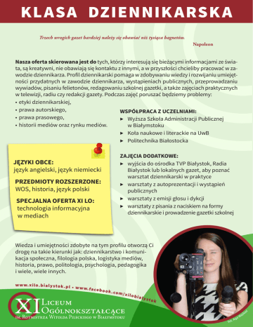 KLASA DZIENNIK ARSK A Trzech wrogich gazet bardziej należy się obawiać niż tysiąca bagnetów. Napoleon Nasza oferta skierowana jest do tych, którzy interesują się bieżącymi informacjami ze świa‑ ta, są kreatywni, nie obawiają się kontaktu z innymi, a w przyszłości chcieliby pracować w za‑ wodzie dziennikarza. Profil dziennikarski pomaga w zdobywaniu wiedzy i rozwijaniu umiejęt‑ ności przydatnych w zawodzie dziennikarza, wystąpieniach publicznych, przeprowadzaniu wywiadów, pisaniu felietonów, redagowaniu szkolnej gazetki, a także zajęciach praktycznych w telewizji, radiu czy redakcji gazety. Podczas zajęć poruszać będziemy problemy: • etyki dziennikarskiej, • prawa autorskiego, WSPÓŁPRACA Z UCZELNIAMI: • prawa prasowego, ▶▶ Wyższa Szkoła Administracji Publicznej • historii mediów oraz rynku mediów. w Białymstoku ▶▶ Koła naukowe i literackie na UwB ▶▶ Politechnika Białostocka języki obce: język angielski, język niemiecki przedmioty rozszerzone: WOS, historia, język polski specjalna oferta Xi lo: technologia informacyjna w mediach ZAJĘCIA DODATKOWE: ▶▶ wyjścia do ośrodka TVP Białystok, Radia Białystok lub lokalnych gazet, aby poznać warsztat dziennikarski w praktyce ▶▶ warsztaty z autoprezentacji i wystąpień publicznych ▶▶ warsztaty z emisji głosu i dykcji ▶▶ warsztaty z pisania z naciskiem na formy dziennikarskie i prowadzenie gazetki szkolnej Wiedza i umiejętności zdobyte na tym profilu otworzą Ci drogę na takie kierunki jak: dziennikarstwo i komuni‑ kacja społeczna, filologia polska, logistyka mediów, historia, prawo, politologia, psychologia, pedagogika i wiele, wiele innych. w w w. x i l o . b i a l y s t o k . p l ■ w w w. f a c e XI book.c om/x Liceum Ogólnokształcące im. Rotmistrza Witolda Pileckiego w Białymstoku ilobi alys tok fo t. Ag a ś Wa ki el