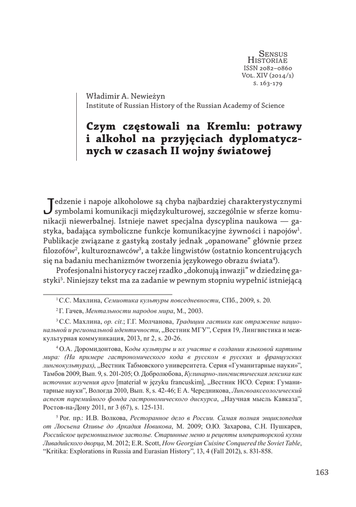 Sensus Historiae ISSN 2082–0860 Vol. XIV (2014/1) s. 163-179 Władimir A. Newieżyn Institute of Russian History of the Russian Academy of Science Czym częstowali na Kremlu: potrawy i alkohol na przyjęciach dyplomatycznych w czasach II wojny światowej J edzenie i napoje alkoholowe są chyba najbardziej charakterystycznymi symbolami komunikacji międzykulturowej, szczególnie w sferze komunikacji niewerbalnej. Istnieje nawet specjalna dyscyplina naukowa — gastyka, badająca symboliczne funkcje komunikacyjne żywności i napojów1. Publikacje związane z gastyką zostały jednak „opanowane” głównie przez filozofów2, kulturoznawców3, a także lingwistów (ostatnio koncentrujących się na badaniu mechanizmów tworzenia językowego obrazu świata4). Profesjonalni historycy raczej rzadko „dokonują inwazji” w dziedzinę gastyki5. Niniejszy tekst ma za zadanie w pewnym stopniu wypełnić istniejącą 1 C.C. Махлина, Семиотика культуры повседневности, СПб., 2009, s. 20. 2 Г. Гачев, Ментальности народов мира, М., 2003. С.С. Махлина, op. cit.; Г.Г. Молчанова, Традиции гастики как отражение национальной и региональной идентичности, „Вестник МГУ”, Серия 19, Лингвистика и межкультурная коммуникация, 2013, nr 2, s. 20-26. 3 О.А. Доромидонтова, Коды культуры и их участие в создании языковой картины мира: (На примере гастрономического кода в русском в русских и французских лингвокультурах), „Вестник Табмовского университета. Серия «Гуманитарные науки»”, Тамбов 2009, Вып. 9, s. 201-205; О. Добролюбова, Кулинарно-лингвистическая лексика как источник изучения арго [materiał w języku francuskim], „Вестник HCO. Серия: Гуманитарные науки”, Вологда 2010, Вып. 8, s. 42-46; Е А. Чередникова, Лингвоаксеологический аспект паремийного фонда гастрономического дискурса, „Научная мысль Кавказа”, Ростов-на-Дону 2011, nr 3 (67), s. 125-131. 4 5 Por. пр.: И.В. Волкова, Ресторанное дело в России. Самая полная энциклопедия от Люсьена Оливье до Аркадия Новикова, М. 2009; О.Ю. Захарова, С.Н. Пушкарев, Российское церемониальное застолье. Старинные меню и рецепты императорской кухни Ливадийского дворца, М. 2012; E.R. Scott, How Georgian Cuisine Conquered the Soviet Table, “Kritika: Explorations in Russia and Eurasian History”, 13, 4 (Fall 2012), s. 831-858. 163 Władimir A. Newieżyn lukę badawczą. Przyjęcia dyplomatyczne (bankiety) na Kremlu w czasach II wojny światowej niewątpliwie można uznać za jeden z kanałów komunikacji międzykulturowej. Autor niniejszego artykułu opierał się przede wszystkim na świadectwach obcokrajowców będących uczestnikami tych bankietów. Wykorzystując również pamiętniki i dzienniki radzieckich świadków tych wydarzeń, starał się odkryć specyfikę postrzegania biesiad przez zagranicznych urzędników państwowych, polityków i dyplomatów kremlowskich oraz ocenę proponowanych dań i napojów alkoholowych. Przyjęcie dyplomatyczne ma duże znaczenie zarówno dla organizatorów, jak i przybyłych nań gości. Jego waga znacznie wzrasta, jeśli władze danego kraju wydają raut na cześć wysoko postawionych zagranicznych osobistości6. Przyjęcie dyplomatyczne jest protokolarnym wydarzeniem, odbywającym się przy okazji przybycia zagranicznych przedstawicieli, podpisywania umów, itp. W czasie II wojny światowej przywódcy ZSRR organizowali je zgodnie z obowiązującymi zasadami protokołu. W ten sposób utrwalano istniejącą praktykę oddawania honorów i goszczenia wysokich urzędników państwowych, będących w kraju z wizytą w ramach oficjalnej delegacji. Zgodnie z naszymi obliczeniami, w latach 1939–1945 w sali Jekaterinskiej Wielkiego Pałacu Kremlowskiego zorganizowano ok. dwudziestu bankietów. Jednak analiza źródeł naukowych i literatury nie pozwala zorientować się, jakie dokładnie posiłki i napoje były podawane uczestnikom wszystkich przyjęć o takim charakterze. Zachowały się jedynie informacje o następujących rautach na Kremlu: (1) na cześć ministra spraw zagranicznych Niemiec J. von Ribbentropa (28 września 1939 r.); (2) na cześć przedstawicieli ZSRR, Wielkiej Brytanii i Stanów Zjednoczonych, będących uczestnikami konferencji sojuszniczej w Moskwie (1 października 1941 r.); (3) na cześć inicjatora układu między ZSRR a rządem polskim na uchodźstwie, gen. W. Sikorskiego (4 grudnia 1941); (4) na cześć oficjalnej delegacji angielskiej z ministrem spraw zagranicznych Wielkiej Brytanii, A. Edenem na czele (20 grudnia 1941 r.); (5) na cześć premiera Wielkiej Brytanii W. Churchilla i A. Harrimana, specjalnego posłannika prezydenta Stanów Zjednoczonych, F.D. Roosevelta; (6) na cześć sekretarza stanu Stanów Zjednoczonych Ameryki C. Hulla i A. Edena po zakończeniu moskiewskiej konferencji ministrów spraw zagranicznych alianckich mocarstw (ZSRR, Wielkiej Brytanii i USA) (30 października 1943 r.); (7) na cześć prezydenta rządu czechosłowackiego na uchodźstwie, E. Benesza (11 grudnia 1943 r.); (8) po podpisaniu układu radziecko-czechosłowackiego (22 grudnia 1943 r.); 6 А.Ф. Борунков, Дипломатический протокол в России и диплома