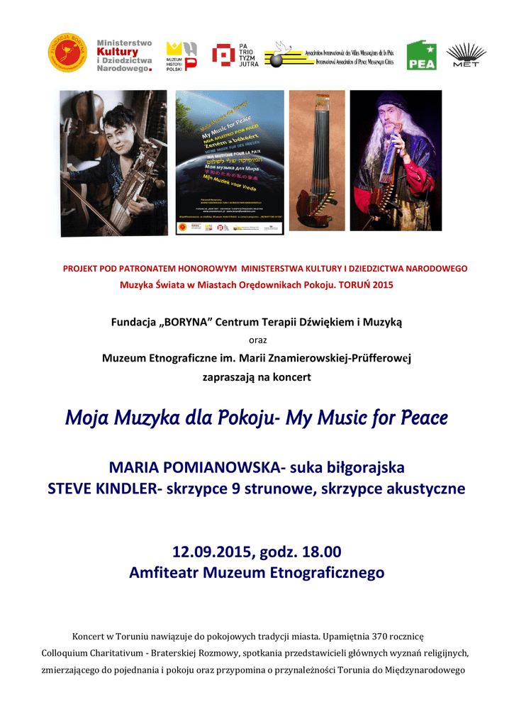 PROJEKT POD PATRONATEM HONOROWYM MINISTERSTWA KULTURY I DZIEDZICTWA NARODOWEGO Muzyka Świata w Miastach Orędownikach Pokoju. TORUO 2015 Fundacja „BORYNA” Centrum Terapii Dźwiękiem i Muzyką oraz Muzeum Etnograficzne im. Marii Znamierowskiej-Prüfferowej zapraszają na koncert Moja Muzyka dla Pokoju- My Music for Peace MARIA POMIANOWSKA- suka biłgorajska STEVE KINDLER- skrzypce 9 strunowe, skrzypce akustyczne 12.09.2015, godz. 18.00 Amfiteatr Muzeum Etnograficznego Koncert w Toruniu nawiązuje do pokojowych tradycji miasta. Upamiętnia 370 rocznicę Colloquium Charitativum - Braterskiej Rozmowy, spotkania przedstawicieli głównych wyznań religijnych, zmierzającego do pojednania i pokoju oraz przypomina o przynależności Torunia do Międzynarodowego Stowarzyszenia Miast Orędowników Pokoju. Ideą wydarzenia jest budowanie pokoju między narodami, w oparciu o niematerialne dziedzictwo kulturowe. Podobna misję spełnia esperanto - międzynarodowy język, który został stworzony aby ułatwić komunikację i budować jedność między ludźmi różnych narodowości i który w 2014 r. został wpisany przez Ministerstwo Kultury i Dziedzictwa Narodowego na listę niematerialnego dziedzictwa kultury. Projekt został objęty Patronatem Honorowym Polskiego Związku Esperantystów. Poprzez koncert Moja muzyka dla pokoju - My music for peace Toruń włączy się w obchody Międzynarodowego Dnia Pokoju, który przypada 21 września. Wrześniowy termin koncertu wplata się jako swoisty pokojowy apel - w rocznice tragicznych wydarzeń, wojen i aktów przemocy, które dotknęły społeczność międzynarodową, takich jak wybuch II wojny światowej (1939), masakra na olimpiadzie w Monachium (1972), ataki terrorystyczne na Pentagon i WTC w Nowym Jorku (2001) czy czeczeńska agresja w Biesłanie (2004). Ciągle aktualna jest potrzeba dokonywania wszelkich możliwych wysiłków na rzecz zmniejszenia skali agresji, tworzenia postaw przyjaźni i szacunku między ludźmi odmiennych narodowości, wyznań i przekonań. Naszym narzędziem jest muzyka, ze swoją siłą łagodzenia obyczajów. Artyści zaproszeni na występ w Muzeum wykonują muzykę świata opartą na tradycjach muzycznych różnych narodów, wspólnym dziedzictwie ludzkości. Koncert w Toruniu jest częścią wieloetapowego projektu, którego kolejnymi, listopadowymi odsłonami będą: - Wystawa prac plastycznych ukazująca rolę muzyki w tworzeniu pokoju, kształtowaniu postaw przyjaźni, tolerancji, i wzajemnego szacunku. Autorami prac będą uczniowie szkół z Torunia i innych Miast Orędowników Pokoju, - Sonda uliczna z mieszkańcami miasta dotyczącą przemocy, roli muzyki w tworzeniu pokoju - Forum dotyczące zagadnień pokoju na świecie, przeciwdziałania wojnie, prawa wszystkich ludzi do życia w poczuciu bezpieczeństwa i znaczenia toruńskiego Colloquium Charitativum 300 lat temu i obecnie. Wydarzenie stanowi realizację projektu Fundacji „BORYNA” My Music for Peace - Moja Muzyka dla Pokoju, objętego w 2008 r. Patronatem Honorowym ś.p. Władysława Bartoszewskiego. Przedsięwzięcie realizowane jest pod auspicjami Międzynarodowego Stowarzyszenia Miast Orędowników Pokoju, współfinansowane ze środków Muzeum Historii Polski w ramach programu Patriotyzm Jutra. Projekt został objęty Honorowym Patronatem Ministerstwa Kultury i Dziedzictwa Narodowego oraz Honorowym Patronatem Polskiego Związku Esperantystów. Artyści: Maria Pomianowska - profesor sztuk muzycznych, multiinstrumentalistka, wokalistka, kompozytorka i pedagog. Adiunkt Akademii Muzycznej w Krakowie oraz dyrektor międzynarodowego festiwalu Skrzyżowanie Kultur w Warszawie. Członek Społecznej Rady Kultury przy Prezydencie Miasta Warszawy. Wspólnie z prof. Ewą Dahlig i lutnikiem Andrzejem Kuczkowskim zrealizowała z sukcesem rekonstrukcję dwóch zaginionych staropolskich instrumentów smyczkowych: suki biłgorajskiej i fideli płockiej. W listopadzie 2011 r. otrzymała Srebrny Krzyż Zasługi przyznany przez Prezydenta RP. Od lat 80. koncertuje solo i z towarzyszeniem innych muzyków, m.in. w stworzonych przez siebie zespołach: Raga Sangit prezentującym muzykę indyjską, Zespołem Polskim, prezentującym głównie muzykę ludową Mazowsza oraz jej związki z muzyką wielkich kompozytorów polskich, w tym Fryderyka Chopina, czy formacji LutoSłowianie, który prezentuje związki muzyki Witolda Lutosławskiego z polską muzyką ludową.. Zespół koncertował na całym świecie. Artystka podróżowała po Indiach, Korei, Japonii, Chinach na Bliskim Wschodzie, Afryce, Australii i Syberię. Spotkania z ludźmi, poznawanie nowych instrumentów, różnych kanonów piękna, rytmów, barw dźwięku fascynują ją, jednocześnie prowokując do zadania sobie pytania o własną tożsamość. Ma na swoim koncie ponad 20 płyt, jedną z ostatnich jest album Z Kolbergiem po Afryce i Azji. Multi Culti Orkiestra Marii Pomianowskiej. Make music not war będącą zapisem jej ponad trzydziestoletniej podróży muzycznej dookoła świata. Steve Kindler - międzynarodowej sławy wirtuoz skrzypiec, gra na dziewęciostrunowych skrzypcach elektrycznych własnego projektu. Kompozytor, jeden z czołowych twórców muzyki fusion, grał m.in. w słynnej grupie jazz-rockowej Johna McLaughlina Mahavishnu Orchestra, z Jeanem Lucem Pontym i Naradą Michaelem, współpracował także z formacją Jeffem Beck/Jan Hammerem, zespołem Spring Flowers, z mistrzem sarodu Vasanti Rai oraz z Kitaro. W latach 80. Steve Kindler stał się wiodącym reprezentantem muzyki ambientowej. Wraz bębniarzem Berkeley Clayem Henrym założył grającą muzykę etniczną formację Barfoot. Nowatorska muzyka zespołu stanowiła wyznacznik dla wielu innych muzyków i dla kierunku muzycznego, który wkrótce nazwano World Music. Steve Kindler wprowadza nowe możliwości w świat muzyki. Jest światowym ekspertem w zakresie gry na instrumentach smyczkowych, posiada rozległą wiedzę na temat histor