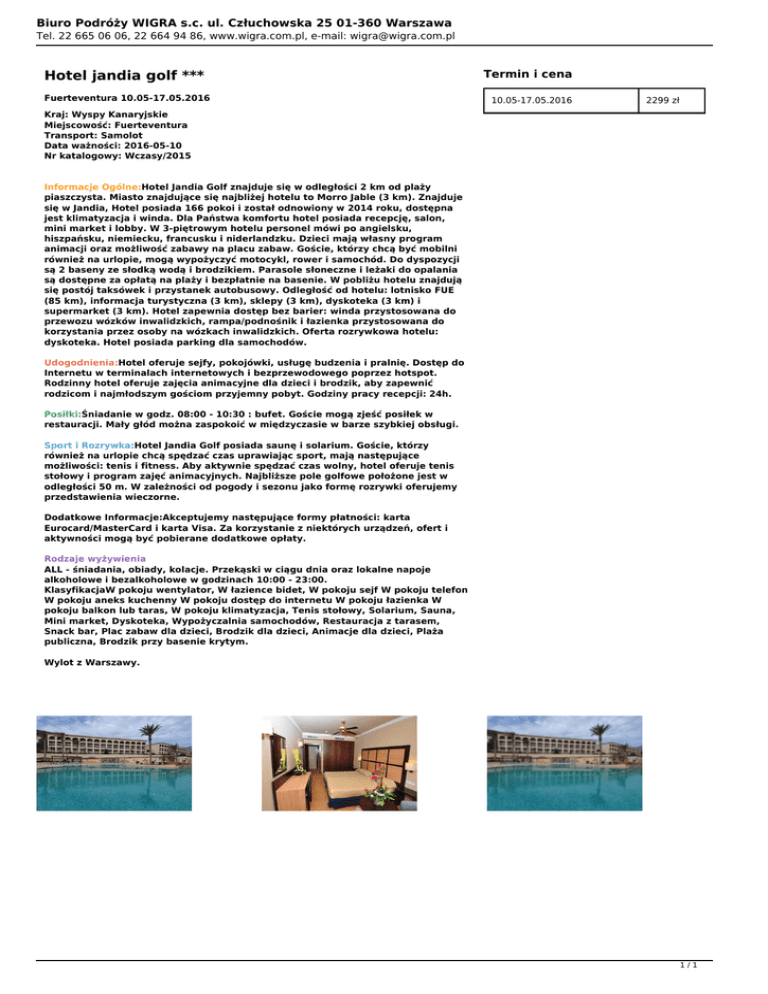 Biuro Podróży WIGRA s.c. ul. Człuchowska 25 01-360 Warszawa Tel. 22 665 06 06, 22 664 94 86, www.wigra.com.pl, e-mail: [email protected] Hotel jandia golf *** Fuerteventura 10.05-17.05.2016 Termin i cena 10.05-17.05.2016 2299 zł Kraj: Wyspy Kanaryjskie Miejscowość: Fuerteventura Transport: Samolot Data ważności: 2016-05-10 Nr katalogowy: Wczasy/2015 Informacje Ogólne:Hotel Jandia Golf znajduje się w odległości 2 km od plaży piaszczysta. Miasto znajdujące się najbliżej hotelu to Morro Jable (3 km). Znajduje się w Jandia, Hotel posiada 166 pokoi i został odnowiony w 2014 roku, dostępna jest klimatyzacja i winda. Dla Państwa komfortu hotel posiada recepcję, salon, mini market i lobby. W 3-piętrowym hotelu personel mówi po angielsku, hiszpańsku, niemiecku, francusku i niderlandzku. Dzieci mają własny program animacji oraz możliwość zabawy na placu zabaw. Goście, którzy chcą być mobilni również na urlopie, mogą wypożyczyć motocykl, rower i samochód. Do dyspozycji są 2 baseny ze słodką wodą i brodzikiem. Parasole słoneczne i leżaki do opalania są dostępne za opłatą na plaży i bezpłatnie na basenie. W pobliżu hotelu znajdują się postój taksówek i przystanek autobusowy. Odległość od hotelu: lotnisko FUE (85 km), informacja turystyczna (3 km), sklepy (3 km), dyskoteka (3 km) i supermarket (3 km). Hotel zapewnia dostęp bez barier: winda przystosowana do przewozu wózków inwalidzkich, rampa/podnośnik i łazienka przystosowana do korzystania przez osoby na wózkach inwalidzkich. Oferta rozrywkowa hotelu: dyskoteka. Hotel posiada parking dla samochodów. Udogodnienia:Hotel oferuje sejfy, pokojówki, usługę budzenia i pralnię. Dostęp do Internetu w terminalach internetowych i bezprzewodowego poprzez hotspot. Rodzinny hotel oferuje zajęcia animacyjne dla dzieci i brodzik, aby zapewnić rodzicom i najmłodszym gościom przyjemny pobyt. Godziny pracy recepcji: 24h. Posiłki:Śniadanie w godz. 08:00 - 10:30 : bufet. Goście mogą zjeść posiłek w restauracji. Mały głód można zaspokoić w międzyczasie w barze szybkiej obsługi. Sport i Rozrywka:Hotel Jandia Golf posiada saunę i solarium. Goście, którzy również na urlopie chcą spędzać czas uprawiając sport, mają następujące możliwości: tenis i fitness. Aby aktywnie spędzać czas wolny, hotel oferuje tenis stołowy i program zajęć animacyjnych. Najbliższe pole golfowe położone jest w odległości 50 m. W zależności od pogody i sezonu jako formę rozrywki oferujemy przedstawienia wieczorne. Dodatkowe Informacje:Akceptujemy następujące formy płatności: karta Eurocard/MasterCard i karta Visa. Za korzystanie z niektórych urządzeń, ofert i aktywności mogą być pobierane dodatkowe opłaty. Rodzaje wyżywienia ALL - śniadania, obiady, kolacje. Przekąski w ciągu dnia oraz lokalne napoje alkoholowe i bezalkoholowe w godzinach 10:00 - 23:00. KlasyfikacjaW pokoju wentylator, W łazience bidet, W pokoju sejf W pokoju telefon W pokoju aneks kuchenny W pokoju dostęp do internetu W pokoju łazienka W pokoju balkon lub taras, W pokoju klimatyzacja, Tenis stołowy, Solarium, Sauna, Mini market, Dyskoteka, Wypożyczalnia samochodów, Restauracja z tarasem, Snack bar, Plac zabaw dla dzieci, Brodzik dla dzieci, Animacje dla dzieci, Plaża publiczna, Brodzik przy basenie krytym. Wylot z Warszawy. 1/1 Powered by TCPDF (www.tcpdf.org)