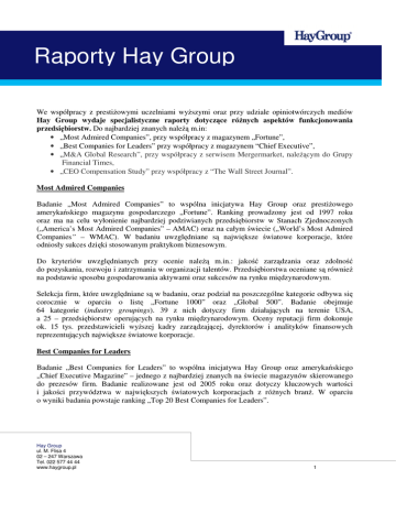 Raporty Hay Group Hay Group na świecieHay Group to renomowana globalna firma doradczaków. We współpracy z prestiżowymi uczelniami wyższymi oraz przy udziale opiniotwórczych mediów Hay Group wydaje specjalistyczne raporty dotyczące różnych aspektów funkcjonowania przedsiębiorstw. Do najbardziej znanych należą m.in: • „Most Admired Companies”, przy współpracy z magazynem „Fortune”, • „Best Companies for Leaders” przy współpracy z magazynem “Chief Executive”, • „M&A Global Research”, przy współpracy z serwisem Mergermarket, należącym do Grupy Financial Times, • „CEO Compensation Study” przy współpracy z “The Wall Street Journal”. Most Admired Companies Badanie „Most Admired Companies” to wspólna inicjatywa Hay Group oraz prestiżowego amerykańskiego magazynu gospodarczego „Fortune”. Ranking prowadzony jest od 1997 roku oraz ma na celu wyłonienie najbardziej podziwianych przedsiębiorstw w Stanach Zjednoczonych („America’s Most Admired Companies” – AMAC) oraz na całym świecie („World’s Most Admired Companies” – WMAC). W badaniu uwzględniane są największe światowe korporacje, które odniosły sukces dzięki stosowanym praktykom biznesowym. Do kryteriów uwzględnianych przy ocenie należą m.in.: jakość zarządzania oraz zdolność do pozyskania, rozwoju i zatrzymania w organizacji talentów. Przedsiębiorstwa oceniane są również na podstawie sposobu gospodarowania aktywami oraz sukcesów na rynku międzynarodowym. Selekcja firm, które uwzględniane są w badaniu, oraz podział na poszczególne kategorie odbywa się corocznie w oparciu o listę „Fortune 1000” oraz „Global 500”. Badanie obejmuje 64 kategorie (industry groupings). 39 z nich dotyczy firm działających na terenie USA, a 25 – przedsiębiorstw operujących na rynku międzynarodowym. Oceny reputacji firm dokonuje ok. 15 tys. przedstawicieli wyższej kadry zarządzającej, dyrektorów i analityków finansowych reprezentujących największe światowe korporacje. Best Companies for Leaders Badanie „Best Companies for Leaders” to wspólna inicjatywa Hay Group oraz amerykańskiego „Chief Executive Magazine” – jednego z najbardziej znanych na świecie magazynów skierowanego do prezesów firm. Badanie realizowane jest od 2005 roku oraz dotyczy kluczowych wartości i jakości przywództwa w największych światowych korporacjach z różnych branż. W oparciu o wyniki badania powstaje ranking „Top 20 Best Companies for Leaders”. Hay Group ul. M. Flisa 4 02 – 247 Warszawa Tel. 022 577 44 44 www.haygroup.pl 1 Raporty Hay Group Do kryteriów uwzględnianych przy ocenie przedsiębiorstw należą m.in.: możliwość rozwoju i zatrzymania w organizacji talentów, warunki umożliwiające pracownikom osiąganie dobrych wyników, skuteczność zarządzania talentami oraz umiejętność dostosowania kompetencji przywódczych do zmieniających się warunków rynkowych. Dane do rankingu zbierane są w oparciu o trzy źródła: analizę własną przedstawicieli największych światowych firm, którzy oceniają efektywność rozwoju liderów w swoich organizacjach, analizę dokonaną przez inne firmy oraz opinię najbardziej znanych światowych ekspertów specjalizujących się w rozwoju przywództwa. Dodatkowo z prezesami i dyrektorami działów personalnych firm, które znalazły się w pierwszej dwudziestce, przeprowadzane są odrębne wywiady. Umożliwiają one poznanie najważniejszych ich zdaniem praktyk i kompetencji przywódczych w organizacjach, które reprezentują. M&A Global Research Badanie przeprowadzane przez Hay Group od 2007 r. Do ubiegłego roku w jego realizacji uczestniczył uniwersytet Sorbona, a od 2008 roku – Mergermarket – ekonomiczny serwis informacyjny, należący do Grupy Financial Times. Celem badania jest pokazanie zmian w zakresie zasad prowadzenia fuzji i przejęć, a także zidentyfikowanie najważniejszych czynników, które wpływają na powodzenie tego typu transakcji. Fuzje i przejęcia analizowane są m.in. z perspektywy integracji aktywów niematerialnych i prawnych, którymi dysponują organizacje. Przy ocenie procesów akwizycji uwzględniany jest zwłaszcza kapitał organizacyjny, relacyjny i pracowniczy, który wpływa na możliwość wzmocnienia zdolności operacyjnych i rynkowych połączonych organizacji. W badaniu uczestniczą członkowie wyższej kadry kierowniczej firm z całego świata, którzy brali udział w przeprowadzaniu transakcji fuzji i przejęć. Są to m.in. przedstawiciele zarządów, działów finansowych i strategicznych, a także działów fuzji i przejęć oraz zasobów ludzkich. Badane organizacje reprezentują wiele sektorów gospodarczych, w tym m.in. finanse, przemysł, energetykę, górnictwo, media i telekomunikację, farmację oraz usługi medyczne. CEO Compensation Study Badanie od 2 lat przeprowadzane wspólnie przez magazyn„The Wall Street Journal Europe” oraz firmę doradczą Hay Group. Celem badania jest wskazanie wysokości wynagrodzeń kadry zarządzającej, porównanie poszczególnych składników systemu wynagrodzeń całkowitych, a także zdiagnozowanie najważniejszych trendów w tym zakresie. Hay Group ul. M. Flisa 4 02 – 247 Warszawa Tel. 022 577 44 44 www.haygroup.pl 2 Raporty Hay Group W tegorocznej edycji badania uczestniczyło ok. 200 firm ze Stanów Zjednoczonych, które w roku fiskalnym 2008 osiągnęły roczne przychody w wysokości ponad 5 mld USD. Badanie przeprowadzane jest corocznie na podstawie danych zaczerpniętych z tzw. Proxy Statements, czyli corocznych raportów składanych przez firmy amerykańskie notowane na giełdzie, dzięki czemu dostarcza kompleksowych danych nt. wynagrodzeń kadry zarządzającej. Hay Group ul. M. Flisa 4 02 – 247 Warszawa Tel. 022 577 44 44 www.haygroup.pl 3