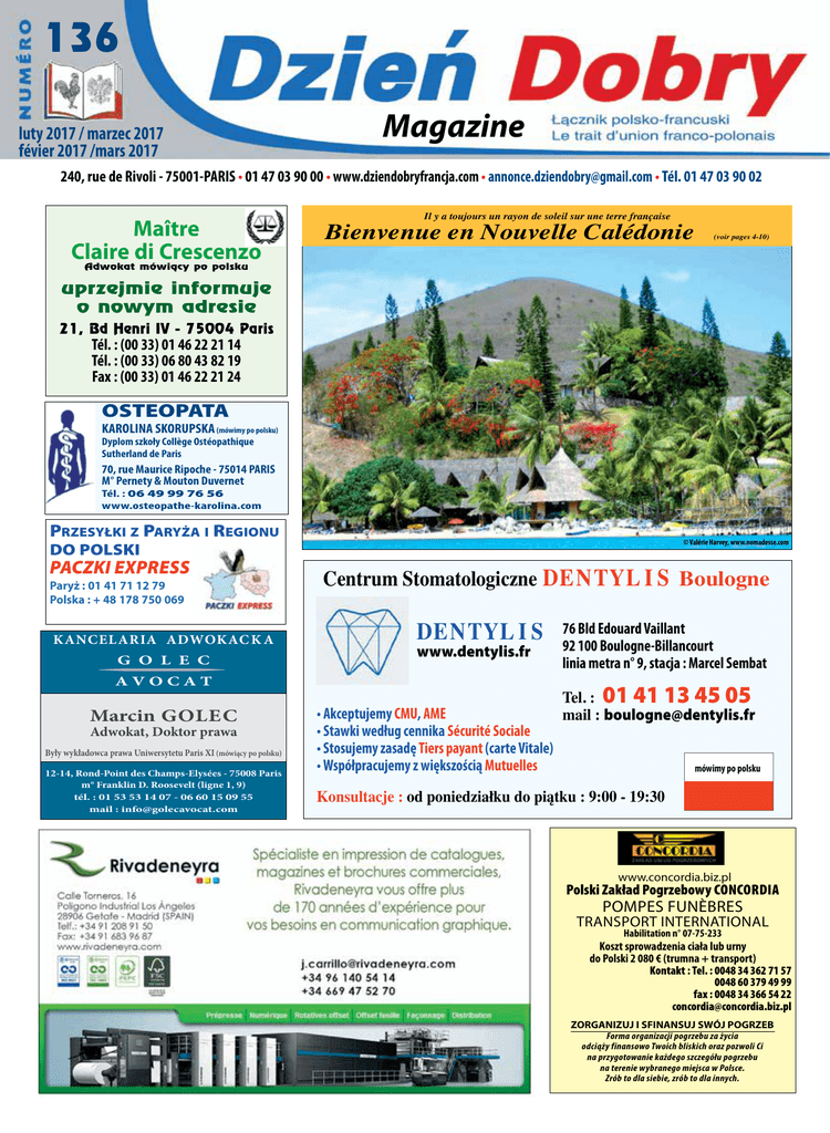 136 luty 2017 / marzec 2017 févier 2017 /mars 2017 Magazine 240, rue de Rivoli - 75001-PARIS • 01 47 03 90 00 • www.dziendobryfrancja.com • [email protected] • Tél. 01 47 03 90 02 Maître Claire di Crescenzo Adwokat mówiàcy po polsku Il y a toujours un rayon de soleil sur une terre française Bienvenue en Nouvelle Calédonie (voir pages 4-10) uprzejmie informuje o nowym adresie 21, Bd Henri IV - 75004 Paris Tél. : (00 33) 01 46 22 21 14 Tél. : (00 33) 06 80 43 82 19 Fax : (00 33) 01 46 22 21 24 OSTEOPATA KAROLINA SKORUPSKA (mówimy po polsku) Dyplom szkoły Collège Ostéopathique Sutherland de Paris 70, rue Maurice Ripoche - 75014 PARIS M° Pernety & Mouton Duvernet Tél. : 06 49 99 76 56 www.osteopathe-karolina.com Przesyłki z Paryża i Regionu DO POLSKI PACZKI Express Paryż : 01 41 71 12 79 Polska : + 48 178 750 069 KANCEL ARIA ADWOKAC K A G O L E C AVOCAT Marcin GOLEC Adwokat, Doktor prawa Były wykładowca prawa Uniwersytetu Paris XI (mówiący po polsku) 12-14, Rond-Point des Champs-Elysées - 75008 Paris m° Franklin D. Roosevelt (ligne 1, 9) tél. : 01 53 53 14 07 - 06 60 15 09 55 mail : [email protected] © Valérie Harvey, www.nomadesse.com Centrum Stomatologiczne DENTYL I S Boulogne DENTYL I S www.dentylis.fr 76 Bld Edouard Vaillant 92 100 Boulogne-Billancourt linia metra n° 9, stacja : Marcel Sembat Tel. : 01 41 13 45 05 • Akceptujemy CMU, AME mail : [email protected] • Stawki według cennika Sécurité Sociale • Stosujemy zasadę Tiers payant (carte Vitale) • Współpracujemy z większością Mutuelles mówimy po polsku Konsultacje : od poniedziałku do piątku : 9:00 - 19:30 www.concordia.biz.pl Polski Zakład Pogrzebowy Concordia Pompes Funèbres TRANSPORT INTERNATIONAL Habilitation n° 07-75-233 Koszt sprowadzenia ciała lub urny do Polski 2 080 € (trumna + transport) Kontakt : Tel. : 0048 34 362 71 57 0048 60 379 49 99 fax : 0048 34 366 54 22 [email protected] ZORGANIZUJ I SFINANSUJ SWÓJ POGRZEB Forma organizacji pogrzebu za życia odciąży finansowo Twoich bliskich oraz pozwoli Ci na przygotowanie każdego szczegółu pogrzebu na terenie wybranego miejsca w Polsce. Zrób to dla siebie, zrób to dla innych. Polska, Polska... cała Polska ! Dzięki A.F.P.E. Dzień Dobry - najlepsze linie lotnicze biorą Was pod swoje skrzydła ! VOLS Loty Lundi (1) Poniedzialek Mardi (2) Wtorek Mercredi (3) Sroda Jeudi (4) Czwartek Vendredi (5) Samedi (6) Dimanche (7) Piatek Sobota Niedziela Warszawa - Beauvais Pas de vol : 29 nov. 13:00-15:30 13:00-15:30 06:00-08:30 13:00-15:30 13:00-15:30 13:00-15:30 Beauvais - Warszawa 17,24,31 janvier, 2 février 15:55-18:10 15:55-18:10 15:55-18:10 15:55-18:10 15:55-18:10 15:55-18:10 Warszawa - Beauvais 06:00-08:30 06:00-08:30 Beauvais - Warszawa 09:00-11:15 09:00-11:15 Kraków - Beauvais 06:55:09:15 06:55:09:15 06:55:09:15 06:55:09:15 Beauvais - Kraków 09:40-11:50 09:40-11:50 09:40-11:50 09:40-11:50 Paris CDG - Kraków 07:30-09:45 07:30-09:45 07:30-09:45 07:30-09:45 07:30-09:45 10:55-13:10 12:35-14:50 Kraków - Paris CDG 10:10-12:30 10:10-12:30 10:10-12:30 10:10-12:30 10:10-12:30 13:40-16:00 15:20-17:40 Gdansk - Beauvais 14:05-16:20 14:05-16:20 Beauvais - Gdansk 16:50-18:55 16:50-18:55 Poznan - Beauvais 14:15-16:20 14:15-16:20 Beauvais - Poznan 16:50-18:45 16:50-18:45 Katowice - Beauvais 12:15-14:25 12:15-14:25 Beauvais - Katowice 14:55-17:00 14:55-17:00 Wroclaw - Beauvais 19:30-21:35 19:30-21:35 19:30-21:35 Beauvais - Wroclaw 22:50-23:55 22:50-23:55 22:50-23:55 Paris CDG Paris CDG Paris CDG Paris CDG Paris CDG Paris CDG - Warszawa Warszawa Warszawa Warszawa Warszawa Warszawa 07:30 - 09:40 09:55 - 12:05 10:40 - 12:50 16:00 - 18:10 19:25 - 21:35 19:35 - 21:55 tous les jours tous les jours tous les jours tous les jours tous les jours tous les jours Warszawa Warszawa Warszawa Warszawa Warszawa Warszawa - Paris CDG Paris CDG Paris CDG Paris CDG Paris CDG Paris CDG 06:40 - 09:10 07:25- 09:55 12:55 - 15:10 16:25 - 18:50 19:05 - 21:30 19:50 - 22:15 tous les jours tous les jours tous les jours tous les jours tous les jours tous les jours Bilety lotnicze - wszystkie kompanie lotnicze do nabycia w Biurze Dzień Dobry - 240, rue de Rivoli, 75001 Paris (w podwórzu) Tel. : 01 47 03 90 01 Biure czynne od 10°° do 18°° (od poniedzialku do piątku) Usagers des parkings de l'aéroport de Beauvais ATTENTION Devant la recrudescence des dommages subis aux véhicules durant l'absence de leurs propriétaires et devant l'insécurité totale sur les parkings de l'aéroport de Beauvais, lequel en cas de dommages se dégage de toute responsabilité malgré des frais de stationnement très élevés nous vous conseillons des parkings de proximités surveillés, sécurisés et surtout nettement moins chers et dont certains vous accompagnent au départ et viennent vous rechercher à votre retour. PARKING Lotnisko Beauvais OSTRZEŻENIE Biorąc pod uwagę wzrost degradacji i szkód jakie doświadczają pojazdy zaparkowane na parkingach Beauvais Tillé podczas nieobecności ich właścicieli podróżujących do Polski oraz nieodpowiedzialność administracji dyrekcji lotniska Beauvais która ją odrzuca pomimo bardzo wysokiego kosztu parkowania, redakcja Dzien Dobry Magazine zaleca do korzystania z pobliskich prywatnych parkingów monitorowanych i znacznie tańszych. Ich przedstawiciele dostarczą Was na lotnisko a po powrocie odbiorą. Zalecamy parkingi wymienione w kolumnie obok... 2 Dzień Dobry dziendobry.fr Parking conseillés : • pourleparking.com/fr/ aeroport/BVA tél. 09 75 18 30 71 • parkvia.com - tél. 01 70 71 84 98 • aeropark60.fr - tél. 06 43 20 68 08 • zenpark.com - tél. 01 85 39 09 09 • onepark.fr - tél. 01 80 88 96 49 • cparkingbeauvais.com tél. 03 44 45 56 25 • discountparkingbeauvais.com tél. - 06 11 80 29 55 Moi, j'y vais Nouveau : Vos Loisirs & divertissements aux prix promotionnels (exclusivement) dans le Bureau de Dzien Dobry ASTERIX EKONOMIX Musée Grevin 15 € (Pour ceux qui savent compter ou comment passe