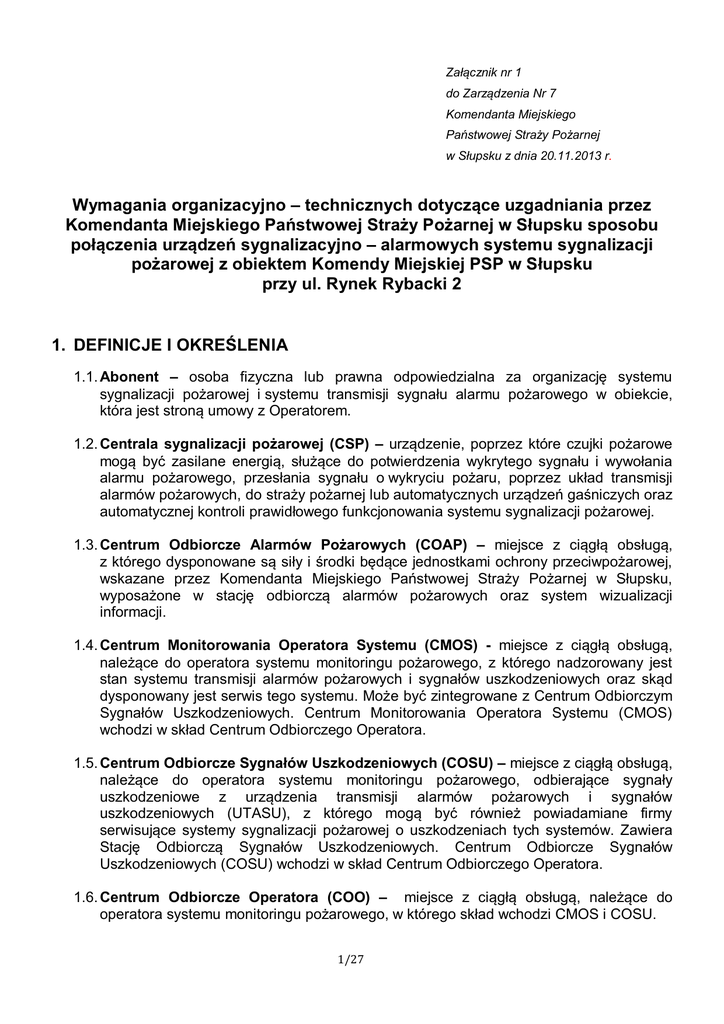 Załącznik nr 1 do Zarządzenia Nr 7 Komendanta Miejskiego Państwowej Straży Pożarnej w Słupsku z dnia 20.11.2013 r. Wymagania organizacyjno – technicznych dotyczące uzgadniania przez Komendanta Miejskiego Państwowej Straży Pożarnej w Słupsku sposobu połączenia urządzeń sygnalizacyjno – alarmowych systemu sygnalizacji pożarowej z obiektem Komendy Miejskiej PSP w Słupsku przy ul. Rynek Rybacki 2 1. DEFINICJE I OKREŚLENIA 1.1. Abonent – osoba fizyczna lub prawna odpowiedzialna za organizację systemu sygnalizacji pożarowej i systemu transmisji sygnału alarmu pożarowego w obiekcie, która jest stroną umowy z Operatorem. 1.2. Centrala sygnalizacji pożarowej (CSP) – urządzenie, poprzez które czujki pożarowe mogą być zasilane energią, służące do potwierdzenia wykrytego sygnału i wywołania alarmu pożarowego, przesłania sygnału o wykryciu pożaru, poprzez układ transmisji alarmów pożarowych, do straży pożarnej lub automatycznych urządzeń gaśniczych oraz automatycznej kontroli prawidłowego funkcjonowania systemu sygnalizacji pożarowej. 1.3. Centrum Odbiorcze Alarmów Pożarowych (COAP) – miejsce z ciągłą obsługą, z którego dysponowane są siły i środki będące jednostkami ochrony przeciwpożarowej, wskazane przez Komendanta Miejskiego Państwowej Straży Pożarnej w Słupsku, wyposażone w stację odbiorczą alarmów pożarowych oraz system wizualizacji informacji. 1.4. Centrum Monitorowania Operatora Systemu (CMOS) - miejsce z ciągłą obsługą, należące do operatora systemu monitoringu pożarowego, z którego nadzorowany jest stan systemu transmisji alarmów pożarowych i sygnałów uszkodzeniowych oraz skąd dysponowany jest serwis tego systemu. Może być zintegrowane z Centrum Odbiorczym Sygnałów Uszkodzeniowych. Centrum Monitorowania Operatora Systemu (CMOS) wchodzi w skład Centrum Odbiorczego Operatora. 1.5. Centrum Odbiorcze Sygnałów Uszkodzeniowych (COSU) – miejsce z ciągłą obsługą, należące do operatora systemu monitoringu pożarowego, odbierające sygnały uszkodzeniowe z urządzenia transmisji alarmów pożarowych i sygnałów uszkodzeniowych (UTASU), z którego mogą być również powiadamiane firmy serwisujące systemy sygnalizacji pożarowej o uszkodzeniach tych systemów. Zawiera Stację Odbiorczą Sygnałów Uszkodzeniowych. Centrum Odbiorcze Sygnałów Uszkodzeniowych (COSU) wchodzi w skład Centrum Odbiorczego Operatora. 1.6. Centrum Odbiorcze Operatora (COO) – miejsce z ciągłą obsługą, należące do operatora systemu monitoringu pożarowego, w którego skład wchodzi CMOS i COSU. 1/27 1.7. Dwustopniowe alarmowanie – jest to alarmowanie polegające na takim zaprogramowaniu systemu sygnalizacji pożarowej, aby po wykryciu pożaru przez element liniowy (np. czujkę pożarową) w centrali sygnalizacji pożarowej (CSP) był sygnalizowany alarm wstępny (alarm I stopnia) przez czas T1 przewidziany na zgłoszenie się personelu. Alarm I stopnia jest przeznaczony wyłącznie dla przeszkolonego personelu obsługującego CSP. Brak reakcji personelu w czasie T1 powoduje automatyczne przejście CSP w stan alarmu głównego (alarm II stopnia). Alarm II stopnia jest przeznaczony dla użytkowników obiektu chronionego instalacją sygnalizacji pożarowej. Moment potwierdzenia przyjęcia alarmu wstępnego przez personel powoduje wyciszenie sygnalizacji akustycznej w CSP i jest początkiem odliczania czasu T2 przeznaczonego na rozpoznanie zagrożenia pożarowego. Jeżeli w czasie T2 personel nie skasuje alarmu wstępnego, CSP automatycznie przejdzie w stan alarmu głównego. W czasie T2 alarm wstępny może być skasowany tylko wtedy, gdy personel ugasi pożar lub stwierdzi, że jest to alarm fałszywy. 1.8. Komenda – oznacza Komendę Miejską Państwowej Straży Pożarnej w Słupsku. 1.9. Koncentrator sygnałów alarmów pożarowych (koncentrator) – urządzenie służące dopasowaniu (integracji) sygnałów ze stacji odbiorczych alarmów pożarowych do systemu wspomagania decyzji (SWD) i do urządzeń wizualizacji. 1.10.Łącze publicznych sieci telekomunikacyjnych ISDN – łącze cyfrowe z integracją usług (ang. Integrated Services Digital Network), zapewniające realizację wielu usług telekomunikacyjnych w jednolitym standardzie cyfrowym. System ISDN oparto o metody przetwarzania sygnałów zapisanych cyfrowo i komutowanych kanałach komunikacyjnych. Jest siecią telekomunikacyjną połączeniową, wykorzystywaną do realizacji usług w lokalnych centralach telefonicznych lub w sieciach komputerowych korzystających z publicznej sieci telefonicznej. 1.11. Łącze publicznych sieci telekomunikacyjnych PSTN – (ang. Public Switched Telephone Network – publiczna komutowana sieć telefoniczna) – zgodnie z PN-EN 50136-1-1:207 Sieć publiczna dostępna, przeznaczona głównie do transmisji głosowej. 1.12. Operator systemu monitoringu (Operator) – podmiot, świadczący usługę transmisji sygnałów alarmów pożarowych z systemów sygnalizacji pożarowej do centrów odbiorczych alarmów pożarowych oraz przyjmujący sygnały uszkodzeniowe w Centrum Odbiorczym Sygnałów Uszkodzeniowych z systemów sygnalizacji pożarowej i transmisji sygnałów alarmów pożarowych. 1.13. Specjalizowany tor transmisji – tor transmisyjny dedykowany lub tor transmisyjny dedykowany w sieci publicznej. 1.14. Stacja Odbiorcza Alarmów Pożarowych (SOAP) – stacja przyjmująca i potwierdzająca alarmy pożarowe przesyłane przez urządzenie transmisji alarmów pożarowych i sygnałów uszkodzeniowych (UTASU). Wchodzi w skład Centrum Odbiorczego Alarmów Pożarowych. 1.15. Stacja Odbiorcza Sygnałów Uszkodzeniowych (SOSU) – stacja przyjmująca sygnały uszkodzeniowe przesyłane przez urządzenie transmisji sygnałów alarmów pożarowych i uszkodzeniowych (UTASU) z systemów sygnalizacji pożarowej. Wchodzi w skład Centrum Odbiorczego Operatora Systemu Monitoringu. 2/27 1.16. Stanowisko Kierowania Komenda