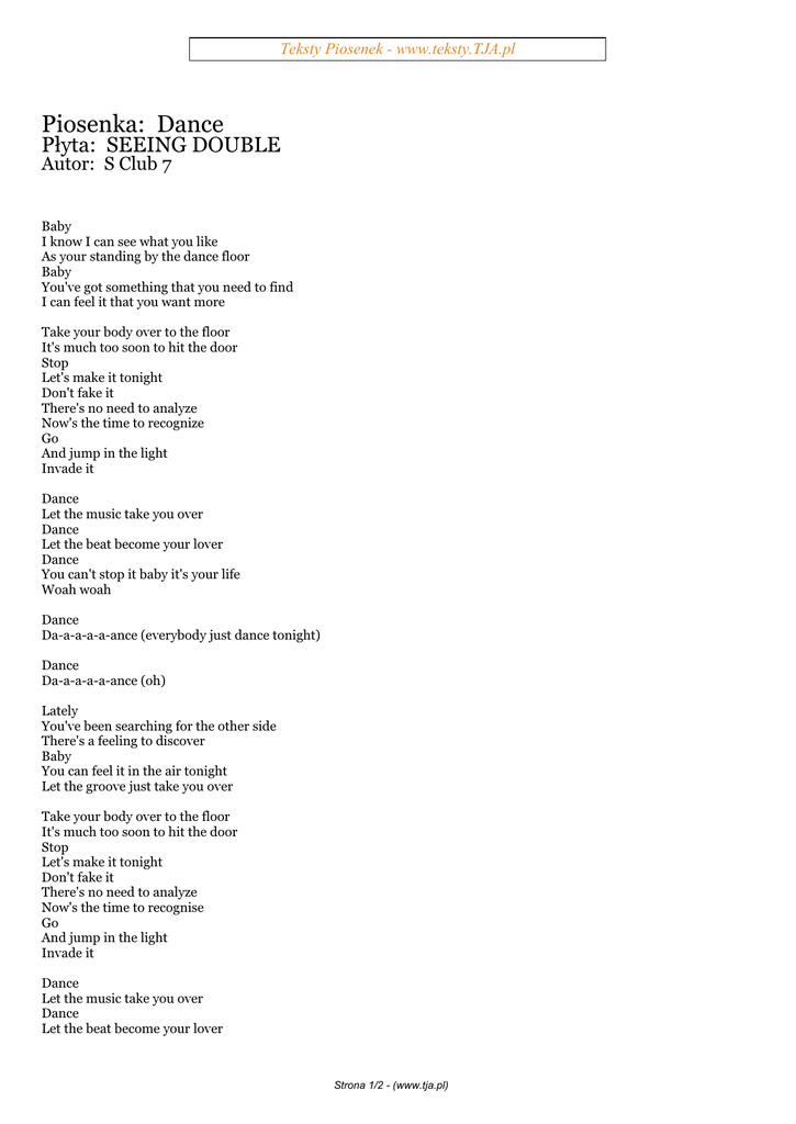 Teksty Piosenek - www.teksty.TJA.pl Piosenka: Dance Płyta: SEEING DOUBLE Autor: S Club 7 Baby I know I can see what you like As your standing by the dance floor Baby You've got something that you need to find I can feel it that you want more Take your body over to the floor It's much too soon to hit the door Stop Let's make it tonight Don't fake it There's no need to analyze Now's the time to recognize Go And jump in the light Invade it Dance Let the music take you over Dance Let the beat become your lover Dance You can't stop it baby it's your life Woah woah Dance Da-a-a-a-a-ance (everybody just dance tonight) Dance Da-a-a-a-a-ance (oh) Lately You've been searching for the other side There's a feeling to discover Baby You can feel it in the air tonight Let the groove just take you over Take your body over to the floor It's much too soon to hit the door Stop Let's make it tonight Don't fake it There's no need to analyze Now's the time to recognise Go And jump in the light Invade it Dance Let the music take you over Dance Let the beat become your lover Strona 1/2 - (www.tja.pl) Teksty Piosenek - www.teksty.TJA.pl Dance You can't stop it baby it's your life Woah woah Dance Let the music take you over Dance Let the beat become your lover Dance You can't stop it baby it's your life Woah woah Dance Da-a-a-a-a-ance Dance Da-a-a-a-a-ance (yeah yeah) Dance Da-a-a-a-a-ance (oh dance) Everybody just dance I've been thinking It's time to discover A new religion From one to another Da-da-dance Let the music take you over Dance Let the beat become your lover Dance You can't stop it baby it's your life Woah woah Dance Let the music take you over Dance Let the beat become your lover Dance You can't stop it baby it's your life Woah woah Dance ***************************************** Polecamy Strony: www.opisy.tja.pl - Codzienie nowe opisy na GG www.rozmowki.tja.pl - Śmieszne Rozmówki www.tapeciarnia.pl - Mnustwo fajnych tapet na pulpit www.teledyski.tja.pl - Zawsze najnowsze teledyski www.lol2.pl - Śmieszne Filmiki, Kabarety www.wkinach.pl - Co jest grane w kinach ? Strona 2/2 - (www.tja.pl)
