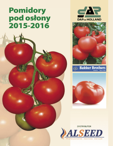 Pomidory pod osłony 2015-2016 DAPco HOLLAND DYSTRYBUTOR DOSKONAŁE POMIDORY SZKLARNIOWE O PRZEDŁUŻONEJ TRWAŁOŚCI Pomidor szklarniowy DAP Malibu F1 Malibu F1 Tm.F.V.N. L.S.L. Odmiana bardzo wczesna. Owoc 180-220g. Roślina o ciągłym wzroście i wysokiej odporności. Owoce twarde do długiego przechowywania, kształtne, kuliste, wyrównane, ładnie wybarwione, bez piętki. Odmiana bardzo odporna na pękanie. Brak problemów z szarą pleśnią. Malibu F1 dobrze plonuje w zmęczonym podłożu i trudnych warunkach uprawowych. Odmiana o bardzo wysokim plonie handlowym wyjątkowo atrakcyjnych i smacznych owoców. Do uprawy we wszystkich rodzajach podłoży w szklarniach i tunelach foliowych oraz do uprawy całorocznej w wełnie mineralnej. Pomidor szklarniowy DAP Parica F1 PARICA F1 Tm.V.F2.N. L.S.L. Odmiana bardzo wczesna. Owoc 180-200g. Odmiana o silnym systemie korzeniowym, ciągłym lecz nieco wolniejszym wzroście, dlatego bardzo dobrze plonuje w niskich obiektach. Grona bardzo gęsto osadzone. Owoce wyjątkowo atrakcyjne, smaczne, kuliste, twarde i odporne na pękanie. Ładnie i równomiernie wybarwione, bez piętki. Odmiana bardzo dobrze plonuje również w trudnych warunkach glebowych i klimatycznych. Do uprawy we wszystkich rodzajach podłoży w szklarniach i tunelach foliowych. Następca odmiany Prudo F 1 Pomidor szklarniowy Lianne F1 Pomidor malinowy Bakony F1 Tm.V.F2 N. LSL LIANNE F1 Tm.V.F2.N.Fr. L.S.L. Udoskonalona wersja znanej i cenionej odmiany Prudo F1. Odmiana wczesna. Owoce duże Wczesna odmiana o owocach wielkości 200–230 g. Ciągły 220-260g kuliste lekko spłaszczone i dobrze wypełnione. Bez owoców na górnych gronach pozwala prowadzić tę odmianę skłonności do pękania. Grona gęsto osadzone. Owoce bardzo w uprawie przedłużonej. Owoce mają bardzo atrakcyjny, ma- dobrej jakości o intensywnej czerwonej barwie, bez piętki, linowy kolor, a także doskonały, słodki smak. twarde i smaczne. Odmiana bardzo plenna. Przeznaczona Owoce bez zielonej piętki nie miekną i mają przedłużoną do uprawy całorocznej w wełnie mineralnej oraz do upraw trwałość (medium LSL). Plenna odmiana do uprawy w szklar- tradycyjnych w cyklu wiosennym i jesiennym w szklarniach niach i w tunelach. i tunelach foliowych. wzrost i bardzo wysokie plonowanie bez efektu drobnienia Barlo F1 Tm.V.F2 N. LSL Dulcia F1 żółte, słodkie Wczesna odmiana tworząca owoce 250-350 g. Samokończą- Owoce kuliste ok. 130 g. o intensywnym żółtym kolorze i słod- ca, do uprawy na 7-8 gron wiosną i jesienią w szklarniach i kim smaku. Odmiana samokończąca dorasta do 120-140 cm tunelach foliowych. Silny system korzeniowy odporny na tworząc ok. 6 gron. Odmiana do uprawy w tunelach folio- nicienie. Odmiana wyjątkowo plenna nawet w zmęczonym wych. podłożu i trudnych warunkach uprawy. Owoce najwyższej jakości, pięknie wybarwione o niezwykłych walorach smakowych o przedłużonej trwałości pozbiorczej. Bez zielonej piętki. Barlo dobrze reaguje na zwiększone nawożenie potasem. Alseed jest w Polsce wyłącznym dystrybutorem holenderskiej firmy DAPco. : pomidory Posiadamy również szeroką ofertę nasion warzyw pod osłony i do gruntu holenderskiej firmy pod osłony i do palika (również malinowe), fasolka szparagowa żółta i zielona, bób, rzodkiewka, papryka, burak ćwikłowy, cebula szczypiorowa, cebula, cukinia, marchew, pietruszka, por, seler, kalafior, kapusta, sałata i inne. Oferujemy bób oraz fasolę szparagową i tyczną do uprawy pod osłonami i w gruncie firmy Holland Select. Wysyłamy bezpłatnie katalogi odmian firmy Bakker Brothers oraz Holland Select wraz z cennikiem. ALSEED Marynin 195A 21-030 Motycz, tel/fax. (81) 503-12-86 (pon.–sob. 9-21) e-mail: [email protected] Pełna oferta na stronie www.alseed.pl