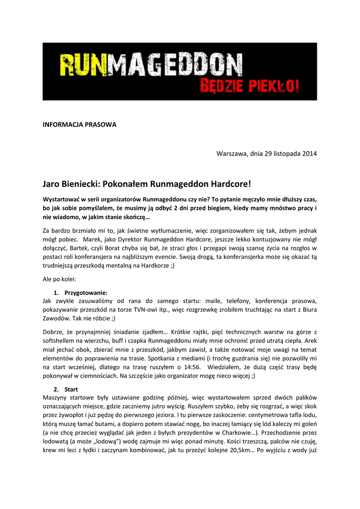 INFORMACJA PRASOWA Warszawa, dnia 29 listopada 2014 Jaro Bieniecki: Pokonałem Runmageddon Hardcore! Wystartować w serii organizatorów Runmageddonu czy nie? To pytanie męczyło mnie dłuższy czas, bo jak sobie pomyślałem, że musimy ją odbyć 2 dni przed biegiem, kiedy mamy mnóstwo pracy i nie wiadomo, w jakim stanie skończę… Za bardzo brzmiało mi to, jak świetne wytłumaczenie, więc zorganizowałem się tak, żebym jednak mógł pobiec. Marek, jako Dyrektor Runmageddon Hardcore, jeszcze lekko kontuzjowany nie mógł dołączyć, Bartek, czyli Borat chyba się bał, że straci głos i przegapi swoją szansę życia na rozgłos w postaci roli konferansjera na najbliższym evencie. Swoją drogą, ta konferansjerka może się okazać tą trudniejszą przeszkodą mentalną na Hardkorze ;) Ale po kolei: 1. Przygotowanie: Jak zwykle zasuwaliśmy od rana do samego startu: maile, telefony, konferencja prasowa, pokazywanie przeszkód na torze TVN-owi itp., więc rozgrzewkę zrobiłem truchtając na start z Biura Zawodów. Tak nie róbcie ;) Dobrze, że przynajmniej śniadanie zjadłem… Krótkie rajtki, pięć technicznych warstw na górze z softshellem na wierzchu, buff i czapka Runmageddonu miały mnie ochronić przed utratą ciepła. Arek miał jechać obok, zbierać mnie z przeszkód, jakbym zawisł, a także notować moje uwagi na temat elementów do poprawienia na trasie. Spotkania z mediami (i trochę guzdrania się) nie pozwoliły mi na start wcześniej, dlatego na trasę ruszyłem o 14:56. Wiedziałem, że dużą część trasy będę pokonywał w ciemnościach. Na szczęście jako organizator mogę nieco więcej ;) 2. Start Maszyny startowe były ustawiane godzinę później, więc wystartowałem sprzed dwóch palików oznaczających miejsce, gdzie zaczniemy jutro wyścig. Ruszyłem szybko, żeby się rozgrzać, a więc skok przez żywopłot i już pędzę do pierwszego jeziora. I tu pierwsze zaskoczenie: centymetrowa tafla lodu, którą muszę łamać butami, a dopiero potem stawiać nogę, bo inaczej łamiący się lód kaleczy mi goleń (a nie chcę przecież wyglądać jak jeden z byłych prezydentów w Charkowie…). Przechodzenie przez lodowatą (a może „lodową”) wodę zajmuje mi więc ponad minutę. Kości trzeszczą, palców nie czuję, krew mi leci z łydki i zaczynam kombinować, jak tu przeżyć kolejne 20,5km… Po wyjściu z wody już jest lepiej, kolejne jeziorko już nieco płytsze, więc idzie szybciej, chociaż łamiący się lód ciągle daje się we znaki. Wiem, że za chwilę czekają mnie kolejne przeszkody z wodą i jakoś mnie nie cieszy ta myśl… Tam, gdzie dolewaliśmy wodę jest łatwiej, bo lód cieńszy, ale mam już ochotę na przeszkodę bez odmrażania palców. Proszę bardzo! Pierwsze zasieki – szkoda softshella, ale co tam! BTW, nie ubierajcie się w żaden ciuch z kapturem na trasę, bo pod drutem kolczastym przeszkadza ;) Wybiegam ze strefy LAS PÓLNOCNY i czeka na mnie wał ziemny, na który kilka razy będę wbiegał przed stertą opon. Poszło łatwo, więc cisnę dalej – Arek jedzie obok i krzyczy, że mam 15km/h. To możliwe tylko na początku trasy i dlatego, że mamy fragment po trawie. Wiem, że to nie potrwa długo, więc w las, i na trawę, i w las i pionowe zasieki, i znowu na trawę, i w las itd. aż do worków z piaskiem. Bez przewodnika mam trochę kłopot, gdzie biec; poza tym robi się już szaro, więc gorzej widzę linki oznaczające trasę w lesie… Pętla przez las daje radę – Dzik się spisał ustawiając ją. Teraz długa prosta, pierwsza ściana, końska przeszkoda i już można wskakiwać na Tarzana. Nalaliśmy pod niego sporo wody, więc albo przechodzicie na rękach po tej poziomej drabinie, albo wpadacie po pas… W razie czego, nie przejmujcie się – za kolejne 3km wszyscy będą mieli mokre tyłki! Teraz trochę błota, 5-metrowy dach i ściana z opon. Wbiegam na dach i przerzucam łańcuchy na drugą stronę, żeby zaznaczyć, że przed imprezą trzeba je skrócić – Hardcore to Hardcore w końcu! Moja myśl zyskuje potwierdzenie już 100m dalej – znowu muszę łydkami rozbijać lód, a to boli. Na szczęście jest Arek, który krzyczy: Jaro wracaj tu na chwilę, bo Marek chce, żebym cyknął Ci jakąś fotę na fejsa! OK… Promocja musi być! Za wodą równoważnia, czyli 20 metrów 8-centrymetrowej kładki nad wodą. Przecież byłem na niej ze 30 razy, więc nie spadnę, prawda? No chyba żeby... Pode mną metr lodowatej wody, więc upadek miałby spore konsekwencje, ale postanawiam o tym nie myśleć, więc nie wpadam i lecę dalej. Ściana 2,7m to pikuś, gorzej, że za chwilę znowu będę musiał wodą. Hmmm, jest już prawie ciemno a na ruiny chciałbym zdążyć widząc cokolwiek, więc chyba ominę tę wodę… i pewnie tak bym zrobił, gdyby nie Dzik wbijający w woderach paliki w wodzie. Przecież trzeba podejść przybić piątkę! Zwłaszcza, że wchodząc staranował lód i nie muszę haratać sobie łydek! Przy wyjściu z wody Arek z aparatem, więc biorę do ręki kawałek lodu, bo nie mam wątpliwości, że polubicie taki obrazek. Usmiech, cyk, „czekaj jeszcze chwilę, zrobię jeszcze kilka”, wrrrrrr, uśmiech, cyk i biegniemy dalej… Trochę mi brakuje Crussadersów i opon, ale te elementy pojawią się dopiero za jakiś czas, więc mam luźniej, niż zawodnicy. Może powinienem zrobić burpeesy? Eee tam, nadrobię później! - Arek, gdzie ta przeszkoda linowa, miała tu być! - No właśnie minąłeś! - F**k! No to wracam. Tylko jak ja mam po niej wejść!? Dali nam tu cienkie liny! - Arek, dzwon do Kuby, niech załatwi z dostawcami, żeby wymienili na grubsze, a ja biegnę dalej! Las, gałęzie, robi się ciemno, ale co tam. Wyciągam telefon (Marek dał mi taką świetną, nieprzemakalną saszetkę – będę z niej wyciągał na trasie telefon jeszcze kilkanaście razy. - Bartek, załatw mi czołówkę do strefy SPA, bo inaczej się zabiję na ruinach! Ni