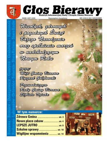 Głos Bierawy Biuletyn Informacyjny Rady i Urzędu Gminy Bierawa Bierawa - Brzeźce - Dziergowice - Goszyce - Grabówka - Korzonek Kotlarnia - Lubieszów - Ortowice - Solarnia - Stara Kuźnia - Stare Koźle ISSN 1507-1030 Egzemplarz bezpłatny Wesołych, zdrowych i pogodnych Świąt Bożego Narodzenia oraz spełnienia marzeń w nadchodzącym Nowym Roku życzą: Wójt Gminy Bierawa Ryszard Gołębowski Przewodnicząca Rady Gminy Bierawa Elżbieta Dziuda W tym numerze: Zdrowa Gmina ..................................... str. 3 Nowe place zabaw .......................... str. 4 LEPSZE JUTRO .................................... str. 8 Szkolne sprawy ................................ str. 10 Wigilijne wspomnienia .............. str. 14 NR 3/2012 (62) GRUDZIEŃ Głos Bierawy NR 3/2012 GRUDZIEŃ NR 3/2012 GRUDZIEŃ II edycja konkursu Informacje ZDROWA GMINA Serdecznie zapraszamy na strony internetowe sołect z naszej gminy: http://dkdziergowice.w.interia.pl/ http://www.dziergowice.com http://www.dziergowice.pl http://www.goszyce.pl/ http://www.kotlarnia.org.pl/ http://www.solarnia.pl/ http://www.starekozle.pl/ *** Zapraszamy mieszkańców Gminy Bierawa do korzystania z Wiosek Internetowych. OSP Dziergowice: 18:00-20:00 (poniedziałek, środa, czwartek, piątek), OSP Lubieszów: 16:00-20:00 (wtorek i czwartek), OSP Goszyce: 16:00-20:00 (wtorek i czwartek), OSP Bierawa: 16:00-20:00 (od poniedziałku do piątku). Serdecznie zapraszamy! Wójt gminy Bierawa Szanowni Państwo Kończy się rok 2012, zbliżają się Święta Bożego Narodzenia i Nowy Rok. Z tej okazji składam Państwu najserdeczniejsze życzenia, dużo radości, spokoju, szczęścia rodzinnego i wspaniałej atmosfery przy stole wigilijnym. Na nadchodzący rok wszystkim mieszkańcom naszej gminy życzę aby Wójt Gminy Bierawa Ryszard Gołębowski - zrealizowane przez Mammo MED z Gdańska; spełniające jedno z poniższych kryteriów: 1).Nie miały wykonywanej mammografii w ciągu ostatnich 2 lat w ramach NFZ. 2).Otrzymały w ramach realizacji programu profilaktyki raka piersi pisemne wskazanie do wykonania ponownego badania mammograficznego po upływie 12 miesięcy. 3).Nie miały wcześniej stwierdzonej zmiany nowotworowej piersi. Powyższe badania zostały wykonane przez wyżej wymienionych świadczeniodawców przy Urzędzie Gminy Bierawa, ul. Wojska Polskiego 12 w mammobusach, gdzie ogółem zostało przebadanych 69 kobiet wcześniej imiennie zaproszonych na badanie. II. CYTOLOGII – raka szyjki macicy – kobiety w wieku 25-59 lat; Informacje z życia chóru *** Co słychać w chórze „HARMONIA” Nasi Jubilaci Depta Elżbieta .............................. 93 lata Dreszer Berta .............................. 90 lat Krakówka Helena ....................... 91 lat Krohner Wiktoria ........................ 92 lata Piszczek Hildegarda .................... 93 lata Gach Stefan ................................. 91 lat Blaschta Oskar i Dorota ....... 50 lat PM Dziura Ernest i Cecylia ........ 50 lat PM Ermisch Augustyn i Elfriede 50 lat PM Grabon Ernest i Renata ........ 55 lat PM Henel Regina i Ewald ............ 55 lat PM Janissek Werner i Erika ......... 50 lat PM Kentnowski Alma Józef ......... 55 lat PM Marek Agnieszka i Marcin .... 55 lat PM Rus Ewald i Urszula ............... 50 lat PM Steinert Edeltraud i Reinhold 60 lat PM Waduła Antoni i Regina ........ 50 lat PM Chór istnieje już 15 lat i chociaż „średnia wieku” członków przekracza 70 lat to zapału i chęci nam nie brakuje, ćwiczymy regularnie i mobilizujemy się wzajemnie. Ważne dla nas jest także to, że możemy się spotykać, pośpiewać sobie, pożartować i zapomnieć o naszych dolegliwościach zdrowotnych i problemach dnia codziennego. Jesteśmy amatorami, nie mamy obecnie nauczyciela - ćwiczymy sami co wymaga od nas dużo pracy i samozaparcia. Cieszymy się, że możemy naszym śpiewem uświetnić uroczystości kościelne, msze jubileuszowe i urodzinowe a czasami, jak to w życiu… także smutne, pogrzebowe. Posiadamy w swoim dorobku ponad 260 spisanych piosenek: ludowych biesiadnych, kolęd a także piosenek o tematyce religijnej. Zależy nam na tym, by piosenki te /szczególnie ludowe/ zachować od zapomnienia. W miesiącu czerwcu, tradycyjnie zo- *** Liczba mieskańców na 01.12.2012 Bierawa ........................................... 1321 Brzeźce ............................................. 574 Dziergowice ................................... 1695 Goszyce ............................................ 159 Grabówka ........................................ 190 Korzonek ......................................... 236 Kotlarnia .......................................... 618 Lubieszów ........................................ 515 Ortowice .......................................... 265 Solarnia ............................................ 509 Stara Kuźnia .................................... 611 Stare Koźle ....................................... 805 Razem ....................................... 7498 Liczba urodzeń w Gminie Bierawa od 01.01.2012 - 11.12.2012r wynosi 71 dzieci 2 słowo kryzys i język nienawiści tak często używany przez polityków i rządzących Rzeczpospolitą nie przesłaniał innych wartości takich jak dobroć, przyjaźń i wzajemne poszanowanie. Gmina Bierawa wzięła udział w II edycji konkursu „ZDROWA GMINA” organizowanego przez Polską Unię Onkologii, celem którego było zachęcenie i ułatwienie mieszkańcom naszej gminy uczestnictwa w bezpłatnych badaniach programu profilaktyki nowotworowej. Gmina Bierawa prowadziła kampanię społeczną na rzecz profilaktyki chorób nowotworowych, w kierunku przeprowadzenia bezpłatnych badań: I. MAMMOGRAFII – raka piersi – kobiety w wieku 50-69 lat; z bezpłatnych badań mammograficznych w dniach: • 08.06.2012 r. (piątek) skorzystały 32 kobiety – wykonane przez LUX MED z Gdyni; • 22.10.2012 r. (poniedziałek) przebadano 37 kobiet, w tym 1 osobę skierowano na pogłę