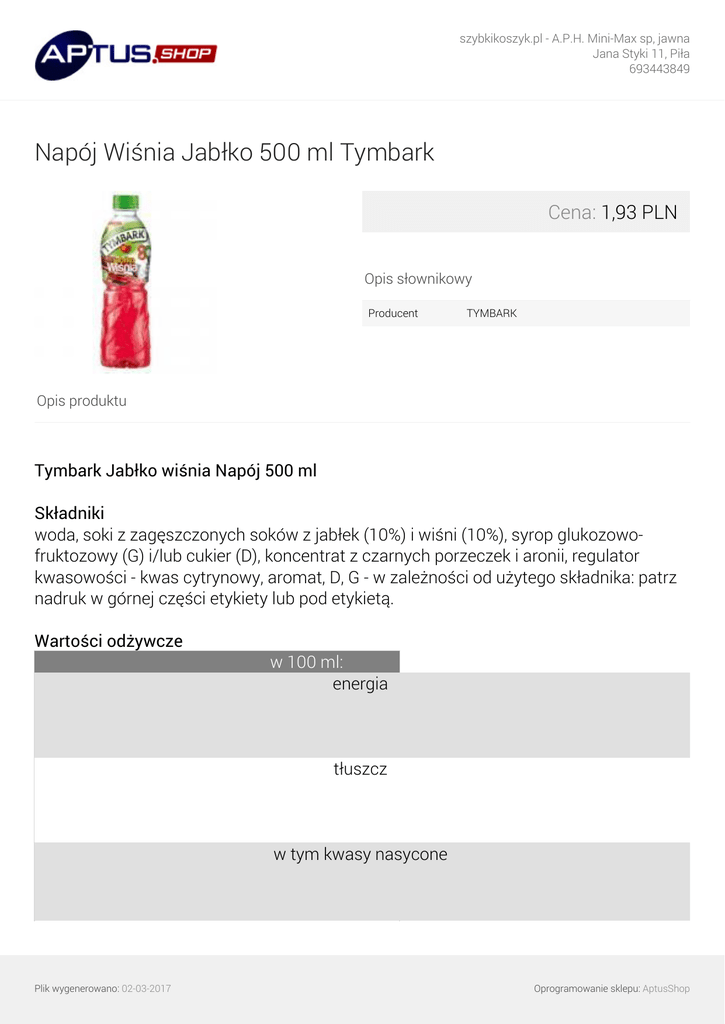 szybkikoszyk.pl - A.P.H. Mini-Max sp, jawna Jana Styki 11, Piła 693443849 Napój Wiśnia Jabłko 500 ml Tymbark Cena: 1,93 PLN Opis słownikowy Producent TYMBARK Opis produktu Tymbark Jabłko wiśnia Napój 500 ml Składniki woda, soki z zagęszczonych soków z jabłek (10%) i wiśni (10%), syrop glukozowofruktozowy (G) i/lub cukier (D), koncentrat z czarnych porzeczek i aronii, regulator kwasowości - kwas cytrynowy, aromat, D, G - w zależności od użytego składnika: patrz nadruk w górnej części etykiety lub pod etykietą. Wartości odżywcze w 100 ml: energia tłuszcz w tym kwasy nasycone Plik wygenerowano: 02-03-2017 Oprogramowanie sklepu: AptusShop szybkikoszyk.pl - A.P.H. Mini-Max sp, jawna Jana Styki 11, Piła 693443849 węglowodany w tym cukry białko sól Nazwa produktu uregulowana prawnie Napój owocowy. Wyprodukowany z soków zagęszczonych. Niegazowany, pasteryzowany. Marka Tymbark Cechy bez konserwantów i sztucznych słodzików Marka standaryzowana Marka: Tymbark Adres firmy ul. Strefowa 13 43-100 Tychy Opis produktu Soczyste! Właśnie takie są jabłka i wiśnie, którym dajemy wycisk, łącząc je z krystalicznie czystą wodą. Dzięki temu nasz napój owocuje unikalnym i orzeźwiającym smakiem. Kiedy raz go łykniesz, nie będziesz chciał się z nim rozstać! O marce Plik wygenerowano: 02-03-2017 Oprogramowanie sklepu: AptusShop szybkikoszyk.pl - A.P.H. Mini-Max sp, jawna Jana Styki 11, Piła 693443849 Tymbark jest obecny na polskim rynku od 1936 r. Za nami już blisko 80 lat tradycji bezkonkurencyjnego smaku i najwyższej jakości. Obecnie Tymbark to zdecydowany lider rynkowy w kategorii soków, nektarów i napojów w Polsce, którego produkty trafiają do prawie 30 krajów na całym świecie. Jest marką, którą polscy konsumenci darzą wyjątkowym zaufaniem i najchętniej polecają swoim bliskim. Dodatkowe informacje Okazuj uczucia! W Tymbarku od 80 lat jabłko kusi wiśnię, a wiśni to nie wisi. Company Name MWS Sp. z o.o. Sp. k. Dodatki Słodziki sztuczne: Nie zawiera konserwanty: Nie zawiera Przygotowanie i stosowanie Wstrząsnąć przed otwarciem. Przechowywanie Chronić przed światłem. Po otwarciu przechowywać w lodówce nie dłużej niż 48 godz. Rodzaj przechowywania Typ: Przechowywać w temperaturze otoczenia Rozmiar opakowania 500 Jednostka (tekst opisowy) ml Recykling - pozostały tekst wyrzucaj bez etykiety Średnia miara Średnia miara (e) Jednostka (specyficzna) Plik wygenerowano: 02-03-2017 Oprogramowanie sklepu: AptusShop szybkikoszyk.pl - A.P.H. Mini-Max sp, jawna Jana Styki 11, Piła 693443849 Jednostka (specyficzna): Mililitrów Rodzaj opakowania Typ: Butelka plastikowa Wymiar liczbowy Wymiar liczbowy: 500 Wymiar Wymagana wysokość na półce: 220 Wymagana szerokość na półce: 65 Wymagana głębokość na półce: 65 Waga Waga brutto: 536 Sprzedaż jednostkowa Wysokość: 220 Szerokość: 65 Głębokość: 65 Opakowanie logistyczne GTIN: 05900334126054 Adres zwrotny MWS Sp. z o.o. Sp. k. ul. Strefowa 13 43-100 Tychy Adres dystrybutora MWS Sp. z o.o. Sp. k. ul. Strefowa 13 43-100 Tychy Języki na opakowaniu polski Język produktu Główny język opisu: polski Język danych: polski Podzielony opis produktu Plik wygenerowano: 02-03-2017 Oprogramowanie sklepu: AptusShop szybkikoszyk.pl - A.P.H. Mini-Max sp, jawna Jana Styki 11, Piła 693443849 Nazwa funkcjonalna: Napój Wariant: Jabłko wiśnia Plik wygenerowano: 02-03-2017 Powered by TCPDF (www.tcpdf.org) Oprogramowanie sklepu: AptusShop