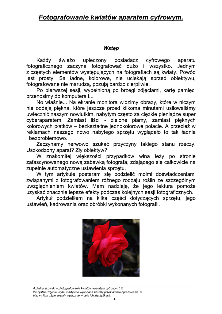 Fotografowanie kwiatów aparatem cyfrowym. Wstęp Każdy świeżo upieczony posiadacz cyfrowego aparatu fotograficznego zaczyna fotografować dużo i wszystko. Jednym z częstych elementów występujących na fotografiach są kwiaty. Powód jest prosty. Są ładne, kolorowe, nie uciekają sprzed obiektywu, fotografowane nie marudzą, pozują bardzo cierpliwie. Po pierwszej sesji, wypełnioną po brzegi zdjęciami, kartę pamięci przenosimy do komputera i... No właśnie... Na ekranie monitora widzimy obrazy, które w niczym nie oddają piękna, które jeszcze przed kilkoma minutami usiłowaliśmy uwiecznić naszym nowiutkim, nabytym często za ciężkie pieniądze super cyberaparatem. Zamiast liści - zielone plamy, zamiast pięknych kolorowych płatków – bezkształtne jednokolorowe połacie. A przecież w reklamach naszego nowo nabytego sprzętu wyglądało to tak ładnie i bezproblemowo. Zaczynamy nerwowo szukać przyczyny takiego stanu rzeczy. Uszkodzony aparat? Zły obiektyw? W znakomitej większości przypadków wina leży po stronie zafascynowanego nową zabawką fotografa, zdającego się całkowicie na zupełnie automatyczne ustawienia sprzętu. W tym artykule postaram się podzielić moimi doświadczeniami związanymi z fotografowaniem różnego rodzaju roślin ze szczególnym uwzględnieniem kwiatów. Mam nadzieję, że jego lektura pomoże uzyskać znacznie lepsze efekty podczas kolejnych sesji fotograficznych. Artykuł podzieliłem na kilka części dotyczących sprzętu, jego ustawień, kadrowania oraz obróbki wykonanych fotografii. A.Jędryczkowski – „Fotografowanie kwiatów aparatem cyfrowym”. Wszystkie zdjęcia użyte w artykule wykonane zostały przez autora opracowania. Nazwy firm użyte zostały wyłącznie w celu ich identyfikacji. -1- Wybieramy aparat i akcesoria. Do fotografowania kwiatów nadaje się niemalże każdy aparat cyfrowy. Aby uzyskać jednak dobre efekty warto zaopatrzyć się w sprzęt posiadający: - kreatywne tryby fotografowania (minimum to tryb priorytetu przysłony – oznaczany często literami AV), - możliwość korygowania ekspozycji w zakresie –2EV do +2EV, - dobrej jakości obiektyw umożliwiający zmianę ogniskowej (nie będą nam potrzebne tzw. hiperzoomy – wystarczy ekwiwalent ogniskowych dla aparatu małoobrazkowego w zakresie 35100mm), - możliwość stosowania nasadek na obiektyw – opcjonalnie (nasadka makro, filtry, itp.), - możliwość zapisywania fotografii w trybie RAW (niezłe efekty można tez uzyskać zapisując zdjęcia w formacie JPEG, jednak tryb RAW daje nieporównywalnie więcej możliwości obróbki zdjęcia oraz znacznie lepszą jakość zdjęć), - możliwość przykręcenia do statywu (dzisiaj już chyba wszystkie aparaty taka możliwość posiadają), - możliwość wyzwalania migawki zdalnie (wężyk, pilot) lub tryb samowyzwalacza. W lustrzankach cyfrowych przydaje się też możliwość wstępnego uniesienia lustra, - możliwość całkowitego wyłączenia lampy błyskowej (!!!). Produkowane dzisiaj aparaty cyfrowe posiadają zazwyczaj większość bądź wszystkie te możliwości. Najczęściej występującym brakiem jest niemożność zapisu fotografii w trybie RAW. Tryb ten jest domeną lustrzanek cyfrowych i aparatów kompaktowych z wyższej półki cenowej. Jego brak nie będzie stanowił bardzo dużej przeszkody. Jeśli chcemy publikować zdjęcia w galeriach www w zupełności wystarczy nam format JPEG. Zakupując aparat cyfrowy zwracamy najczęściej uwagę na tzw. ilość megapikseli matrycy światłoczułej. Jest to istotne, ale dopiero w zestawieniu z określeniem fizycznych wymiarów tej matrycy. Większa fizycznie matryca daje obraz znacznie wyższej jakości, pozbawiony tzw. szumu. Generalnie, wybór aparatu cyfrowego to kwestia bardzo indywidualna. Zależy od posiadanych funduszy i preferencji. Nie będę w tym artykule polecał konkretnych modeli i firm. Myślę, że każdy średnio i bardzo zaawansowany kompakt lub dowolna cyfrowa lustrzanka sprawdzi się w omawianym rodzaju fotografii bardzo dobrze. A.Jędryczkowski – „Fotografowanie kwiatów aparatem cyfrowym”. Wszystkie zdjęcia użyte w artykule wykonane zostały przez autora opracowania. Nazwy firm użyte zostały wyłącznie w celu ich identyfikacji. -2- Mój sprzęt to lustrzanki Canon EOS 300D oraz ostatnio nabyty Canon EOS 30D z zestawem kilku obiektywów (w tym kilka egzemplarzy produkcji rosyjskiej mocowanych za pomocą adaptera do korpusu Canona -świetnie sprawdzających się przy fotografii kwiatów). Szczególnie dobrze spisuje się Jupiter 2/85 dający bardzo dużą kontrole nad głębia ostrości oraz posiadający wspaniałą plastykę. Inną „perełką” jest Jupiter 3,5/135, który wraz z pierścieniami pośrednimi lub mieszkiem stanowi świetny i bardzo tani zestaw do fotografii makro. Dużo zdjęć wykonuję też obiektywem KIT’owym (EFS 18-55). Używam także makrokonwertera Raynox DCR 250 do większych zbliżeń. Niezbędnym wyposażeniem jest statyw lub chociaż monopod. Większość nieostrości na zdjęciach wynika z niestabilnej ręki fotografa, a ww. urządzenia pozwalają bardzo skutecznie ich uniknąć. Uzupełnieniem całego zestawu jest komputer z oprogramowaniem graficznym. Takie oprogramowanie często jest dołączane do aparatu cyfrowego (w moim był PhotoShop Elements 2). Można też skorzystać z wielu znakomitych bezpłatnych narządzi jak GIMP czy Photofiltre, których ogromna ilość jest publikowana w dołączonych do gazet o tematyce komputerowej i fotograficznej płytach CD. Nie będę w tym artykule celowo omawiał obróbki za pomocą Photo Shopa (z wyłączeniem PS Elements) gdyż jest to oprogramowanie bardzo drogie i niewielu właścicieli aparatów cyfrowych może sobie na nie pozwolić. A.Jędryczkowski – „Fotografowanie kwiatów aparatem cyfrowym”. Wszystkie zdjęcia użyte w artykule wykonane zostały przez autora opracowania. Nazwy firm użyte zostały wyłącznie