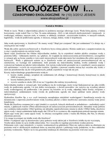EKOJÓZEFÓW i... CZASOPISMO EKOLOGICZNE Nr (10) 3/2012 JESIEŃ www.ekojozefow.pl NASZA WODA Woda to życie. Woda o odpowiedniej jakości to podstawa naszego zdrowego życia. Woda którą pijemy, z której korzystamy, woda wokół Nas i w Nas. Ta sama substancja - H2O, w tak różnych okolicznościach i miejscach: w wodociągu, szklance, naszym ciele, w wannie, w ubikacji, ściekach , oczyszczalni ścieków, w naszych rzekach, kąpielisku, woda do podlewania ogrodu, w deszczu, śniegu, lodzie, woda w krajobrazie. Jaką wodę spożywamy w Józefowie? Ile mamy wody? Skąd jest czerpana? Jak jest uzdatniana? Co dzieje się z zużytą przez nas wodą? Woda dla celów spożywczo/bytowych w Józefowie bywa różnej jakości. Różnie nadal jest z zaopatrywaniem się w nią i z pozbywaniem się zużytej wody. Spora część józefowian ma własne indywidualne studnie. Są to częstokroć studnie płytkie czerpiące wodę z poziomu kilku – kilkunastu metrów, są i głębsze. Ze względu na zanieczyszczenia powierzchniowe, szczególnie w sytuacji gdy są liczne szamba w tym część nieszczelnych woda taka może być niezdatna dla celów spożywczo/ bytowych. Wody z głębszych warstw są w Józefowie wolne od zanieczyszczeń powierzchniowych ale są zażelazione, co wymaga ich uzdatniania. Jeśli posiada się indywidualną studnię, trzeba uzdatniać wodę i wykonywać badania jej jakości indywidualnie. Zaś zużytą wodę/ścieki gromadzi się w szambach i usuwa poprzez ich opróżnianie i wywóz do oczyszczalni ścieków. Zgodnie z prawem szamba muszą być szczelne aby ścieki z nich nie przedostawały się do wód gruntowych, jednak częstokroć wciąż tak nie jest. Koszty indywidualnego gospodarowania wodą to: • koszty studni, pompy, urządzeń do uzdatniania ich obsługi i konserwacji (koszty konserwacji to około 1000 zł rocznie), • koszty badania jakości wody, • wywóz szamba to około 200 zł raz na 3 tygodnie dla rodziny trzyosobowej. Indywidualna studnia w sytuacji gdy ktoś podłączy się do wodociągu, może wciąż funkcjonować np. jako źródło wody do podlewania ogrodu i to jest dobre rozwiązanie, z dwóch powodów: nie zużywa się wysokiej jakości wody wodociągowej do podlewania i nie ponosi się kosztów za tę wodę, odpadają także koszty związane z indywidualnym uzdatnianiem wody (woda do podlewania ogrodu nie musi spełniać norm jakości wody spożywczej). Hydrosfera Józefów Sp. z o.o. czyli instytucja zarządzająca miejskimi wodociągami i kanalizacją rozwija się dynamicznie i zapewnia józefowianom wodę wysokiej jakości a także możliwości usuwania zużytej wody przez kanalizację. Woda dla Józefowa czerpana jest z ujęć (studni) w czystych, leśnych okolicach w południowo - zachodniej części miasta, z głębszych warstw (50m) odizolowanych od zanieczyszczeń powierzchniowych. Aktualnie wody pobiera się i uzdatnia maksymalnie 120m³/godzinę zaś aktualne zapotrzebowanie miasta to około 1500m³/dobę, docelowo ujęcia wody i stacja uzdatniania będą mogły dać 220 m³/h co wystarczy dla zaspokojenia potrzeb naszego miasta. Rejon ujęć wody jak i same ujęcia wody to obszary szczególnie cenne i ważne dla Miasta, dla Nas, to obszary chronione prawem. Czy mogą wyczerpać się źródła wody dla Józefowa? Pobór i wydajność ujęć są skorelowane i przy poborze wody takim jak w Józefowie źródła się nie wyczerpią. Trzeba także dodać że są to źródła odnawialne. No i wszystko to reguluje pozwolenie wodno-prawne. Pobieranie wód z ujęć miejskich ( z warstw wodonośnych na głębokości 50m) nie wpływa także na obniżanie się poziomu wód w okolicznych studniach które są znacznie płytsze i pobierają wody podskórne, to dwa oddzielne poziomy wodonośne. Wpływ na to ma generalna tendencja do obniżania się poziomu wód oraz susze. 1 W pobliżu ujęć znajduje się stacja uzdatniania wody. Interesującym zagadnieniem jest jak uzdatnia się wodę? Czy np. wodę się chloruje? Proces uzdatniania wody obejmuję kilka etapów: 1. Ujmowanie wody – pompowanie z głębokości 50 m, 2. Redukcja żelaza i manganu (obecnych w wodzie ujętej a niepożądanych w wodzie docelowej) odbywa się to w zbiornikach do których wtłacza się powietrze, 3. Filtracja poprzez filtry piaskowo-węglowe, 4. Dezynfekcja lampą ultrafioletową (w józefowskich wodociągach nie chloruje się wody, zamiast tego jest właśnie owa lampa UV. Natomiast istnieje techniczna możliwość dezynfekcji podchlorynem sodu w sytuacji gdyby jakość wody w sieci tego wymagała) 5. Przefiltrowana i zdezynfekowana woda trafia do odbiorcy, do Nas. Uzdatniona woda płynie siecią wodociągową do naszych kranów gdzie z niej korzystamy, czy to w celach konsumpcyjnych, higienicznych, czy innych jak podlewanie ogrodów. Średnio mieszkaniec Józefowa korzystający z wodociągów zużywa 80-100 l/dobę. Warto zwrócić uwagę że woda którą pijemy, którą myjemy się, spłukujemy toaletę, podlewamy ogród, to ta sama cenna, czysta, uzdatniona woda. Woda powinna być używana z rozwagą, oszczędnie. Ale co to znaczy? Otóż oszczędzanie wody to właściwe z niej korzystanie. Należy stosować rozwiązania i urządzenia oszczędzające wodę takie jak np. odpowiednie wodooszczędne: spłuczki do toalet, pralki, zmywarki do naczyń, brać prysznic zamiast kąpać się, podlewać ogrody rano lub wieczorem, ale także stosować ekologiczne środki czystości (to szczególnie ważne dla naszego ciała ale także dla naszej wody, naszego środowiska życia). Jeśli wody z wodociągów używa się do podlewania ogrodów a ktoś jest podłączony do kanalizacji to jej koszty nie obejmują kosztów odprowadzania do kanalizacji (stosuje się odliczniki). Koszty wody z wodociągów i odprowadzania ścieków do kanalizacji: • koszt przyłączy jedynie na swojej działce, (miasto buduje przyłącza do linii rozgraniczających) • koszt wody z wodociągów należy 