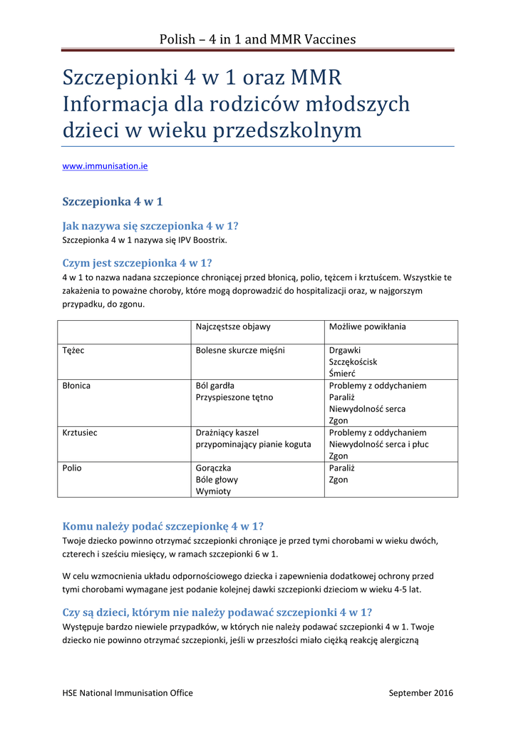 Szczepionki 4 w 1 oraz MMR Informacja dla rodziców