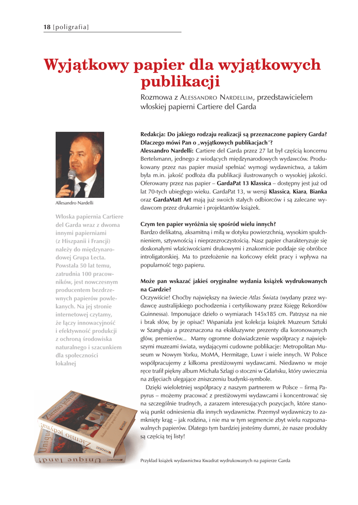 18 [po l igrafia ] Wyjątkowy papier dla wyjątkowych publikacji Rozmowa z A lessandro N ardellim , przedstawicielem włoskiej papierni Cartiere del Garda Allesandro Nardelli Włoska papiernia Cartiere del Garda wraz z dwoma innymi papierniami (z Hiszpanii i Francji) należy do międzynarodowej Grupa Lecta. Powstała 50 lat temu, zatrudnia 100 pracowników, jest nowczesnym producentem bezdrzewnych papierów powlekanych. Na jej stronie internetowej czytamy, że łączy innowacyjność i efektywność produkcji z ochroną środowiska naturalnego i szacunkiem dla społeczności lokalnej Redakcja: Do jakiego rodzaju realizacji są przeznaczone papiery Garda? Dlaczego mówi Pan o „wyjątkowych publikacjach”? Alessandro Nardelli: Cartiere del Garda przez 27 lat był częścią koncernu Bertelsmann, jednego z wiodących międzynarodowych wydawców. Produkowany przez nas papier musiał spełniać wymogi wydawnictwa, a takim była m.in. jakość podłoża dla publikacji ilustrowanych o wysokiej jakości. Oferowany przez nas papier – GardaPat 13 Klassica – dostępny jest już od lat 70-tych ubiegłego wieku. GardaPat 13, w wersji Klassica, Kiara, Bianka oraz GardaMatt Art mają już swoich stałych odbiorców i są zalecane wydawcom przez drukarnie i projektantów książek. Czym ten papier wyróżnia się spośród wielu innych? Bardzo delikatną, aksamitną i miłą w dotyku powierzchnią, wysokim spulchnieniem, sztywnością i nieprzezroczystością. Nasz papier charakteryzuje się doskonałymi właściwościami drukowymi i znakomicie poddaje się obróbce introligatorskiej. Ma to przełożenie na końcowy efekt pracy i wpływa na popularność tego papieru. Może pan wskazać jakieś oryginalne wydania książek wydrukowanych na Gardzie? Oczywiście! Choćby największy na świecie Atlas Świata (wydany przez wydawcę australijskiego pochodzenia i certyfikowany przez Księgę Rekordów Guinnessa). Imponujące dzieło o wymiarach 145x185 cm. Patrzysz na nie i brak słów, by je opisać! Wspaniała jest kolekcja książek Muzeum Sztuki w Szanghaju a przeznaczona na ekskluzywne prezenty dla koronowanych głów, premierów... Mamy ogromne doświadczenie współpracy z największymi muzeami świata, wydającymi cudowne poblikacje: Metropolitan Museum w Nowym Yorku, MoMA, Hermitage, Luwr i wiele innych. W Polsce współpracujemy z kilkoma prestiżowymi wydawcami. Niedawno w moje ręce trafił piękny album Michała Szlagi o stoczni w Gdańsku, który uwiecznia na zdjęciach ulegające zniszczeniu budynki-symbole. Dzięki wieloletniej współpracy z naszym partnerem w Polsce – firmą Papyrus – możemy pracować z prestiżowymi wydawcami i koncentrować się na szczególnie trudnych, a zarazem interesujących pozycjach, które stanowią punkt odniesienia dla innych wydawnictw. Przemysł wydawniczy to zamknięty krąg – jak rodzina, i nie ma w tym segmencie zbyt wielu rozpoznawalnych papierów. Dlatego tym bardziej jesteśmy dumni, że nasze produkty są częścią tej listy! Przykład książek wydawnictwa Kwadrat wydrukowanych na papierze Garda [ p ol i g rafi a] 19 Jedna z rozkładówek Wykwintnej kuchni polskiej wydrukowanych na papierze GardaPat 13 A publikacje z polskiego rynku? Na pewno Wykwintna kuchnia polska wydana nakładem wydawnictwa Bosz z Olszanicy pod patronatem pani prezydentowej A nny K omorowskiej . Ta publikacja zdobyła nagrodę w Paryżu. Chcę tu szczególnie podkreślić naszą współpracę z tą oficyna. Na papierze GardaPat 13 ukazały sie trzy pozycje jej nakładem i wszystkie są znakomite. Mam na myśli również inny album Polska oraz ekskluzywne wydanie biografii F. Chopina. Jest jakaś reguła pozwalająca książkom na wygrywanie w konkursach? To kombinacja trzech czynników – gdzie dobry projekt zostaje przełożony na możliwie najwyższej jakości druk, z wykorzystaniem pięknego papieru. Połączenie ich pozwala na zrealizowanie arcydzieła. Jak promuje się ekskluzywny papier? Działamy na rynku niszowym, gdzie promowanie marki musi być oparte na emocjonalnym argumentowaniu. Bardzo ważny jest kontakt z klientami, dlatego też bierzemy udział w najważniejszych targach książki, takich jak te we Frankfurcie czy Londynie, BEA w Nowym Yorku, jak również tych lokalnych – w Goeteborgu, Londynie, Moskwie i Krakowie. Oczywiście to nie wystarcza. Najważniejszy jest bezpośredni kontakt z wydawcami, którzy mają ostateczne zdanie na temat wyglądu publikacji. Gdy zapadła decyzja o druku albumu Wykwintna kuchnia polska, natychmiast postanowiłem odwiedzić wydawnictwo Bosz oddalone o 1,5 tys. km od naszego biura… całą drogę przemierzyłem samochodem. Gdyby to spotkanie nie doszło do skutku, wybór pewnie padłby na inny papier. Tytuł konferencji podczas Targów Książki w Krakowie, w której bierze Pan udział to „Szlachetna okładka gwarantem sukcesu”. Jaka, pańskim zdaniem, powinna być okładka, aby zwrócić uwagę czytelników? Osobiście lubię twarde oprawy w stylu rosyjskim. Zanim jeszcze się je otworzy, czuć wysoki poziom jakości i bogactwo wydawnictwa. Na przykład książki religijne, jak Biblia lub Koran, posiadają bardzo ładne aplikacje tłoczone złotem czy srebrem. Przykładem może tu być książka moskiewskiego Teatru Bolszoj, w której do okleiny wykorzystano tkaninę z choreografii przedstawienia. Coś wspaniałego, tym bardziej, że był to balet. Rynek wydawniczy przeżywa wyraźny kryzys. Jednym z jego przejawów jest presja cenowa. Jak dajecie sobie z tym radę? Na pewno nie jest to dobry okres dla całej gospodarki, a dla przemysłu papierniczego w szczególności. Ale w naszym przypadku mówimy o szczególnym segmen Album Michała Szlagi Stocznia 20 [po l igra fia ] cie, gdzie jakość jest koniecznością. Na tak trudnym rynku należy pokazać, że daje się sprostać wymaganiom jakościowym. To tworzy świadomość marki. A kto koncen-truje wysiłki w tym obszarze, z pewnością odczuje poprawę kondy