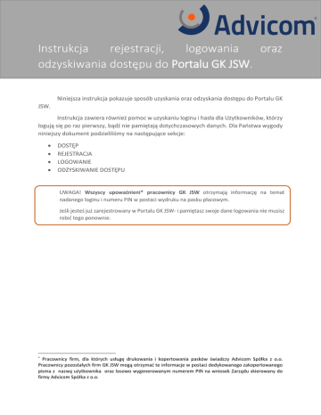 Instrukcja rejestracji, logowania oraz odzyskiwania dostępu do Portalu GK JSW. JSW. Niniejsza instrukcja pokazuje sposób uzyskania oraz odzyskania dostępu do Portalu GK Instrukcja zawiera również pomoc w uzyskaniu loginu i hasła dla Użytkowników, którzy logują się po raz pierwszy, bądź nie pamiętają dotychczasowych danych. Dla Państwa wygody niniejszy dokument podzieliliśmy na następujące sekcje: • • • • DOSTĘP REJESTRACJA LOGOWANIE ODZYSKIWANIE DOSTĘPU * UWAGA! Wszyscy upoważnieni* pracownicy GK JSW otrzymają informację na temat nadanego loginu i numeru PIN w postaci wydruku na pasku płacowym. Jeśli jesteś już zarejestrowany w Portalu GK JSW- i pamiętasz swoje dane logowania nie musisz robić tego ponownie. Pracownicy firm, dla których usługę drukowania i kopertowania pasków świadczy Advicom Spółka z o.o. Pracownicy pozostałych firm GK JSW mogą otrzymać te informacje w postaci dedykowanego zakopertowanego pisma z nazwą użytkownika oraz losowo wygenerowanym numerem PIN na wniosek Zarządu skierowany do firmy Advicom Spółka z o.o. * DOSTĘP Krok 1. Uruchom przeglądarkę i wpisz w polu adresowym www.jsw.pl Krok 2. Kliknij w link u góry DLA PRACOWNIKÓW. Krok 3. Zaloguj się do Portalu wpisując: NAZWA UŻYTKOWNIKA – to unikalna nazwa która składa się z 3 pierwszych liter imienia i nazwiska oraz wygenerowanych 4 liczb. Np. dla Jan Kowalski – jankow1234 HASŁO – Jest to hasło które nadałeś przy pierwszym logowaniu do portalu. NIE PAMIĘTAM HASŁA – Jeśli nie pamiętasz loginu lub hasła kliknij „Nie pamiętam hasła” i postępuj zgodnie z instrukcją poniżej (w sekcji odzyskiwanie dostępu). UWAGA! Nazwa użytkownika i hasło umożliwiają dostęp do Twoich danych wrażliwych. Pamiętaj by nie udostępniać ich innym ani nie umieszczać w łatwo dostępnych miejscach. W przypadku użytkowania komputera ogólnodostępnego nie zapisuj hasła w pamięci przeglądarki internetowej! REJESTRACJA UWAGA! Wszyscy upoważnieni pracownicy GK JSW otrzymają informację na temat nadanego loginu i numeru PIN w postaci wydruku na pasku płacowym. W przypadku braku kodu PIN pomoc można uzyskać w jednostkach wyszczególnionych na końcu tej sekcji. Pracownicy pozostałych firm GK JSW mogą otrzymać te informacje w postaci dedykowanego zakopertowanego pisma z nazwą użytkownika oraz losowo wygenerowanym numerem PIN na wniosek Zarządu skierowany do firmy Advicom Spółka z o.o. Krok 1. Uruchom przeglądarkę i wpisz w polu adresowym www.jsw.pl oraz kliknij w link u góry DLA PRACOWNIKÓW. Krok 2. W oknie logowania kliknij ZAREJESTRUJ KONTO. Krok 3. W oknie rejestracji uzupełnij pola NAZWA UŻYTKOWNIKA, PIN oraz przepisz tekst z obrazka kontrolnego i zaznacz pole „Oświadczenie”. Następnie zostaniesz poproszony o ustanowienie hasła dostępowego. Nowe hasło MUSI: - składać się z min. 10 znaków - zawierać małe, wielkie litery oraz cyfry i znaki specjalne (np. !@#$% itp.) W procesie aktywowania konta jako przyszły użytkownik Portalu GK JSW zostaniesz poproszony o podanie adresu poczty elektronicznej oraz numeru telefonu komórkowego. Podanie adresu poczty elektronicznej jest obowiązkowe. Jest on potrzebny do działania forum dyskusyjnego i mechanizmu zawiadamiania o nowościach i będzie wykorzystywany wyłącznie do tego celu. Podanie numeru telefonu komórkowego jest zalecane dla uproszczenia odzyskiwania zapomnianego hasła. Numer telefonu komórkowego będzie wykorzystywany wyłącznie w procesie odzyskiwania haseł dostępowych do systemów Grupy JSW i nie będzie nigdzie udostępniany. JEDNOSTKI, KTÓRE NADAJĄ LOGIN I PIN UŻYTKOWNIKOM: Biuro Zarządu –tel. 32 756 4308 Ruch Borynia –tel. 32 756 1554 oraz 32 756 1255 Ruch Jastrzębie –tel. 32 700 2918 Ruch Zofiówka – tel. 32 756 5105 KWK Budryk – tel. 32 769 8610 KWK Krupiński – tel. 32 700 2934 oraz 32 700 2935 KWK Pniówek –tel. 32 756 2656 Ruch Knurów – tel. 32 718 5653 Ruch Szczygłowice – tel. 32 717 1559 ZLM – tel. 32 756 4094 oraz 32 756 4207 JEŚLI MASZ PROBLEM ZE ZNALEZIENIEM WŁAŚCIWEGO KONTAKTU ZADZWOŃ DO CENTRUM WSPARCIA ADVICOM 32 700 2 700 oraz 32 756 4123 LUB WYŚLIJ MAILA [email protected] ODZYSKIWANIE DOSTĘPU Krok 1. Uruchom przeglądarkę i wpisz w polu adresowym www.jsw.pl oraz kliknij w link u góry DLA PRACOWNIKÓW. Krok 2. W oknie logowania kliknij NIE PAMIĘTAM HASŁA. Istnieją dwie metody na odzyskanie hasła do portalu: 1. ODZYSKIWANIE HASŁA POPRZEZ TELEFON LUB EMAIL SŁUŻBOWY - Kliknij jeśli w czasie rejestracji został podany numer telefonu komórkowego oraz jeśli posiadasz służbowy numer telefonu bądź służbowy adres e-mail. 2. ODZYSKIWANIE HASŁA POPRZEZ INDYWIDUALNY KOD PIN - Jeśli posiadasz kod PIN który otrzymałeś na osobnej karcie lub pasku zarobkowym skorzystaj z tej metody. ODZYSKIWANIE HASŁA POPRZEZ TELEFON LUB EMAIL SŁUŻBOWY Wypełnij pole „Nazwa użytkownika, email lub nr telefonu” podając jedną z tych danych tj.: • • • nazwę użytkownika (używaną do logowania), lub SŁUŻBOWY e-mail, lub numer telefonu komórkowego – opcja działa ze SŁUŻBOWYMI oraz PRYWATNYMI (jeśli taki został podany podczas rejestracji) numerami telefonów komórkowych. Przepisz tekst z obrazka oraz zaznacz właściwe pole z metodą wysyłki tymczasowego hasła w zależności od tego którą opcję posiadasz: służbowy e-mail lub telefon (służbowy/prywatny). Po kliknięciu WYŚLIJ strona przejdzie do nowego ekranu, a Ty powinieneś otrzymać SMS lub e-mail z tymczasowym hasłem, które należy wpisać w polu HASŁO TYMCZASOWE oraz wpisać i powtórzyć nowe hasło a następnie kliknąć ZMIEŃ HASŁO. Nowe hasło MUSI: - składać się z minimum 10 znaków - zawierać małe, wielkie litery oraz cyfry i znaki specjalne (np. !@#$% itp.) ODZYSKIWANIE HASŁA POPRZEZ INDYWIDUALNY KOD PIN Jeśli nie posiadasz telefonu służbowego i nie wprowadziłeś telefonu prywatnego oraz nie posiadasz służ