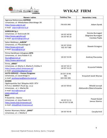 WYKAZ FIRM Nazwa i adres Agencja Reklamowa ADPRIM Limanowa, ul. Władysława Sikorskiego 39 http://www.adprim.pl/ e-mail: [email protected] Telefon/ fax. 793 655 900 Nazwisko i imię Adam Dyrek AGROLIM Sp.J. Limanowa, ul. Kościuszki 50 http://www.agrolim.pl/ e-mail: [email protected] 18 337 40 50 18 337 85 10 Dorota Burnagiel Zbigniew Burnagiel Czesław Pajda Salon Meblowy „AJRON” Limanowa, ul. Piłsudskiego 6 http://www.ajron.pl/ e-mail: [email protected] 18 337 20 83 502 357 580 Sławek Grzegorz Firma Handlowo Usługowa APIS Limanowa, ul. Jana Pawła II 15 [email protected] http://www.apisnet.pl/ 18 337 55 95 Andrzej Pieczonka 18 337 34 17 18 337 53 25 Krzysztof Hebda 18 337 19 96 981 604 444 300 Krzysztof Jacek Wyrwa Firma „ARKA” Limanowa, ul. Marka 5, Marka 9, Krótka 4 http://www.arka2-limanowa.pl/ e-mail: [email protected] AUTO-SERVICE – Pomoc Drogowa Limanowa, ul. Łazarskiego 5 e-mail: [email protected] AVANS Ogólnopolska Sieć Sklepów AGD i RTV P.P.H.U. MARKET-PLUS Sp. z o.o Limanowa , ul. J. Marka 9A e-mail: [email protected] www.awans.pl BAJT P.Kozieł & J. Stanisz Limanowa, ul. Jana Pawła II 8 http://www.bajt.limanowa.pl/ e-mail: [email protected] Kantor Wymiany Walut „BAKS” Limanowa, ul. J. Marka 6 18 337 00 65 18 337 41 31 fax.18 337 52 08 18 337 45 45 Witold Jurczyk Aleksandra Zbierzchowska Paweł Kozieł Janusz Stanisz Cecylia Król 1 Opracował: Wydział Promocji, Kultury, Sportu i Turystyki WYKAZ FIRM BANK SPÓŁDZIELCZY W LIMANOWEJ Limanowa, ul. Rynek 7 e-mail: [email protected] http://www.bs.limanowa.pl/ 18 337 91 00 18 337 91 01 18 337 91 36 Adam Dudek Prezes Zarządu F.H.P. BARTON Limanowa, ul. Graniczna 12 http://www.barton-cnc.pl/ [email protected] 18 337 22 49 508 664 224 Bartłomiej Tąta 18 337 60 06 18 337 60 03 Jacek Kumor BIURO USŁUG ARCHITEKTONICZNYCH Limanowa, Rynek 5 e-mail: [email protected] 501 457 157 Artur Jankoś ZPHU BLACHMIX Limanowa, Stara Wieś 461 www.blachmix.pl e-mail: [email protected] 18 330 15 62 606 762 862 602 229 170 Piotr Małucha 18 337 35 53 18 337 56 30 Adriana i Janusz Kwiatkowscy 18 337 22 23 502 558 349 G.W. Dutka Krystyna Chudy „BOSS Komputer” Limanowa, Rynek 15 e-mail: [email protected] www.limanowa.net.pl 18 337 22 23 Wiesław Dutka Przedsiębiorstwo Usługowo Budowlane „BUDREM” Sp. z o.o Limanowa, ul. Jana Pawła II 44 e-mail: [email protected] http://www.budrem.limanowa.pl/ 18 337 43 42 502 324 655 inż. Józef Golonka Apteka „CENTRUM” S.j. Limanowa, ul. Rynek 2 http://www.aptekacentrum.com.pl/ e-mail: [email protected] 18 337 42 22 Jakub Tokarz Delikatesy „CENTRUM” Limanowa, ul. Z. Augusta 6 18 337 57 04 PPHU „BESKID” Limanowa, ul. Rzeczna 11 e-mail: [email protected] S.W. „BOBAS” Limanowa, Rynek 11 Pasaż Handlowo-Usługowy „BOSS Centrum” FHU Grażyna i Wiesław Dutka, Krystyna Chudy Limanowa, ul. Rynek 15 e-mail: [email protected] 2 Opracował: Wydział Promocji, Kultury, Sportu i Turystyki WYKAZ FIRM Firma Handlowo – Usługowa „CENTRUM OGRODNICZE” Limanowa, ul. Kościuszki 7 e-mail: [email protected] 18 337 13 75 CENTRUM UBEZPIECZENIOWO-FINANSOWE Limanowa, ul. M. B. Bolesnej 2 www.ubezpieczenia.limanowa.pl e-mail: [email protected] 18 337 25 91 698 814 079 „DEJW” Systemy Parkingowe Łososina Górna 91. 34-651 Limanowa 3 http://www.dejw.pl/ [email protected] Stacja Kontroli Pojazdów DIAGNOSTYKA-MECHANIKA AUTO Ślazyk ul. Krakowska 42 http://www.autoslazyk.pl/ [email protected] AGENCJA UBEZPIECZENIOWA DORATEX Limanowa, ul. Jana Pawła II 44 mail: [email protected] http://www.doratex.pl/ 18 337 12 68 fax. 18 337 12 68 18 337 85 95 504 202 900 Czesław Chaiński Bartłomiej Kądziołka Dawid Biernat Ślazyk Lucyna Ślazyk Józef 18 337 01 23 541 74 71 Zbigniew Szewczyk Firma Handlowa „DROŻDŻ – DROŻDŻ” Sp. j. ul. M.B.Bolesnej 15 18 337 00 86 18 337 45 04 Andrzej Drożdż Maciej Drożdż DUDEK MAREK AGENCJA FOTOGRAFICZNO-REKLAMOWA Limanowa, ul. Jana Pawła II 8 [email protected] 18 337 14 24 Marek Dudek Firma Handlowo – Usługowa „EDEN” ul. Kościuszki 6 18 337 44 22 697 580 111 Kroczek Anna Firma „EFEKT” ul. J. Marka 18 http://www.efekt.limanowa.pl/ e-mail: [email protected] 501 674 964 Tomasz Sajdak F.P.H.U. EKOPROMET Limanowa, ul. Paderewskiego 25 34-603 Ujanowice 52 [email protected] http://www.ekopromet.com/pl/ 18 337 16 40 18 333 40 08 18 333 47 64 510 122 810 Kazimierz Wojtas 3 Opracował: Wydział Promocji, Kultury, Sportu i Turystyki WYKAZ FIRM ELECTRICAL Zakład Elektroinstalacyjny I Usługi Budowlane Wilhelm Mrożek Stara Wieś 685 http://www.elektrical.pl/ [email protected] 18 337 09 00 18 337 04 85 18 337 04 87 Wilhelm Mrożek 18 337 45 12 Jarosława Możdżeń Paweł Woźniak Wojciech Urban Krzysztof Oleksiak 18 337 62 25 604 785 607 Józef Matras "EMI" Gabinet Kosmetyczny Limanowa, ul. J. Marka 20 www.salon-emi.pl e-mail: [email protected] 18 337 56 79 Beata Musiał Usługi Projektowo- Budowlane „EMIKA” Limanowa, ul. Leśna 84 e-mail: [email protected] 793 776 876 inż. Krzysztof Pietrzak Zakład Usługowo–Produkcyjny „EMITER” Sp. J. 34-600 Limanowa ul. Skrudlak 3 e-mail: [email protected] http://www.emiter.com/pl/ 18 337 62 71 18 337 00 90 18 337 00 91 18 337 00 93 Stanisław Bieda Piotr Lis 18 337 60 72 Jacek Ryś „ELKOMP” Spółka Jawna Limanowa, ul. Jana Pawła II 15 e-mail: [email protected] www.elkomp.pl Firma Produkcyjno –Usługowo-Handlowa „EMBRUK” Młynne 251; 34-601 Limanowa 3 http://www.embruk.pl/ e-mail: [email protected] PPHU "ERJOT" Limanowa, ul. Tarnowska 12 [email protected] FOTO –NATANEK Zakład i Sklep Fotograficzny Limanowa, ul. Kilińskiego 20 http://www.fotonatanek.pl/ email: [email protected] 18 337 35 36 602 551 552 Barbara i Franciszek Natanek 4 Opracował: Wydział Promocji, Kultury, Sportu i Turystyki WYKAZ FIRM Hurtownia Spożywcza „FREMAR” Limanowa, ul. Piłsudskiego 72 e-mail: [email protected] http://chemiagospodarcza-malopolskie.pl/ Sklep Sportowy „GOL” Limanowa, ul. J. Marka 