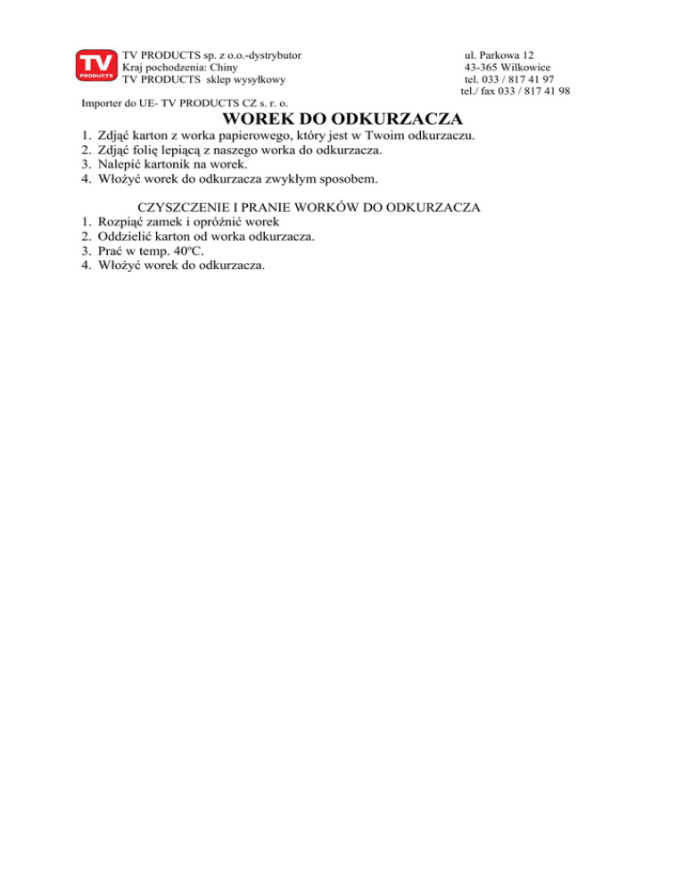 TV PRODUCTS sp. z o.o.-dystrybutor Kraj pochodzenia: Chiny TV PRODUCTS sklep wysyłkowy ul. Parkowa 12 43-365 Wilkowice tel. 033 / 817 41 97 tel./ fax 033 / 817 41 98 Importer do UE- TV PRODUCTS CZ s. r. o. WOREK DO ODKURZACZA 1. 2. 3. 4. Zdjąć karton z worka papierowego, który jest w Twoim odkurzaczu. Zdjąć folię lepiącą z naszego worka do odkurzacza. Nalepić kartonik na worek. Włożyć worek do odkurzacza zwykłym sposobem. 1. 2. 3. 4. CZYSZCZENIE I PRANIE WORKÓW DO ODKURZACZA Rozpiąć zamek i opróżnić worek Oddzielić karton od worka odkurzacza. Prać w temp. 40oC. Włożyć worek do odkurzacza.