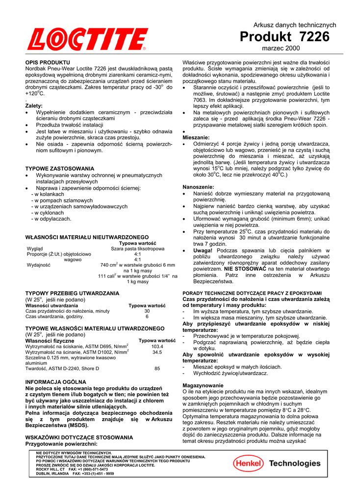 Arkusz danych technicznych Produkt 7226 marzec 2000 OPIS PRODUKTU Nordbak Pneu-Wear Loctite 7226 jest dwuskładnikową pastą epoksydową wypełnioną drobnymi ziarenkami ceramicz-nymi, przeznaczoną do zabezpieczania urządzeń przed ścieraniem drobnymi cząsteczkami. Zakres temperatur pracy od -30o do o +120 C. . Zalety: • Wypełnienie dodatkiem ceramicznym - przeciwdziała ścieraniu drobnymi cząsteczkami • Przedłuża trwałość instalacji • Jest łatwe w mieszaniu i użytkowaniu - szybko odnawia zużyte powierzchnie, skraca czas przestoju. • Nie osiada - zapewnia odporność ścierną powierzchniom sufitowym i pionowym. TYPOWE ZASTOSOWANIA • Wykonywanie warstwy ochronnej w pneumatycznych instalacjach przesyłowych • Naprawa i zapewnienie odporności ściernej: - w kolankach - w pompach szlamowych - w urządzeniach samowyładowawczych - w cyklonach - w odpylaczach. Właściwe przygotowanie powierzchni jest ważne dla trwałości produktu. Ścisłe wymagania zmieniają się w zależności od dokładności wykonania, spodziewanego okresu użytkowania i początkowego stanu materiału. • Starannie oczyścić i przeszlifować powierzchnie (jeśli to możliwe, śrutować) a następnie zmyć produktem Loctite 7063. Im dokładniejsze przygotowanie powierzchni, tym lepszy efekt aplikacji. • Na metalowych powierzchniach pionowych i sufitowych zaleca się - przed aplikacją środka Pneu-Wear 7226 przyspawanie metalowej siatki szeregiem krótkich spoin. • Mieszanie: • Odmierzyć 4 porcje żywicy i jedną porcję utwardzacza, objętościowo lub wagowo, przenieść je na czystą i suchą powierzchnię do mieszania i mieszać, aż uzyskają jednolitą barwę. (Jeśli temperatura żywicy i utwardzacza wynosi 15oC lub mniej, należy podgrzać tylko żywicę do około 30oC, lecz nie przekroczyć 40oC.) Nanoszenie: • Nanieść dobrze wymieszany materiał na przygotowaną powierzchnię. • Najpierw nanieść bardzo cienką warstwę, aby uzyskać suchą powierzchnię i uniknąć uwięzienia powietrza. • Uformować wymaganą grubość (minimum 6mm); unikać uwięzienia w niej powietrza. o • Przy temperaturze 25 C. czas przydatności materiału do WŁASNOŚCI MATERIAŁU NIEUTWARDZONEGO nałożenia wynosi 30 minut a utwardzanie funkcjonalne Typowa wartość trwa 7 godzin. Wygląd Szara pasta tiksotropowa • Uwaga! Podczas spawania lub cięcia palnikiem w Proporcje (Ż:Ut.) objętościowo 4:1 pobliżu utwardzonego związku należy używać wagowo 4:1 2 zatwierdzony równoprężny aparat oddechowy zasilany Wydajność 740 cm w warstwie grubości 6 mm powietrzem. NIE STOSOWAĆ na ten materiał otwartego na 1 kg masy 2 płomienia. Patrz inne ostrzeżenia w Arkuszu 111 cali w warstwie grubości 1/4” na Bezpieczeństwa. 1 kg masy TYPOWY PRZEBIEG UTWARDZANIA (W 25o, jeśli nie podano) PORADY TECHNICZNE DOTYCZĄCE PRACY Z EPOKSYDAMI Własności utwardzania Czas przydatności do nałożenia, minuty Czas utwardzania, godziny. Typowa wartość 30 6 TYPOWE WŁASNOŚCI MATERIAŁU UTWARDZONEGO (W 25o, jeśli nie podano) Typowa wartość Własności fizyczne 2 Wytrzymałość na ściskanie, ASTM D695, N/mm 2 Wytrzymałość na ścinanie, ASTM D1002, N/mm Szczelina 0.125 mm, wytrawione kwasowo aluminium Twardość, ASTM D-2240, Shore D 103.4 34.5 85 INFORMACJA OGÓLNA Nie poleca się stosowania tego produktu do urządzeń z czystym tlenem i/lub bogatych w tlen; nie powinien też być używany jako uszczelniacz do instalacji z chlorem i innych materiałów silnie utleniających. Pełna informacja dotycząca bezpiecznego obchodzenia się z tym produktem znajduje się w Arkuszu Bezpieczeństwa (MSDS). WSKAZÓWKI DOTYCZĄCE STOSOWANIA Przygotowanie powierzchni: Czas przydatności do nałożenia i czas utwardzania zależą od temperatury i masy produktu: Im wyższa temperatura, tym szybsze utwardzanie. Im większa masa mieszaniny, tym szybsze utwardzanie. Aby przyśpieszyć utwardzanie epoksydów w niskiej temperaturze: Przechowywać je w temperaturze pokojowej. Podgrzać naprawianą powierzchnię, aż będzie ciepła w dotyku. Aby spowolnić utwardzanie epoksydów w wysokiej temperaturze: Mieszać epoksyd w małych ilościach. Wychłodzić żywicę/utwardzacz. Magazynowanie O ile na etykiecie produktu nie ma innych wskazań, idealnym sposobem jego przechowywania będzie pozostawienie go w zamkniętych pojemnikach w chłodnym i suchym pomieszczeniu w temperaturze pomiędzy 8°C a 28°C. Optymalna temperatura magazynowania to dolna połowa tego zakresu. Resztek materiału nie należy umieszczać z powrotem w jego oryginalnym pojemniku, gdyż mogłoby dojść do zanieczyszczenia produktu. Dalsze informacje na temat okresu przydatności produktu można uzyskać NIE DOTYCZY WYMOGÓW TECHNICZNYCH. PRZYTOCZONE TUTAJ DANE TECHNICZNE MAJĄ JEDYNIE SŁUŻYĆ JAKO PUNKTY ODNIESIENIA. PO POMOC I WSKAZÓWKI DOTYCZĄCE WARUNKÓW TECHNICZNYCH TEGO PRODUKTU PROSZĘ ZWRÓCIĆ SIĘ DO DZIAŁU JAKOŚCI KORPORACJI LOCTITE. ROCKY HILL, CT FAX: +1 (860)-571-5473 DUBLIN, IRLANDIA FAX: +353-(1)-451 - 9959 TDS Loctite®7226 marzec 2000 w lokalnym ośrodku obsługi technicznej. Zakresy danych Przytoczone tutaj dane mogą służyć jako wartości typowe i/lub jako ich zakres. Wartości oparte są na danych uzyskanych z aktualnie przeprowadzonych badań i są okresowo weryfikowane. Uwaga Materiał zawarty w niniejszym opracowaniu został przygotowany w oparciu o najlepszą wiedzę i służy jedynie celom informacyjnym. Loctite nie ponosi odpowiedzialności za wybraną przez użytkownika metodę lub sposób jej zastosowania, a w konsekwencji za uzyskane przez niego rezultaty. Sprawą użytkownika jest także podjęcie odpowiednich środków ostrożności, aby uniknąć ew. ryzyka dla produkcji i osób, wiążącego się z użytkowaniem produktu. Korporacja Loctite nie uwzględnia żadnych roszczeń związanych z uszkodzeniem, zniszczeniem pro-dukcji czy utratą zysku. Stanowisko to wynika z faktu, że Kor-poracja Loctite n