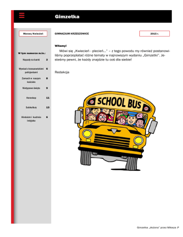 Gimzetka GIMNAZJUM KRZESZOWICE Marzec/Kwiecień 2015 r. Witamy! W tym numerze m.in.: Napady na banki 2 Wywiad z krzeszowickimi 6 policjantami Zamach w naszym kościele 8 Nietypowe święta 9 Horoskop 11 Subkultury 13 Hinduizm i kuchnia indyjska 6 Mówi się „Kwiecień - plecień…” – z tego powodu my również postanowiliśmy poprzeplatać różne tematy w najnowszym wydaniu „Gimzetki”. Jesteśmy pewni, że każdy znajdzie tu coś dla siebie! Redakcja Gimzetka „złożona” przez Miłosza :P W poszukiwaniu bogactwa Obecnie większość pieniędzy przechowuje się na kontach bankowych. Jednak jeszcze całkiem niedawno trzymano je w skarbcach. Stwarzało to idealne warunki do kradzieży... 10. Loomis Fargo & Company, USA (1997): dwa napady po 18 milionów dolarów. Rok 1997 był bardzo trudny dla Loomis Fargo & Company – firmy z branży usług obsługi gotówki, zajmującej się przewozem gotówki samochodami pancernymi. Najpierw w marcu ukradziono im 18,8 miliona dolarów, by w październiku ukraść 17,3 miliona dolarów. W obu przypadkach rabusie zostali schwytani i odzyskano około 95% skradzionej gotówki. 9. Dunbar Armored, Los Angeles, USA (1997): 19 milionów dolarów. Napad na Dunbar Armored to największy rabunek gotówki, jaki miał miejsce w Stanach Zjednoczonych. Rabunek z 1997 roku został zaplanowany przez Allena Pace, który pracował w Dunbar jako regionalny inspektor bezpieczeństwa. Podczas swojej pracy Allen miał czas na fotografowanie zajezdni samochodów pancernych oraz zaplanowanie całego napadu. Zwerbował kilku przyjaciół z dzieciństwa, by 12 września 1997 roku przeprowadzić napad w trakcie przewożenia dużych ilości pieniędzy. 8. Northern Bank, Belfast, Irlandia Północna (2004): 50 milionów dolarów. 20 grudnia 2004 roku. Jeden z największych napadów na banki w historii Wielkiej Brytanii. Noc przed napadem rabusie odwiedzili domy dwóch pracowników banku oraz wzięli za zakładników ich rodziny. Pracownicy banku zostali pouczeni, że następnego dnia mają udać się do pracy jak gdyby nigdy nic i pomóc obrabować bank. Chociaż jedna osoba została skazana za pranie pieniędzy pochodzących z napadu, sprawa dalej pozostaje nierozwiązana. 7. Banco Central, Fortaleza, Brazylia (2006): 71 milionów dolarów. Złodzieje ukradli ponad 71 milionów dolarów dzięki podziemnemu tunelowi o długości około 80 metrów. W jaki sposób udało im się wykopać w okolicy banku tak długi tunel bez przyłapania na gorącym uczynku? Rabusie podawali się za pracowników firmy zajmującej się projektowaniem krajobrazu. To wystarczyło, by wykopać tunel, pozbywać się na bieżąco ziemi, podłączyć oświetlenie w tunelu a nawet klimatyzację dla komfortu pracy. Kopanie tunelu zajęło około 3 miesięcy. 6. Wielki napad na pociąg, Anglia (1963): 74 miliony dolarów. Nie jest to typowy napad na bank, bowiem rabunku dokonano już na etapie przesyłki gotówki. W 1963 roku szesnastu złodziei zatrzymało pociąg o nazwie The Night Flyer – był to pociąg pocztowy przewożący papiery wartościowe oraz pieniądze wysłane do wielu banków w Londynie. Napadu dokonał Bruce Reynolds wraz ze wspólnikami. Rabusie wsiedli do pociągu po tym jak ten zatrzymał się na czerwonym świetle - które paliło się po manipulacji sygnałami liniowymi - następnie zaatakowali pracowników i skradli łup dużej wartości. 5. Securitas Depot, hrabstwo Kent, Anglia (2006): 92,5 miliona dolarów. Uważa się, ze jest to największy rabunek czystej gotówki w całej historii Wielkiej Brytanii. Rabunek ponad 90 milionów dolarów z Securitas Depot odbył się w hrabstwie Kent w Anglii i trwał kilka godzin. Wszystko zaczęło się, gdy grupa mężczyzn porwała menadżera, zagroziła jego rodzinie a następnie związała kilkunastu pracowników Securitas Cash Management Ltd. Kradzież nie uszła rabusiom na sucho i wkrótce wszyscy zaangażowani w sprawę zostali schwytani i skazani. Szacuje się, że policja wydała na dochodzenie około 6 milionów funtów. 4. Knightsbridge Security Deposit, Londyn (1987): 200 milionów dolarów. Knightsbridge Security Deposit był znany z tego, że w jego skrytkach spoczywają pieniądze, biżuteria i inne kosztowności należące do znanych osób. Taka sława przykuła uwagę Valerio Viccei – syna adwokata, który przyjechał do Londynu w 1986 roku z rodzinnych Włoszech, gdzie był ścigany za około 50 napadów rabunkowych. W dniu napadu Valerio wraz ze wspólnikiem weszli do banku z zamiarem wynajęcia skrytek. Szybko sterroryzowali strażników i przejęli kontrolę nad bankiem: nie wpuszczając klientów (tłumacząc chwilowym zamknięciem depozytów) a tylko dodatkowych wspólników. Równo miesiąc po napadzie, 12 sierpnia 1987 roku, w serii skoordynowanych nalotów policja aresztowała wspólników Viccei'a, a potem jego samego. 3. Brytyjski Bank na Bliskim Wschodzie (1976): 210 milionów dolarów. 20 stycznia 1976 roku grupa związana z Jaserem Arafatem Organizacja Wyzwolenia Palestyny wykorzystała chaos wojny domowej w Libanie do okradzenia Brytyjskiego Banku na Bliskim Wschodzie działającego w Bejrucie. Zamiast użycia sprytu i umiejętności złodzieje posłużyli się brutalną siłą i materiałami wybuchowymi, którymi uzyskali dostęp do banku przez ścianę współdzieloną z kościołem katolickim. Korzystając z pomocy korsykańskich ślusarzy, grupa włamywaczy dostała się do skarbca, z którego skradła sztabki złota, gotówkę, klejnoty oraz akcje. 2. Bank Dar Es Salaam w Bagdadzie (2007): 282 miliony dolarów. Od kiedy w 2003 roku w Iraku rozpoczęła się wojna, miało tu miejsce wiele mniejszych lub większych napadów na banki. Jednym z największych jest napad na prywatny bank Dar Es Salaam w Bagdadzie, który miał miejsce 11 lipca 2007 roku. Ponad ćwierć miliarda dolarów zostało skradzione przez trzech strażników, których zadaniem było pilnowanie skarbca przez noc. Kiedy rano do