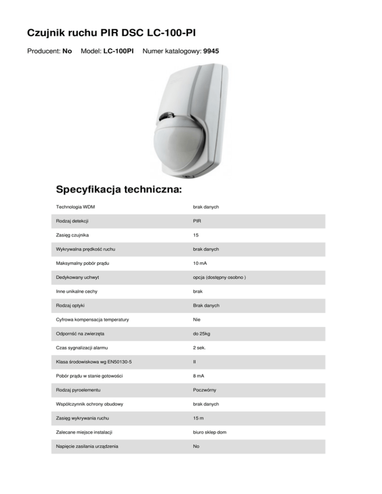 Czujnik ruchu PIR DSC LC-100-PI Producent: No Model: LC-100PI Numer katalogowy: 9945 Specyfikacja techniczna: Technologia WDM brak danych Rodzaj detekcji PIR Zasięg czujnika 15 Wykrywalna prędkość ruchu brak danych Maksymalny pobór prądu 10 mA Dedykowany uchwyt opcja (dostępny osobno ) Inne unikalne cechy brak Rodzaj optyki Brak danych Cyfrowa kompensacja temperatury Nie Odpornść na zwierzęta do 25kg Czas sygnalizacji alarmu 2 sek. Klasa środowiskowa wg EN50130-5 II Pobór prądu w stanie gotowości 8 mA Rodzaj pyroelementu Poczwórny Współczynnik ochrony obudowy brak danych Zasięg wykrywania ruchu 15 m Zalecane miejsce instalacji biuro sklep dom Napięcie zasilania urządzenia No Funkcja antymaskingu Nie Temperatura pracy -10°C ~ +50°C Zalecana wysokość montażu 2,1...2,7m Gwarancja 24 miesiące Prędkość transmisji brak danych Link do strony producenta brak danych