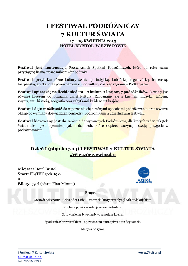 I FESTIWAL PODRÓŻNICZY 7 KULTUR ŚWIATA 17 – 19 KWIETNIA 2015 HOTEL BRISTOL W RZESZOWIE Festiwal jest kontynuacją Rzeszowskich Spotkań Podróżniczych, które od roku czasu przyciągają liczną rzesze miłośników podróży. Festiwal przybliża różne kultury świata tj. indyjską, kubańską, argentyńską, francuską, hiszpańską, grecką oraz porównaniem ich do kultury naszego regionu – Podkarpacia. Festiwal opiera się na liczbie siedem - 7 kultur, 7 krajów, 7 podróżników. Liczba 7 jest również kluczem do poznania danej kultury. Zapoznamy się z kuchnią, muzyką, tańcem, zwyczajami, historią, geografią oraz zabytkami każdego z 7 krajów. Festiwal daje możliwość do zapoznania się z różnymi sposobami podróżowania oraz stwarza okazję do wymiany doświadczeń pomiędzy podróżnikami a uczestnikami festiwalu. Festiwal kierowany jest do zarówno do wytrawnych Podróżników, dla których żaden zakątek świata nie jest tajemnicą, jak i do osób, które dopiero zaczynają swoją przygodę z podróżowaniem. Dzień I (piątek 17.04) I FESTIWAL 7 KULTUR ŚWIATA „Wieczór z gwiazdą: Miejsce: Hotel Bristol Start: PIĄTEK godz.19.0 0 Bilety: 59 zł (oferta First Minute) Program: Gwiazda wieczoru: Aleksander Doba – człowiek, który przepłynął Atlantyk kajakiem. Kuchnia polska – kolacja w formie bufetu. Gotowanie na żywo na żywo z szefem kuchni. Spotkanie z browarnikiem - opowieści na temat piwa oraz degustacja. Muzyka na żywo. I Festiwal 7 Kultur Świata [email protected] tel. 796 168 998 www.7kultur.pl Dzień II (sobota 18.04.2015) - I FESTIWAL 7 KULTUR ŚWIATA „W poszukiwaniu egzotyki” Miejsce: Hotel Bristol Start: 14:00 Bilety: 15 zł (Oferta First Minute) Program: Godz. 14.00 Godz. 14.30 Godz. 15.30 Godz. 16.15 Godz. 17.15 Godz. 18.00 Godz. 19.00 Godz. 20.00 Godz. 20.45 Rozpoczęcie II dnia festiwalu. I prelekcja - „ NIEPRAWDOPODNIE INDIE” Pokaz tańca brzucha II prelekcja: „REWOLUCYJNA KUBA” Pokaz salsy III prelekcja: Nomadzi: wielka wędrówka Kirgistan- Afganistam IV prelekcja: ARGENTYNA – ZMIERZCH DAWNEJ POTĘGI” Pokaz tanga argetyńskiego Zakończenie II dnia festiwalu Dzień III (niedziela 18.04) - I FESTIWAL 7 KULTUR ŚWIATA „Zapomniana Europa” Miejsce: Hotel Bristol Start: 14:15 Bilety: 15 zł (Oferta First Minute) Program: Godz. 14.00 Godz. 14.15 Godz. 15.30 Godz. 16.15 Godz. 17.30 Godz. 18.15 Godz. 19.30 Godz. 20.30 Rozpoczęcie III dnia festiwalu I prelekcja – „HISZPANIA – SŁONECZNE POŁUDNIE” Pokaz Flamenco II prelekcja – „GRECJA – W ŚWIECIE MITÓW I LEGEND” Pokaz Zorby III prelekcja – FRANCJA – W KRAINIE SZAMPANA” Pokaz Burleski Zakończenie I Festiwalu 7 Kultur Świata *Uwaga: godziny prelekcji oraz pokazów mogą ulec niewielkim zmianą. I Festiwal 7 Kultur Świata [email protected] tel. 796 168 998 www.7kultur.pl Organizator: Agencja Turystyczna Luka-tour Łukasz Bejster Agencja Turystyczna zajmująca się obsługą biur podróży w związku z rezerwacjami hoteli, wynajmem autokarów oraz systemów tour guide oraz usługami przewodnickimi. Firma zajmuje się również organizacją eventów podróżniczych. Do tej pory zorganizowała 26 wydarzeń pod nazwą Rzeszowskie Spotkania Podróżnicze. Więcej informacji na: www.luka-tour.pl Partner główny: Your Concierge Your Concierge służy pomocą w sytuacjach życia codziennego i w spełnianiu marzeń. W każdej chwili zadba o sprawy domowe, przypomni o istotnych wydarzeniach, zorganizuje podróż, udane przyjęcie i zapewni wyjątkowy prezent dla bliskich. Concierge- osobisty konsultant - wie wszystko na temat Państwa potrzeb i koordynuje złożone zlecenia. To zaufany opiekun, który gotów jest służyć pomocą, w każdym postawionym przed nim zadaniu. Patroni honorowi: Partoni medialni: Partnerzy: Sponsorzy: I Festiwal 7 Kultur Świata [email protected] tel. 796 168 998 www.7kultur.pl