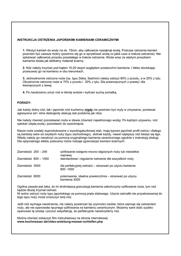 INSTRUKCJA OSTRZENIA JAPOŃSKIMI KAMIENIAMI CERAMICZNYMI 1. Włożyć kamień do wody na ok. 15min, aby całkowicie nasiąknął wodą. Podczas ostrzenia kamień powinien być zawsze mokry (powinno się go w spryskiwać wodą co jakiś czas w trakcie ostrzenia). Nie spłukiwać całkowicie proszku powstałego w trakcie ostrzenia. Woda wraz ze startym proszkiem kamienia działa jak delikatny materiał ścierny. 2. Nóż należy trzymać pod kątem 10-20 stopni względem powierzchni kamienia. I lekko dociskając przesuwać go na kamieniu w obu kierunkach. 3. Jednostronnie ostrzone noże (np. typu Deba, Sashimi) należy ostrzyć 80% z przodu, a w 20% z tyłu. Obustronnie ostrzone noże w 70% z przodu i 30% z tyłu. Dla praworęcznych z prawej i dla leworęcznych z lewej. 4. Po naostrzeniu umyć nóż w letniej wodzie i wytrzeć suchą szmatką. PORADY: Jak każdy dobry nóż, tak i japoński nóż kuchenny nigdy nie powinien być myty w zmywarce, ponieważ agresywna sól i silne detergenty atakują stal podobnie jak rdza. Nie należy również pozostawiać noża w zlewie (również napełnionego wodą). Po każdym używaniu, nóż spłukać ciepłą wodą i pozostawić do wyschnięcia. Nasze noże zostały wyprodukowane z wysokogatunkowej stali, mają typowo japoński profil ostrza i dlatego są bardziej ostre od zwykłych noży (typu zachodniego). Jednak każdy, nawet najlepszy nóż kiedyś się tępi. Wtedy należy go naostrzyć za pomocą oryginalnego kamienia ceramicznego zgodnie z instrukcją obsługi. Dla optymalnego efektu polecamy różne rodzaje (granulacje) kamieni ściernych: Ziarnistość 200 – 240 Ziarnistość 800 – 1000 szlifowanie wstępne mocno stępionych noży lub niewielkie naprawy standardowe i regularne ostrzenie dla wszystkich noży Ziarnistość 3000 dla perfekcyjnej ostrości – stosować po użyciu kamienia 800 -1000 Ziarnistość 8000 polerowanie, idealna powierzchnia – stosować po użyciu kamienia 3000 Ogólna zasada jest taka, że im drobniejszą granulacją kamienia zakończymy szlifowanie noża, tym nóż będzie dłużej trzymał ostrość. Ni wolno ostrzyć noży typu japońskiego za pomocą pręta stalowego. Użycie ostrzałki nie przystosowanej do tego typu noży może zniszczyć twój nóż. Jeśli nóż wymaga naostrzenia, nie należy powierzać tej czynności osobie, która zajmuje się ostrzeniem noży, ale nie opanowała ręcznego szlifowania na kamieniu ceramicznym. Możemy sami dość szybko opanować tę sztukę i poczuć satysfakcję, że perfekcyjnie naostrzyliśmy nóż. Można również zobaczyć film instruktażowy na stronie internetowej: www.kochmesser.de/video-anleitung-messer-schleifen.php