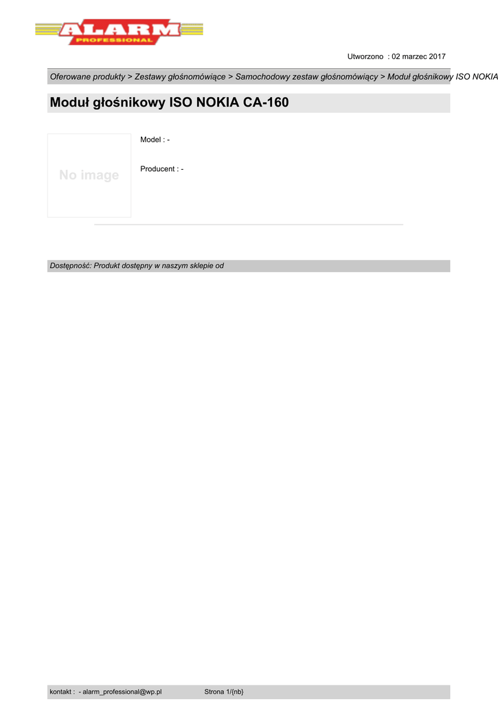 Utworzono : 02 marzec 2017 Oferowane produkty > Zestawy głośnomówiące > Samochodowy zestaw głośnomówiący > Moduł głośnikowy ISO NOKIA Moduł głośnikowy ISO NOKIA CA-160 Model : - No image Producent : - Dostępność: Produkt dostępny w naszym sklepie od kontakt : - [email protected] Strona 1/{nb}
